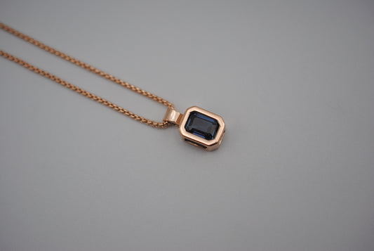 Alexandrite Necklace: Emerald Cut, Rose Gold Half Bezel, Rounded Box Chain