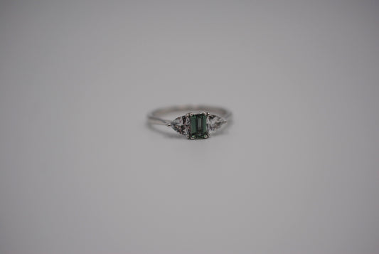 Alexandrite Ring: Emerald Cut, Trillion Sapphire Side Stones, White Gold
