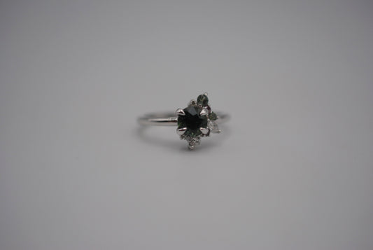 Sapphire Ring: Round Cut, with Sapphire & Diamond Cluster, 14K White Gold