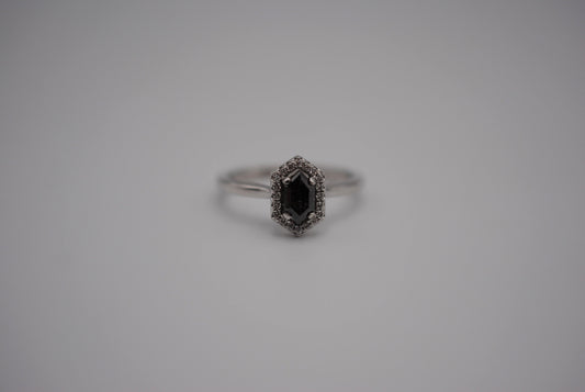 Salt and Pepper Diamond Ring: Hexagon cut, White Gold Band, Diamond Halo Setting
