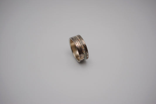 Mokume Gane Ring Band: Silver, Copper & Shibuichi, Rose Gold Inlay, 7.5mm Width