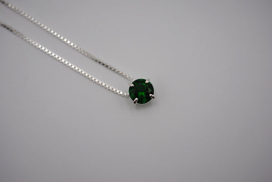 Birthstone Necklace: Round Emerald, Silver Prong Setting, Adjustable Chain