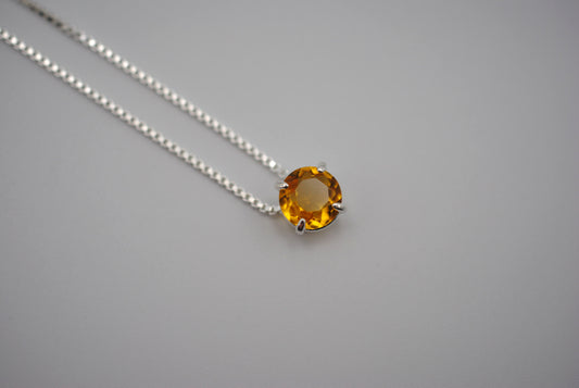 Birthstone Necklace: Round Citrine, Silver Prong Setting, Adjustable Box Chain