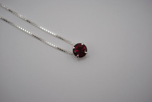 Birthstone Necklace: Round Garnet, Silver Prong Setting, Adjustable Chain