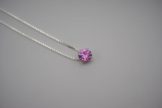Birthstone Necklace: Round Pink Tourmaline, Silver Prong Setting, Adjustable Chain