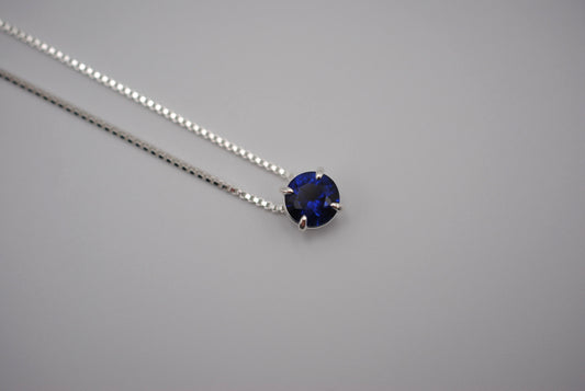 Birthstone Necklace: Round Sapphire, Silver Prong Setting, Adjustable Box Chain