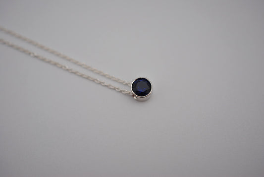 Birthstone Necklace: Round Sapphire, Silver Bezel, on Cable Chain