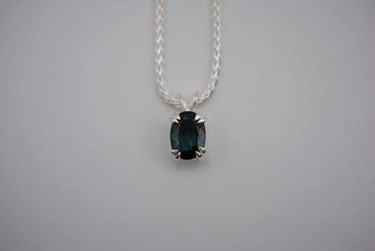 Indicolite Tourmaline Necklace: Oval Cut, Silver Basket Setting, Wheat Chain