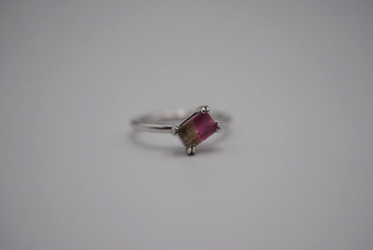 Tourmaline Ring: Emerald Cut, Offset, Silver Double Prong Setting