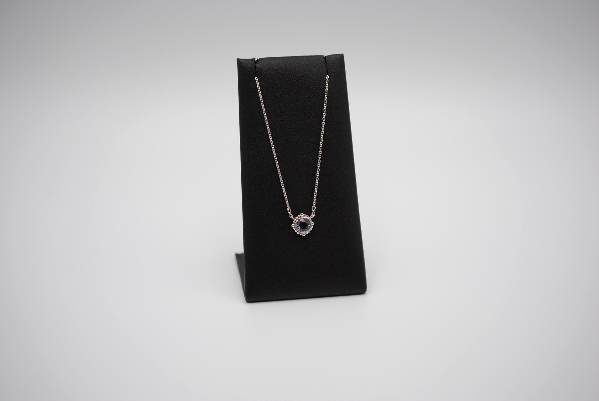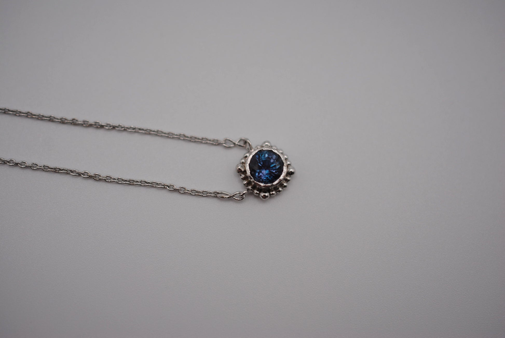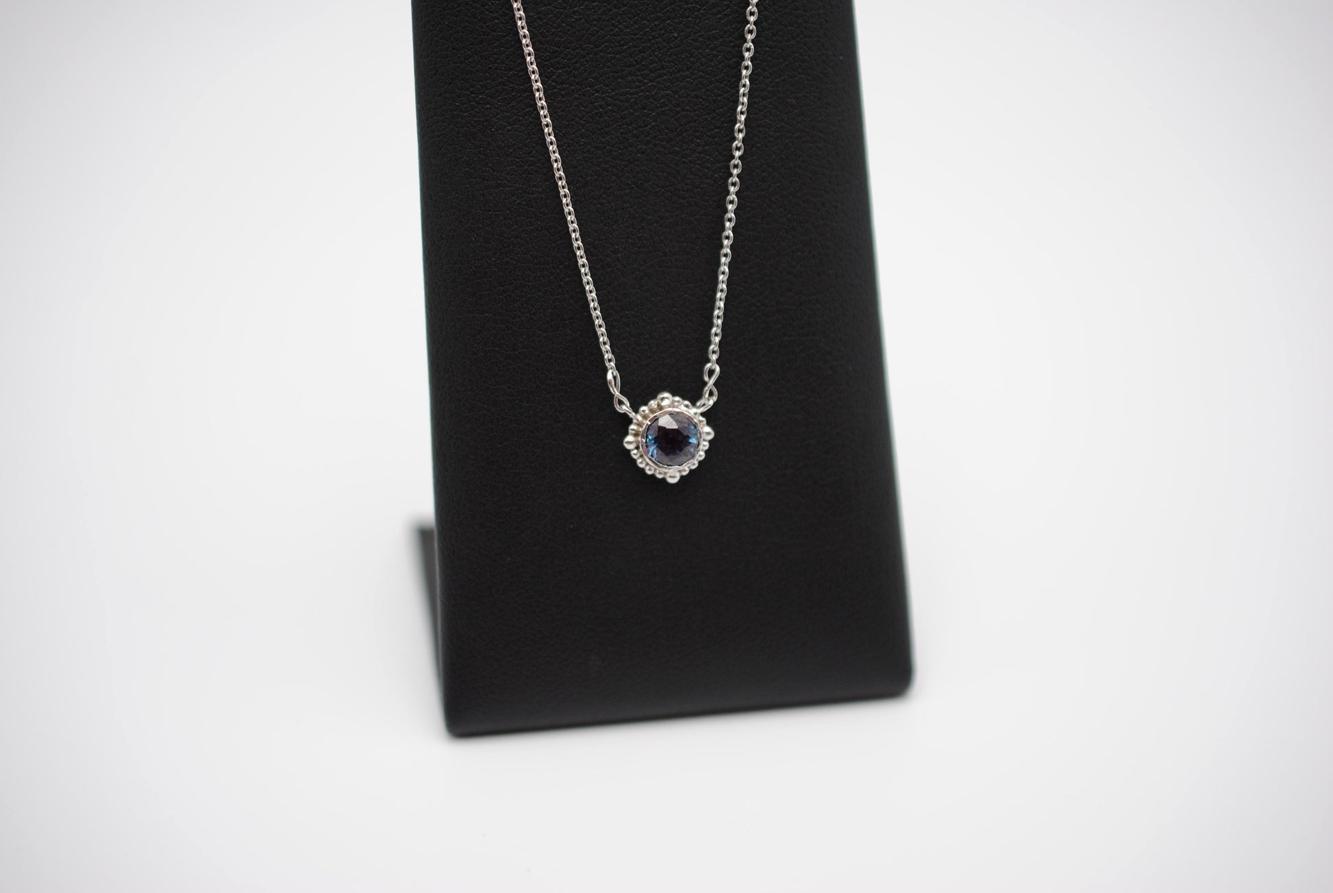 This is our Alexandrite Necklace: Round Cut, Decorative Bezel, Cable Chain.