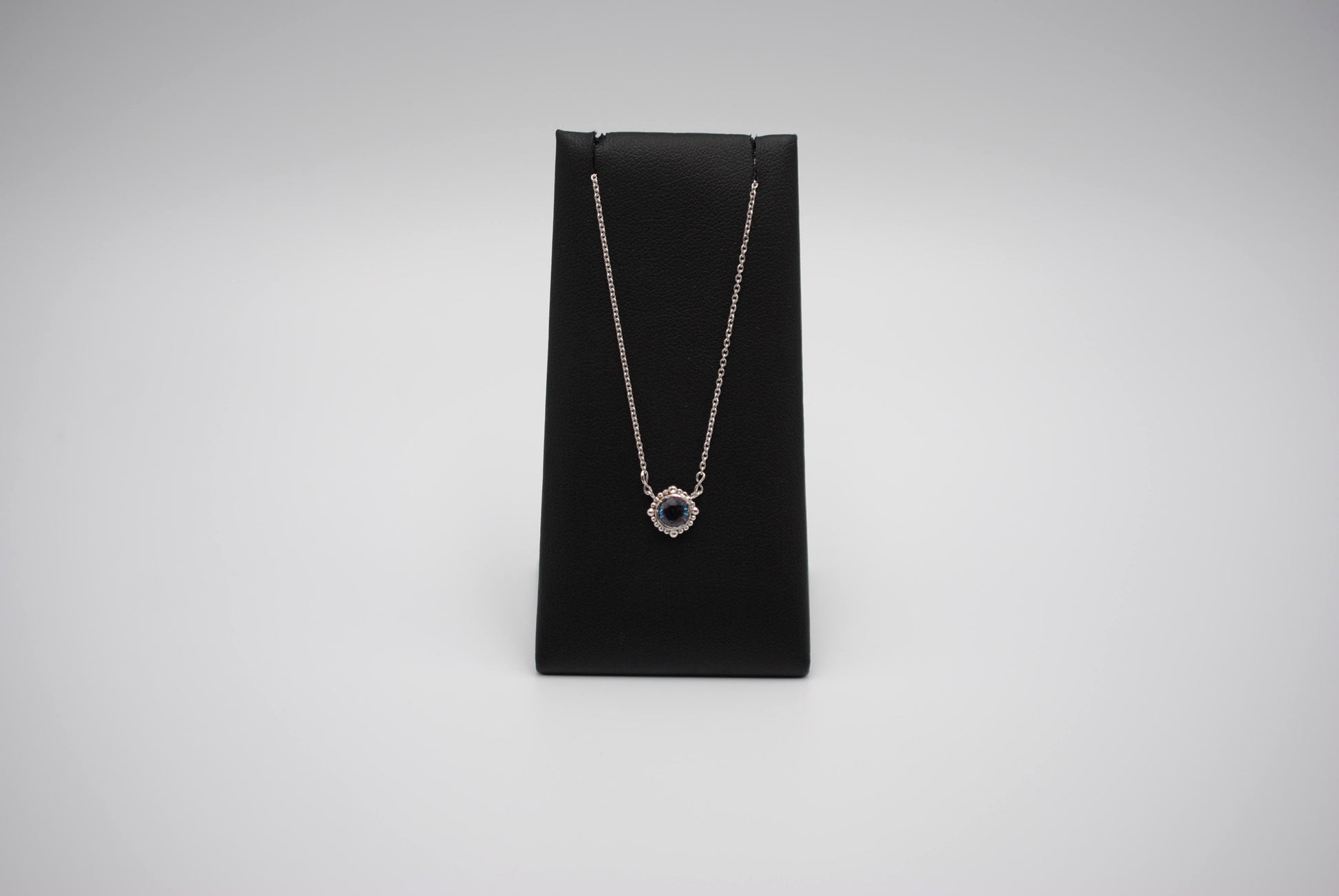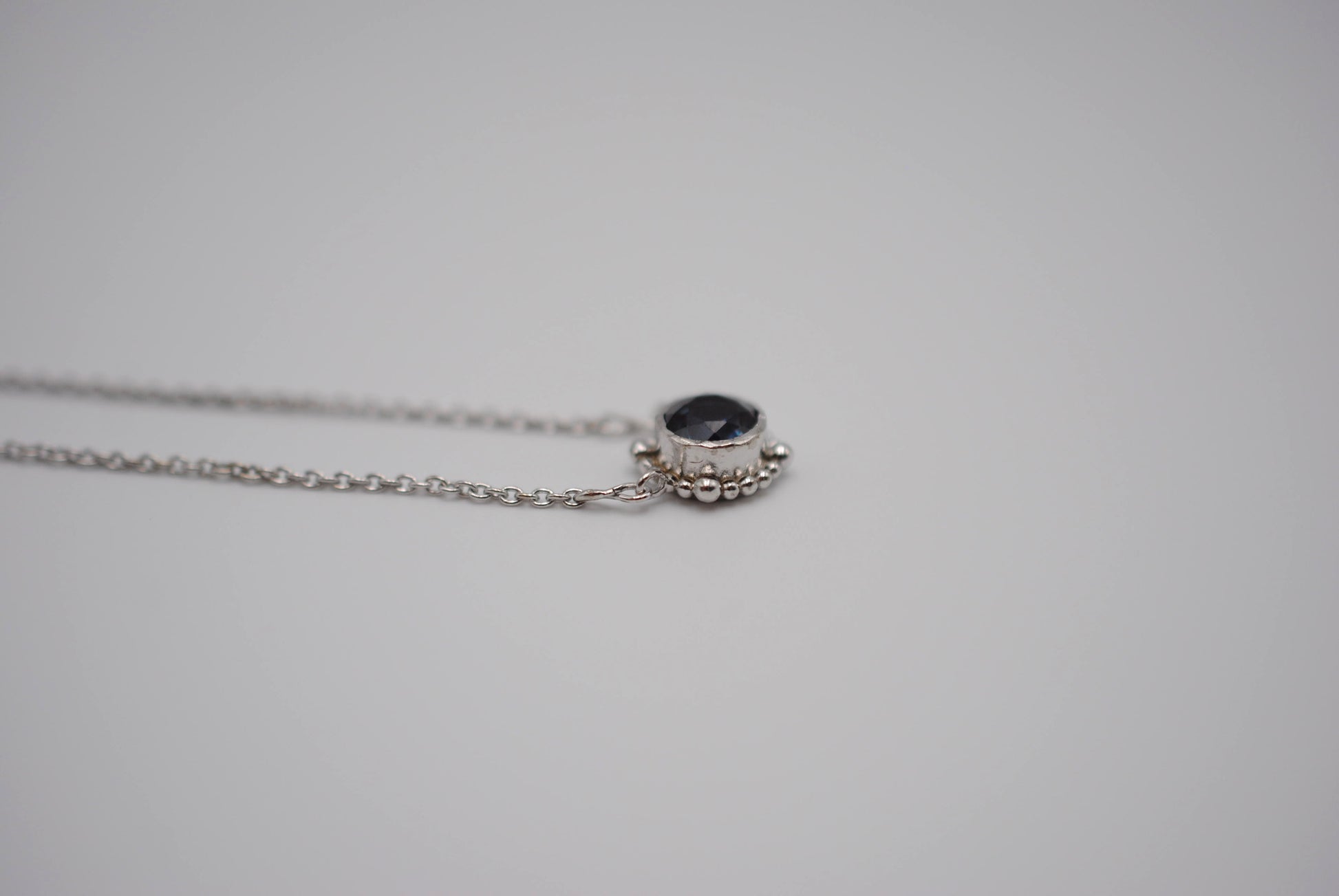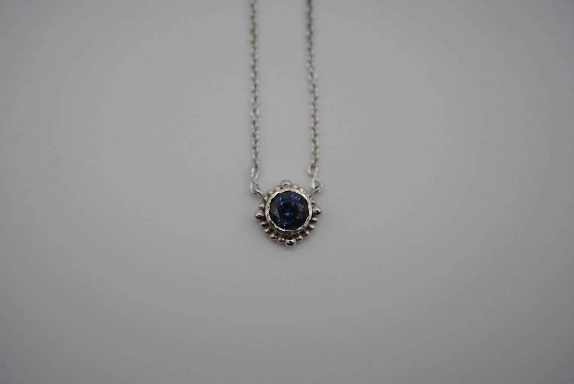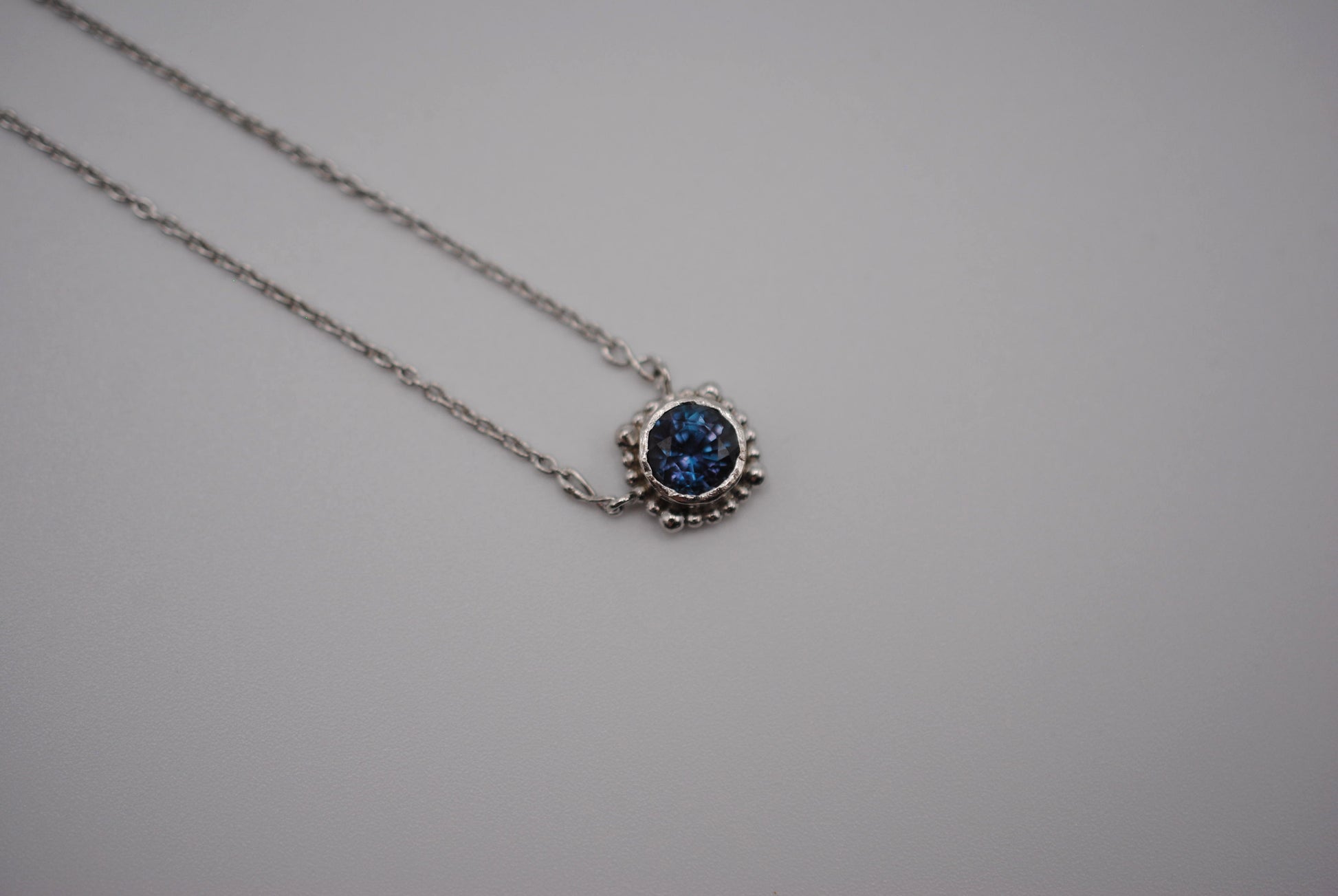This is our Alexandrite Necklace: Round Cut, Decorative Bezel, Cable Chain.