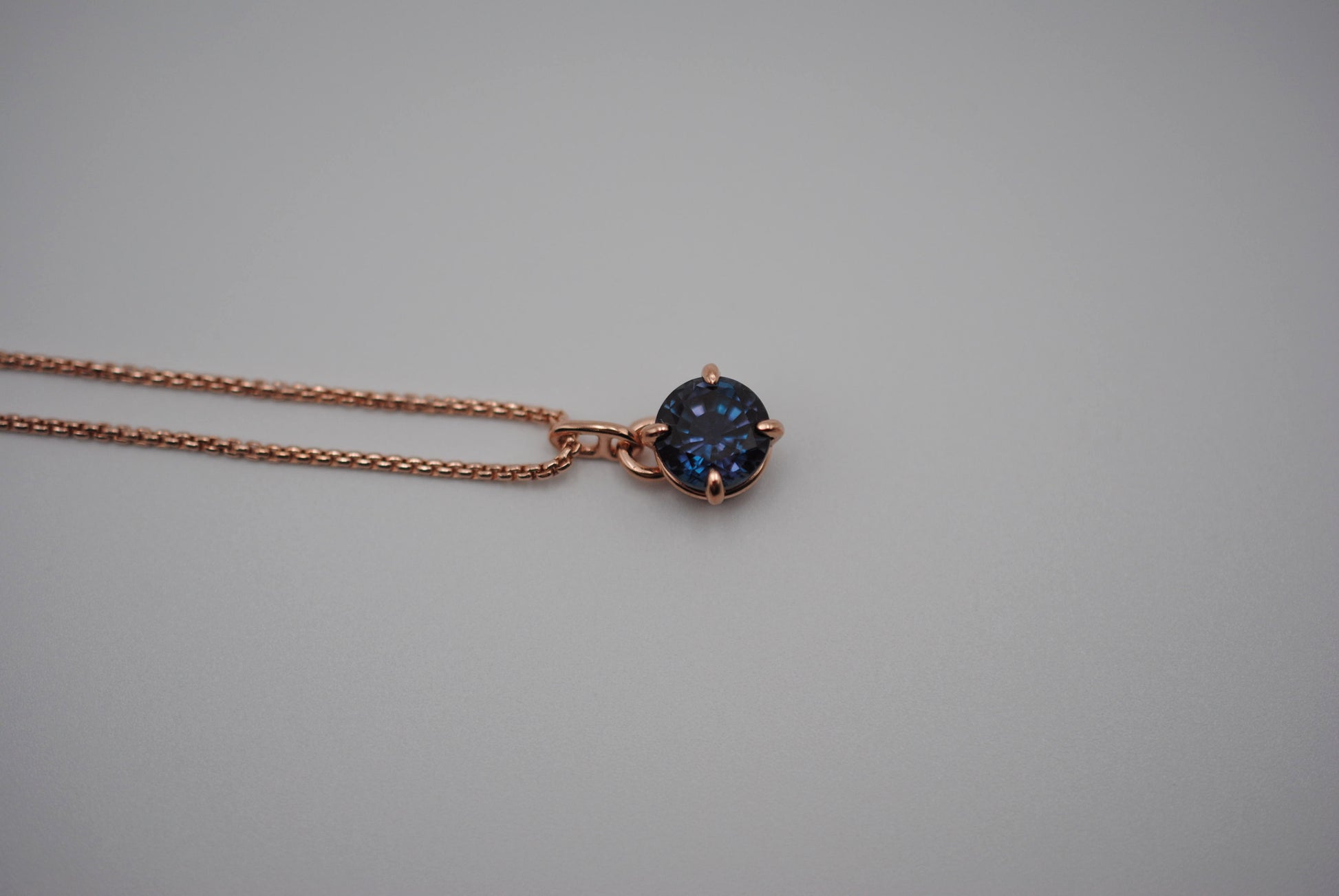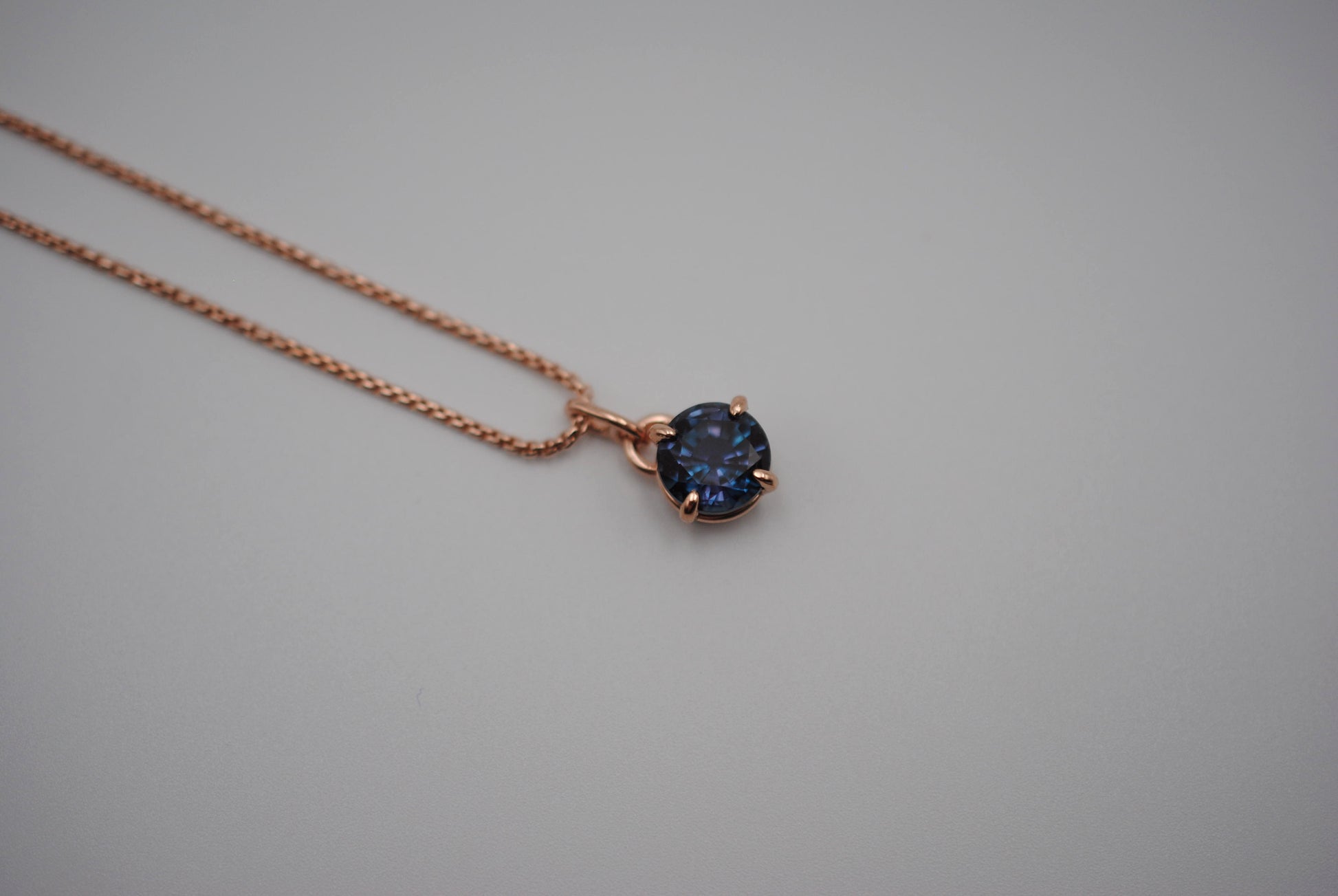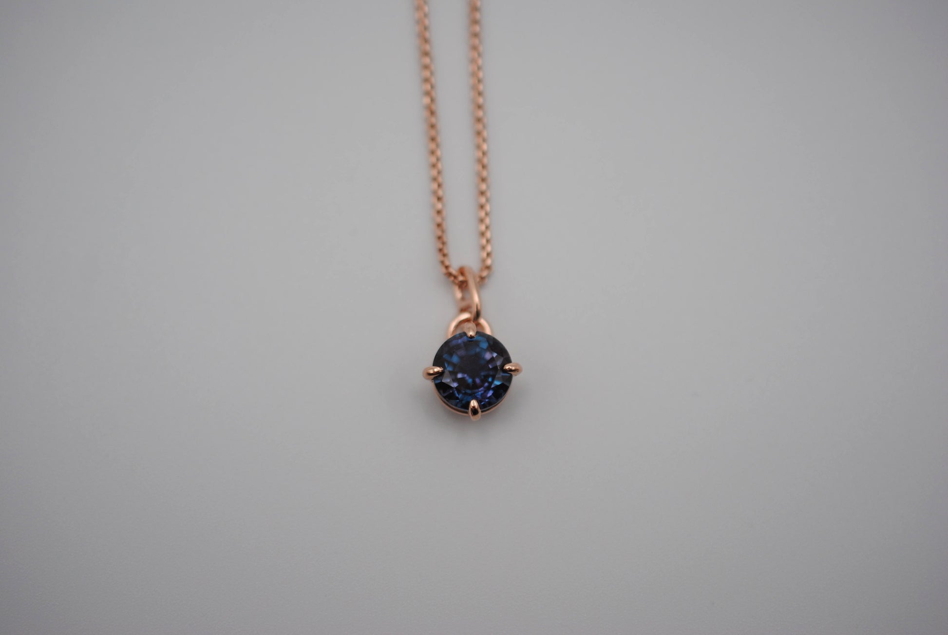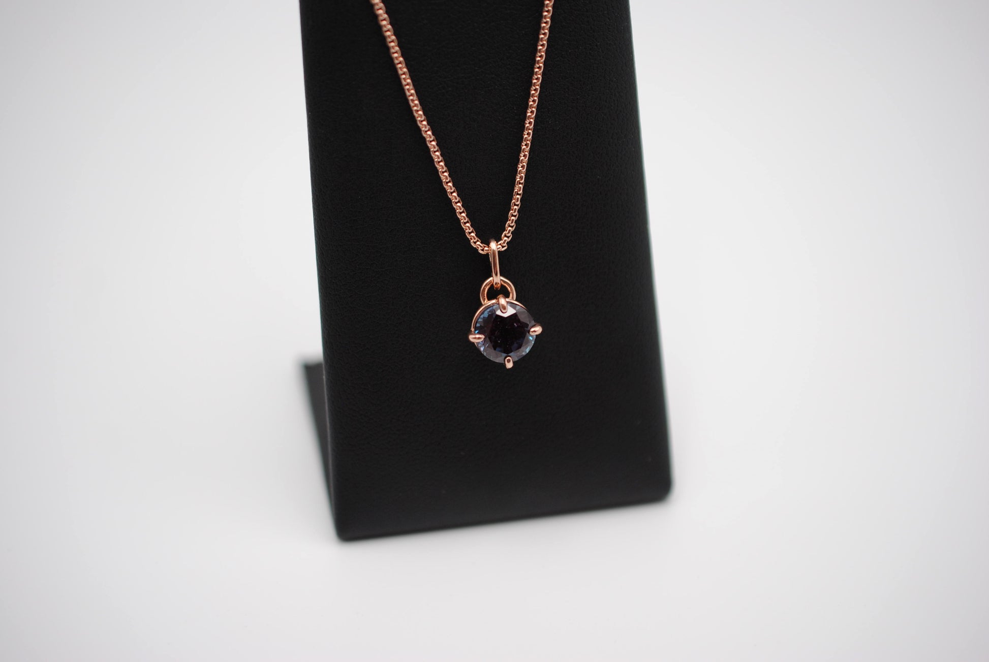 This is our Alexandrite Necklace: Round Cut, Rose Gold Prong Setting, Rose Gold Fill Rounded Box Chain.
