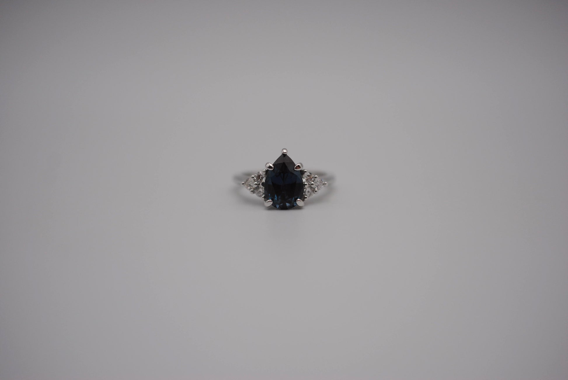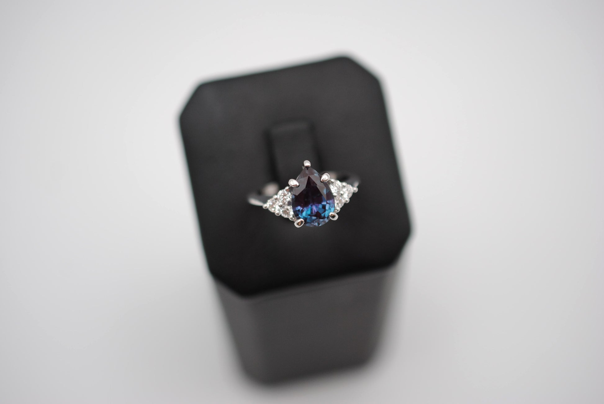 The ring features an ethically sourced lab grown pear cut 10mm x 7mm alexandrite. It's 2.28 carats.