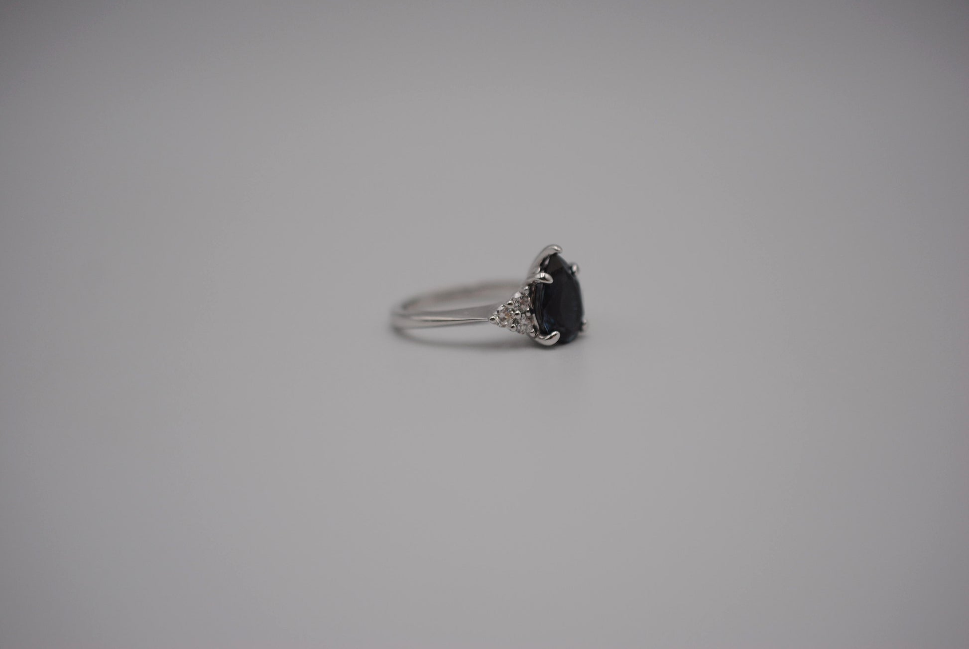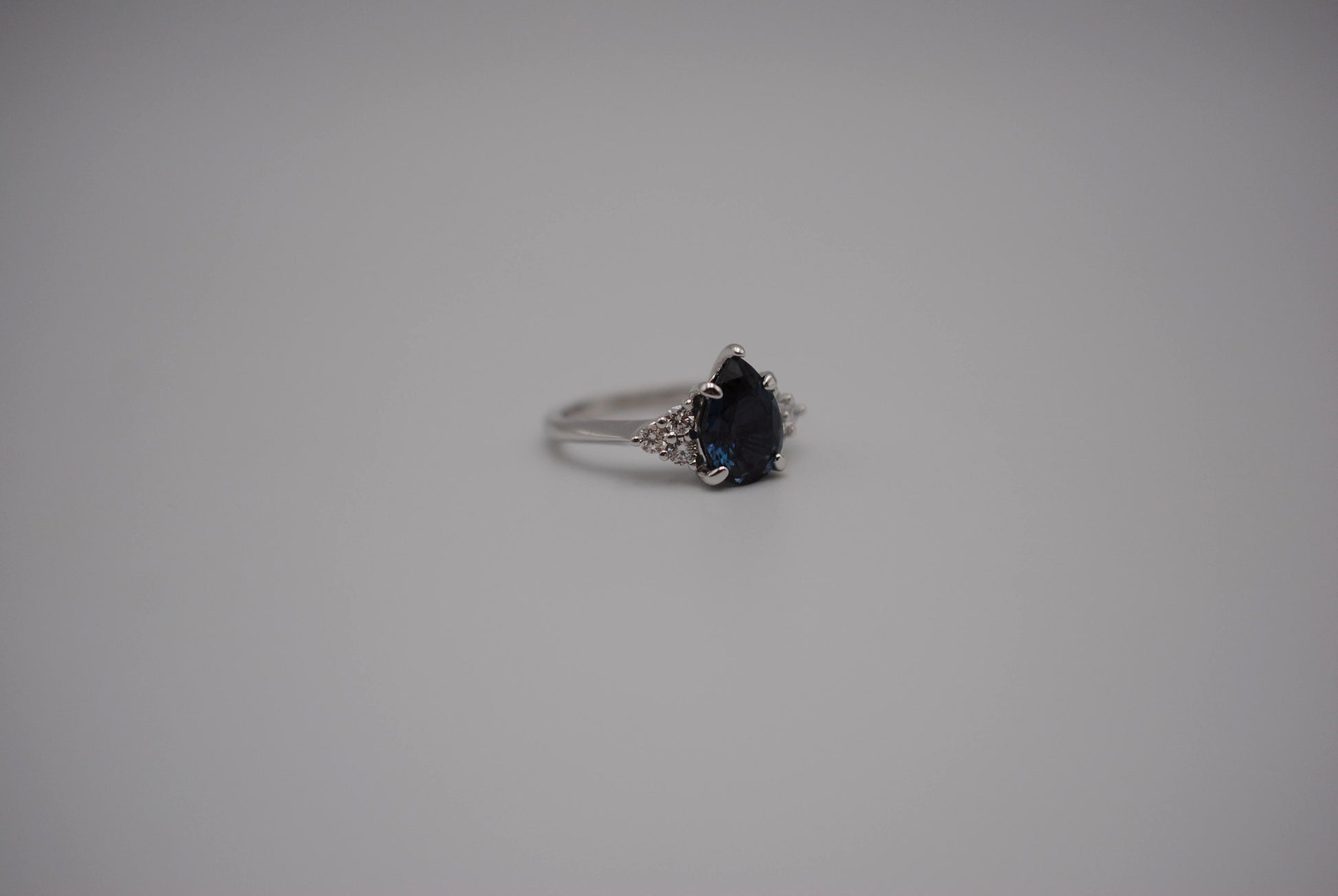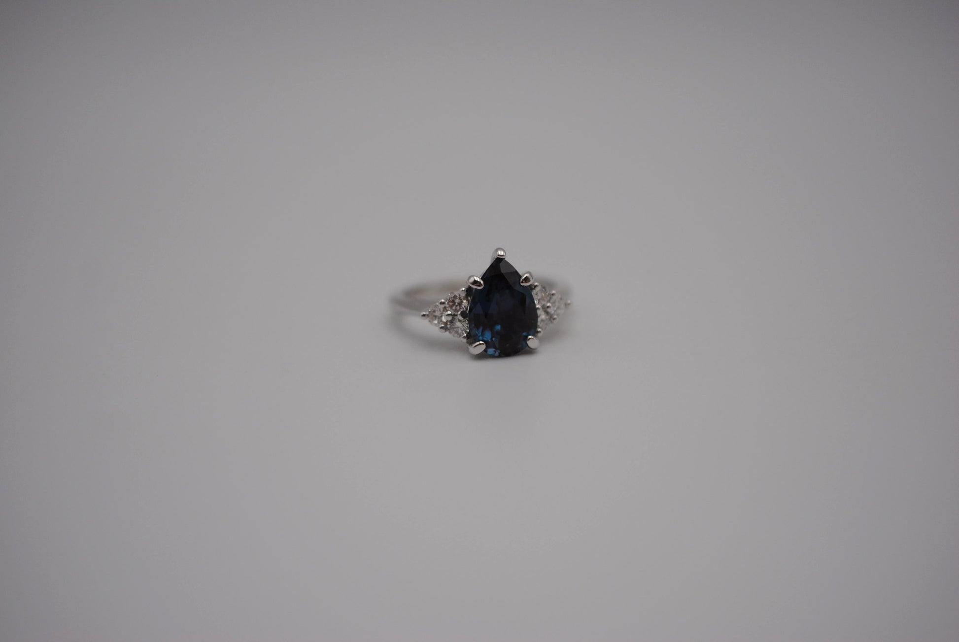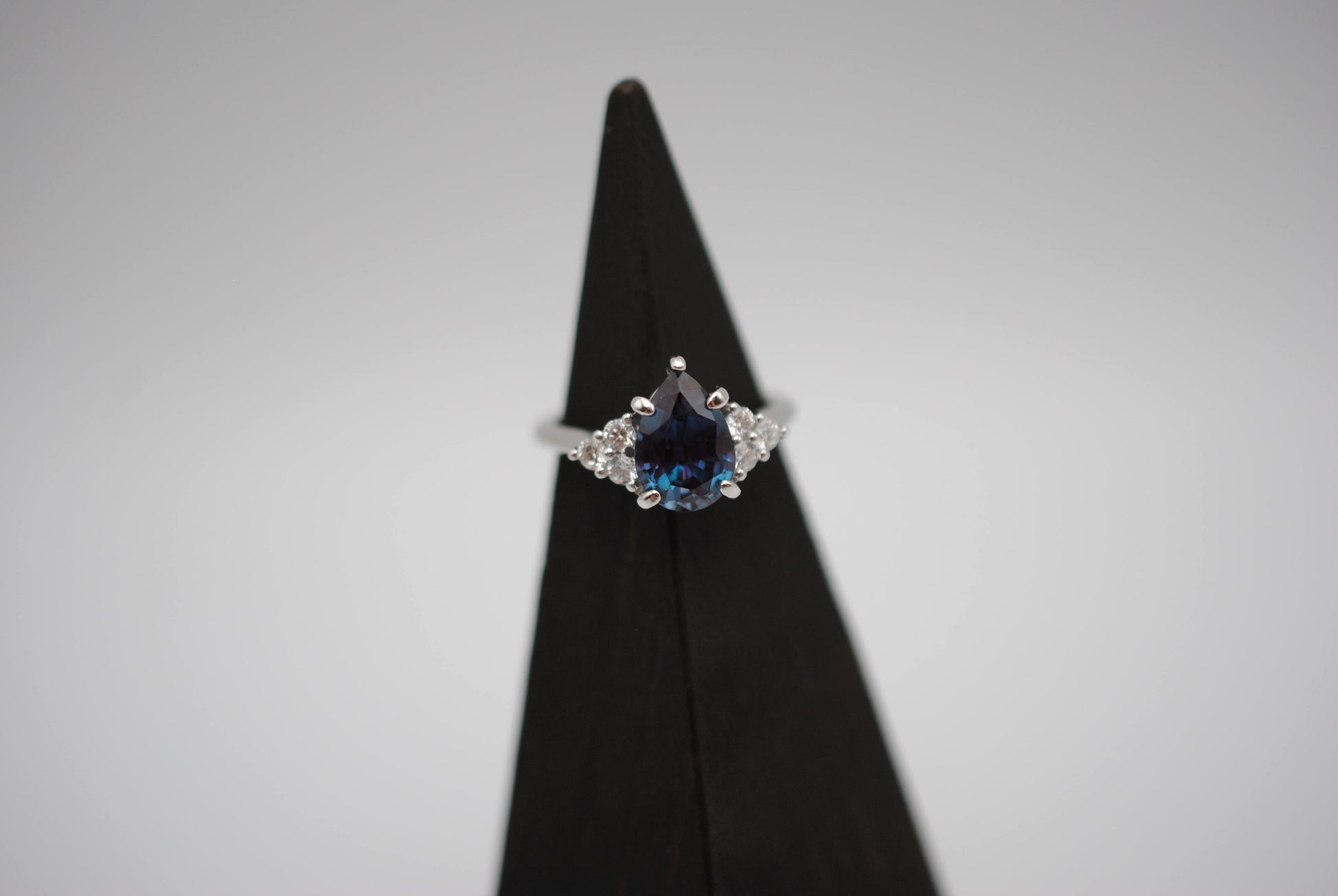 This is our Alexandrite Ring: Pear Cut, Diamond Melee, White Gold.