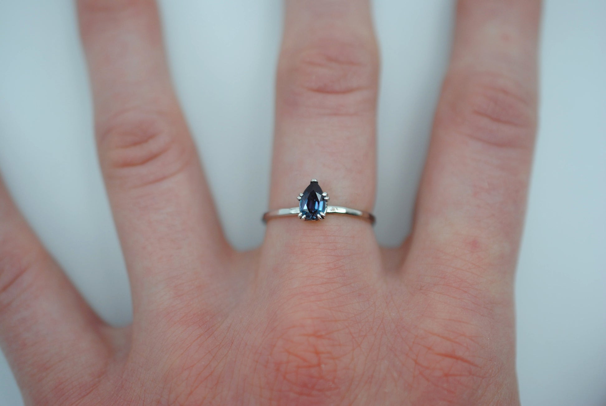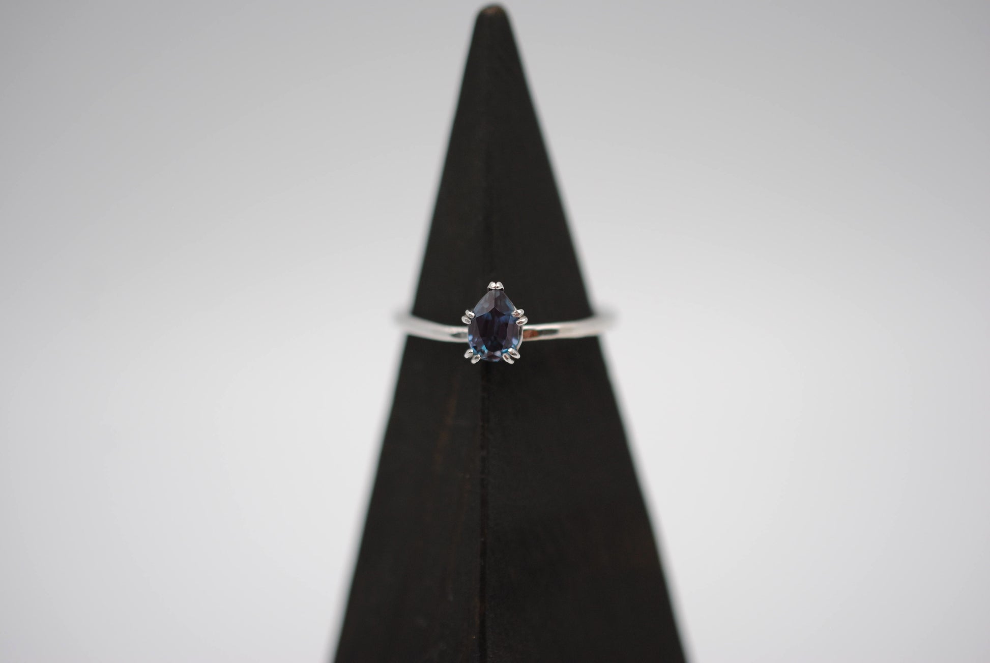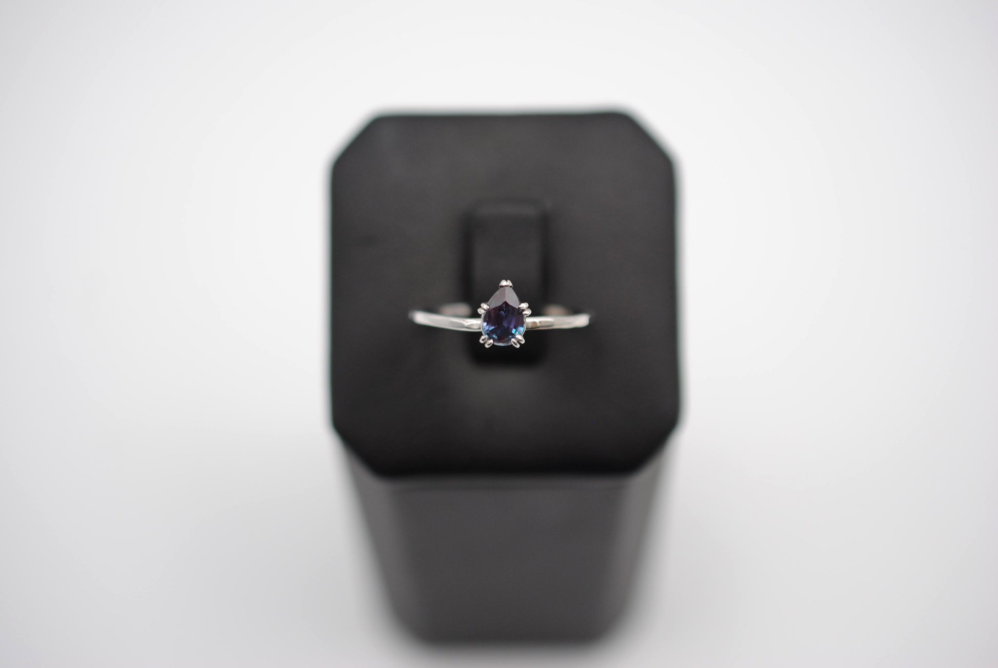 This is our Alexandrite Ring: Pear Cut, White Gold, Dainty.