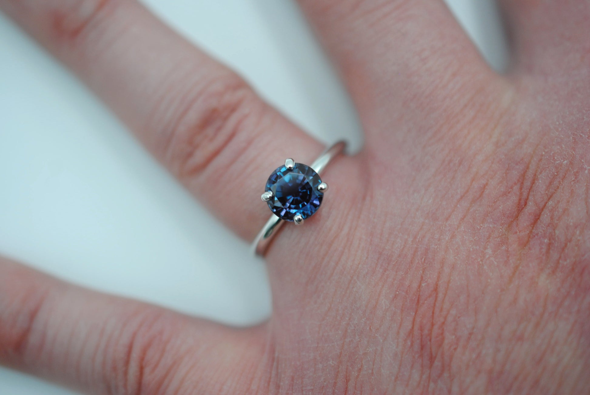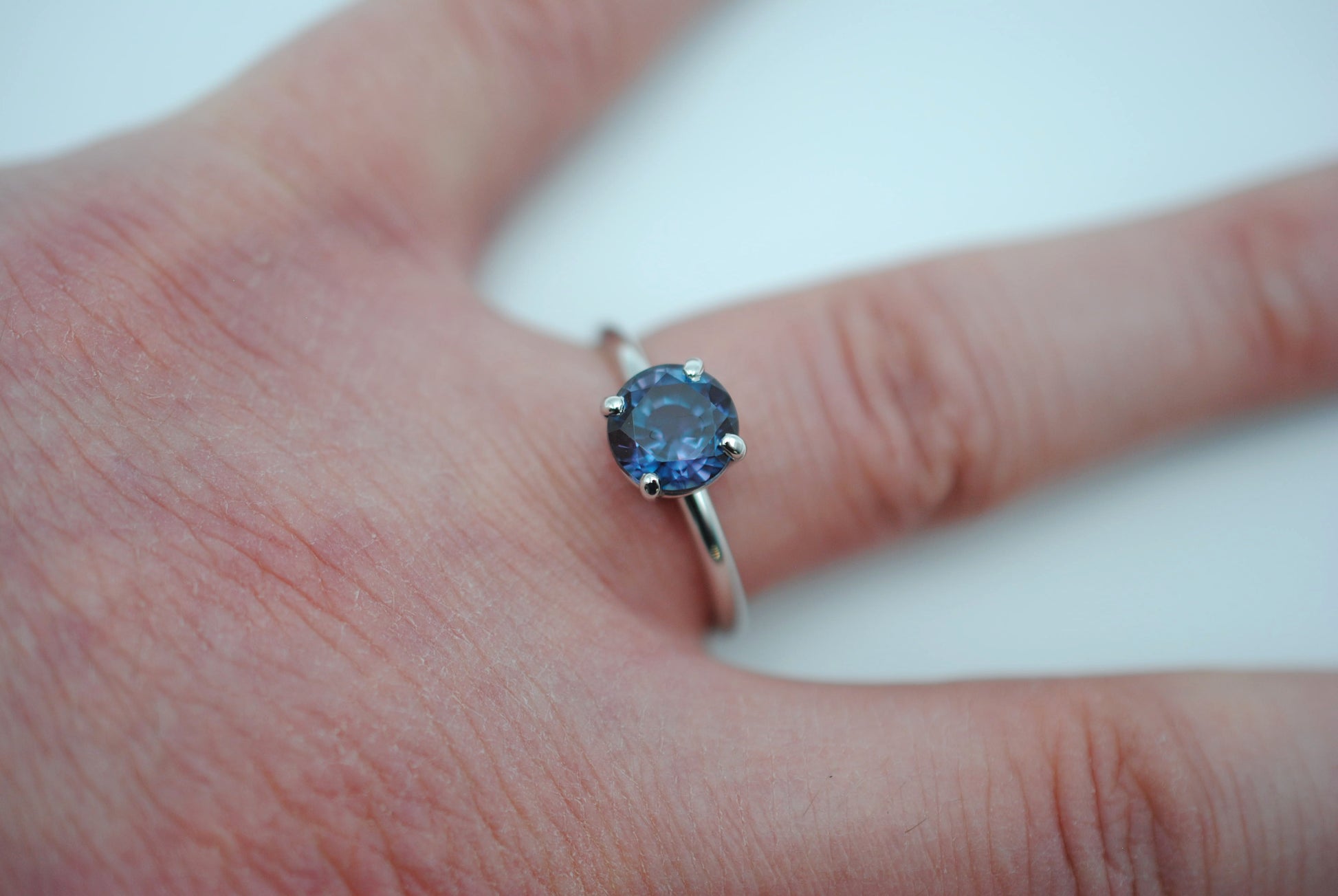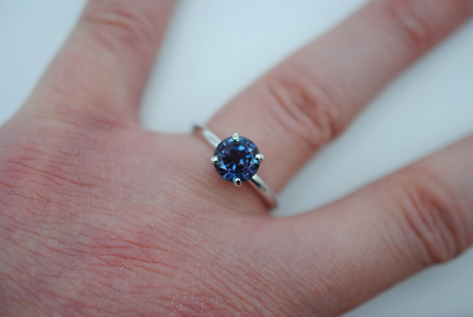 It features an 8mm round cut lab alexandrite. It's ethically sourced.