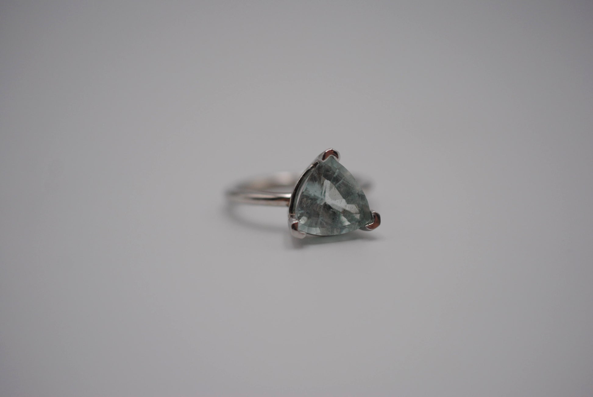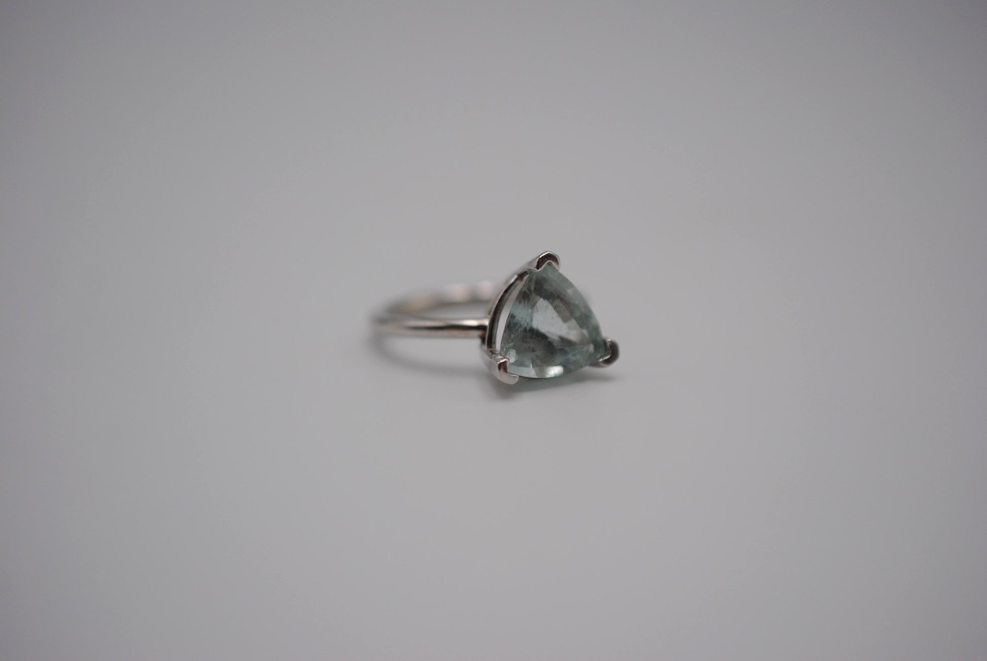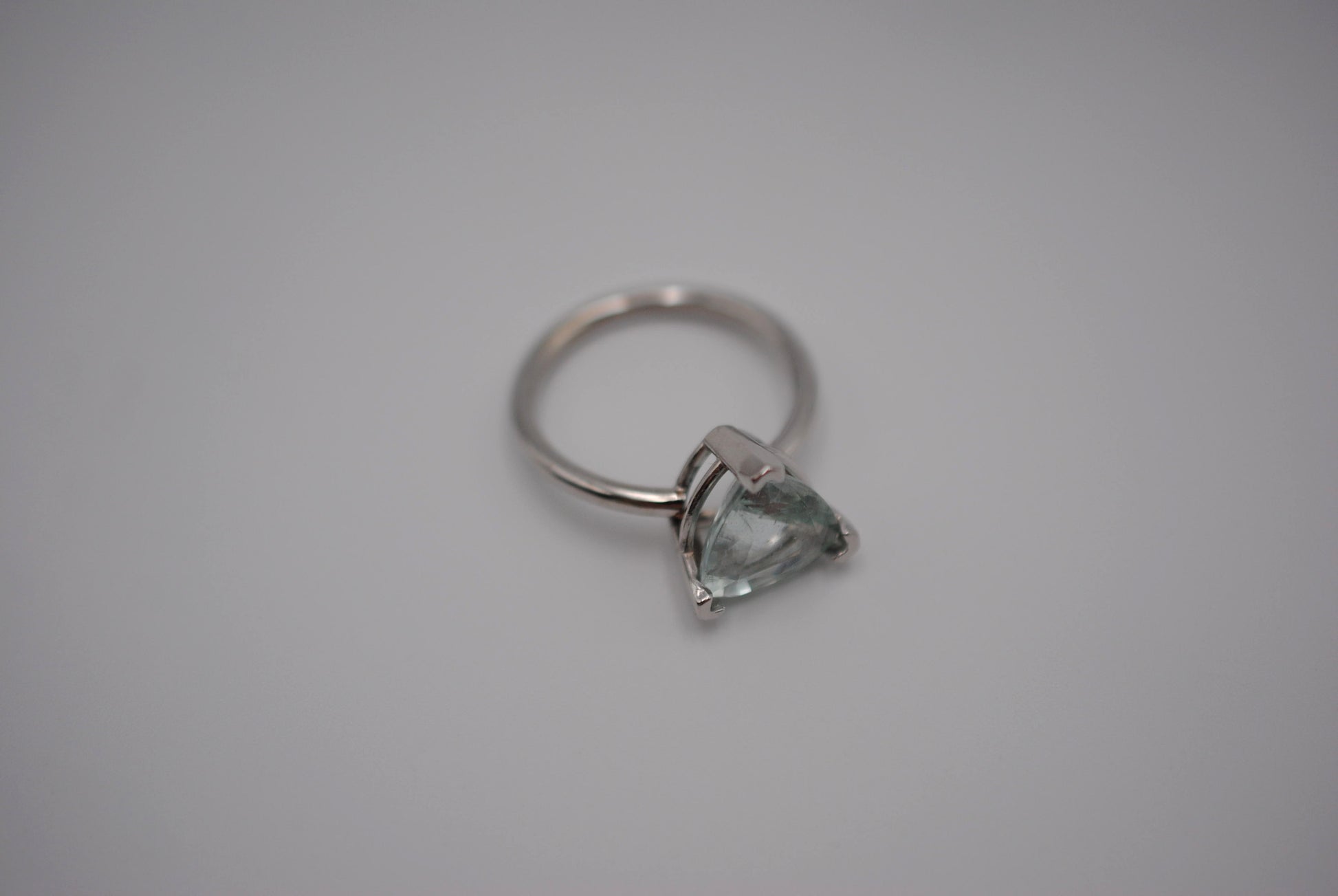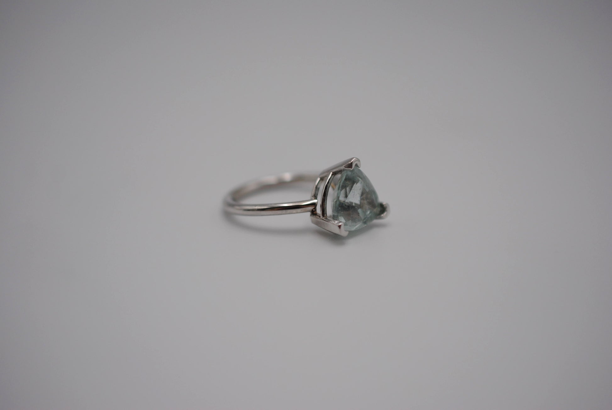 This is our Aquamarine Ring: Trillion Cut, White Gold, V Prong Setting.
