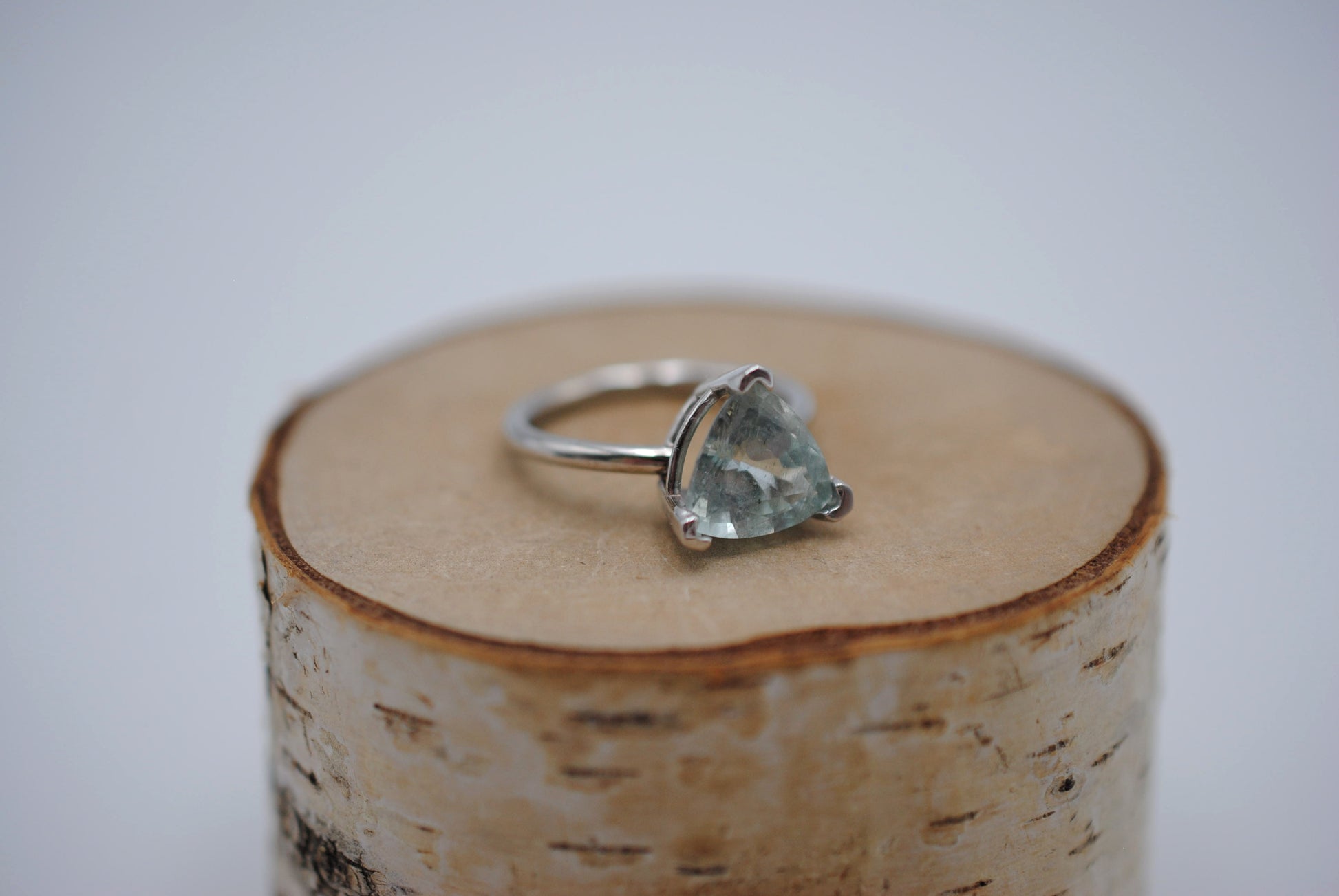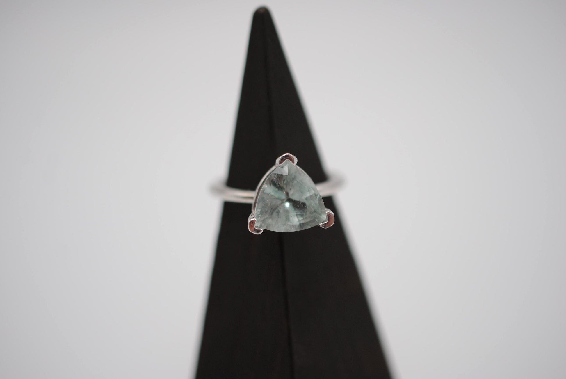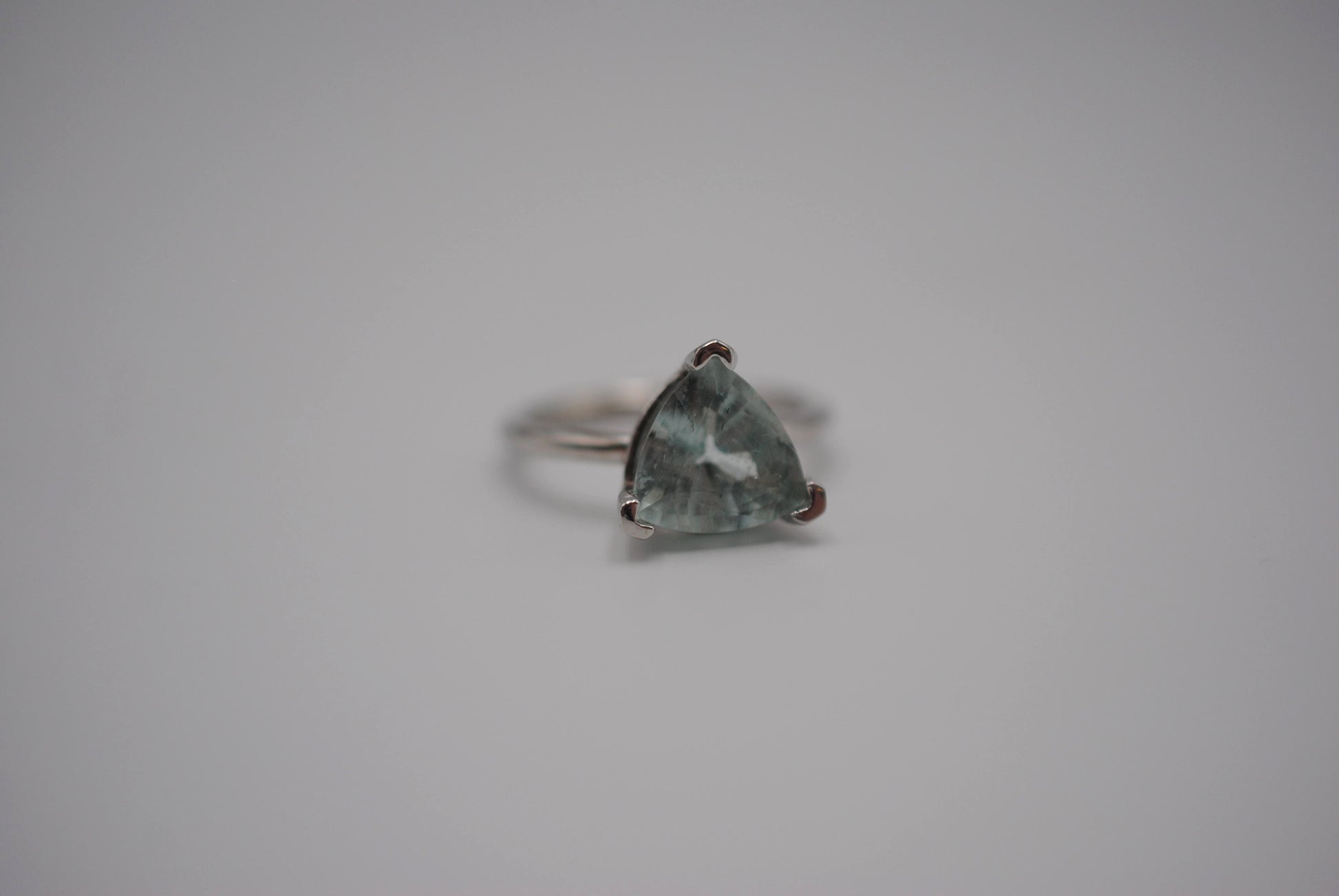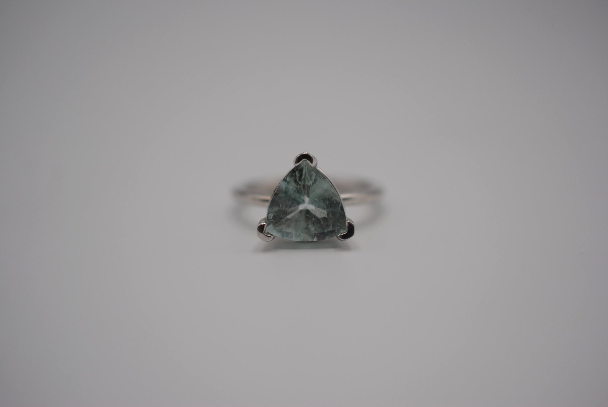 This is our Aquamarine Ring: Trillion Cut, White Gold, V Prong Setting.