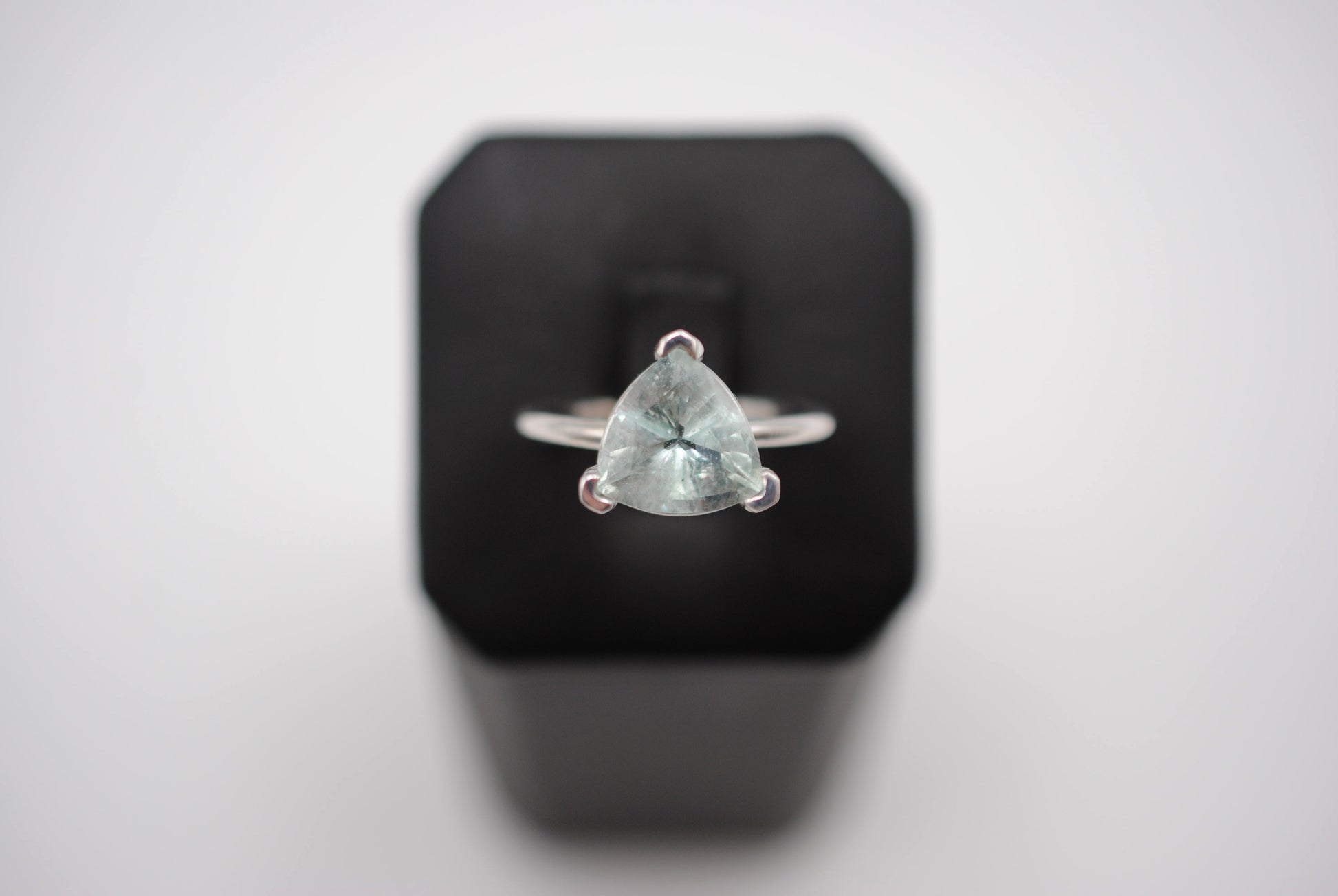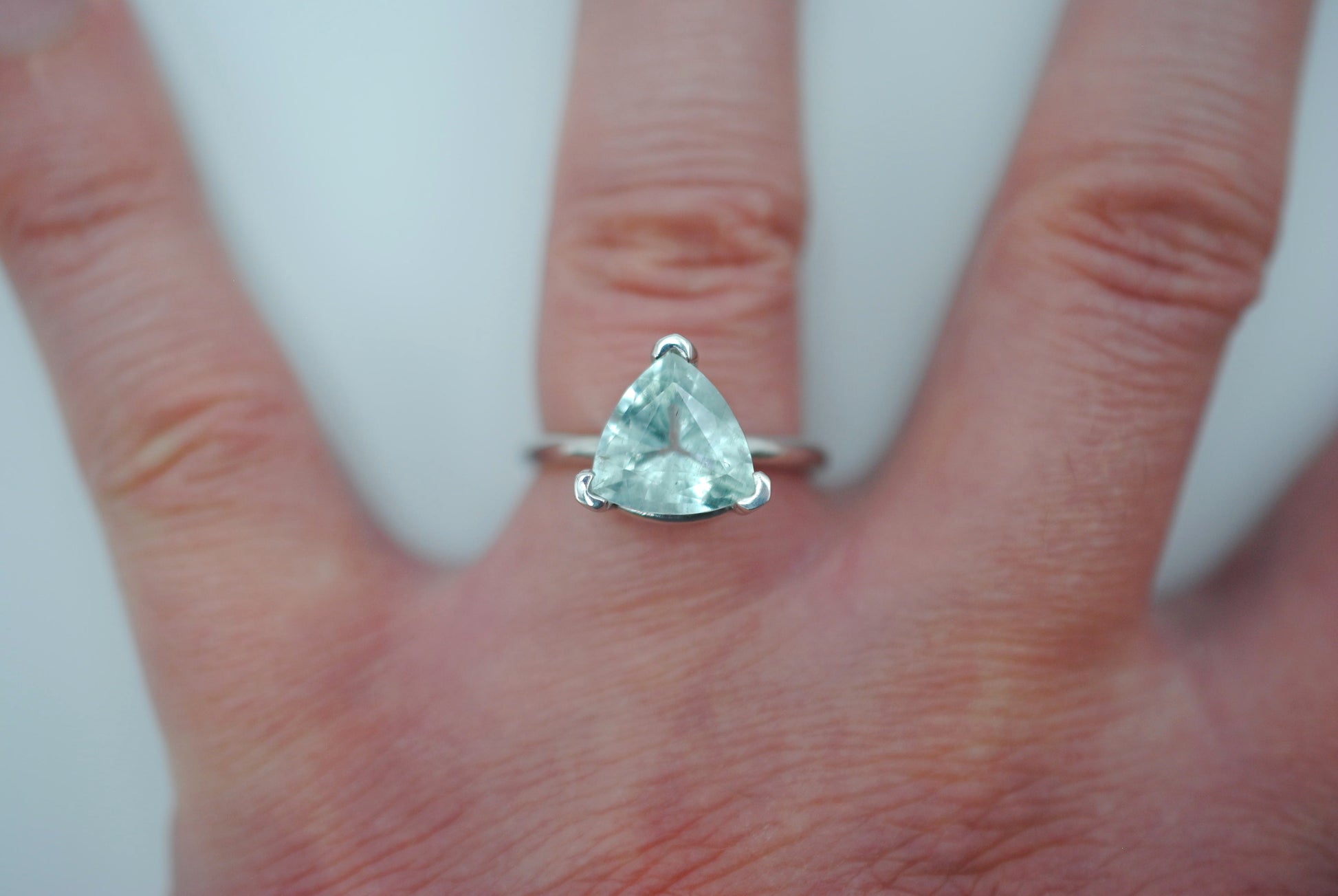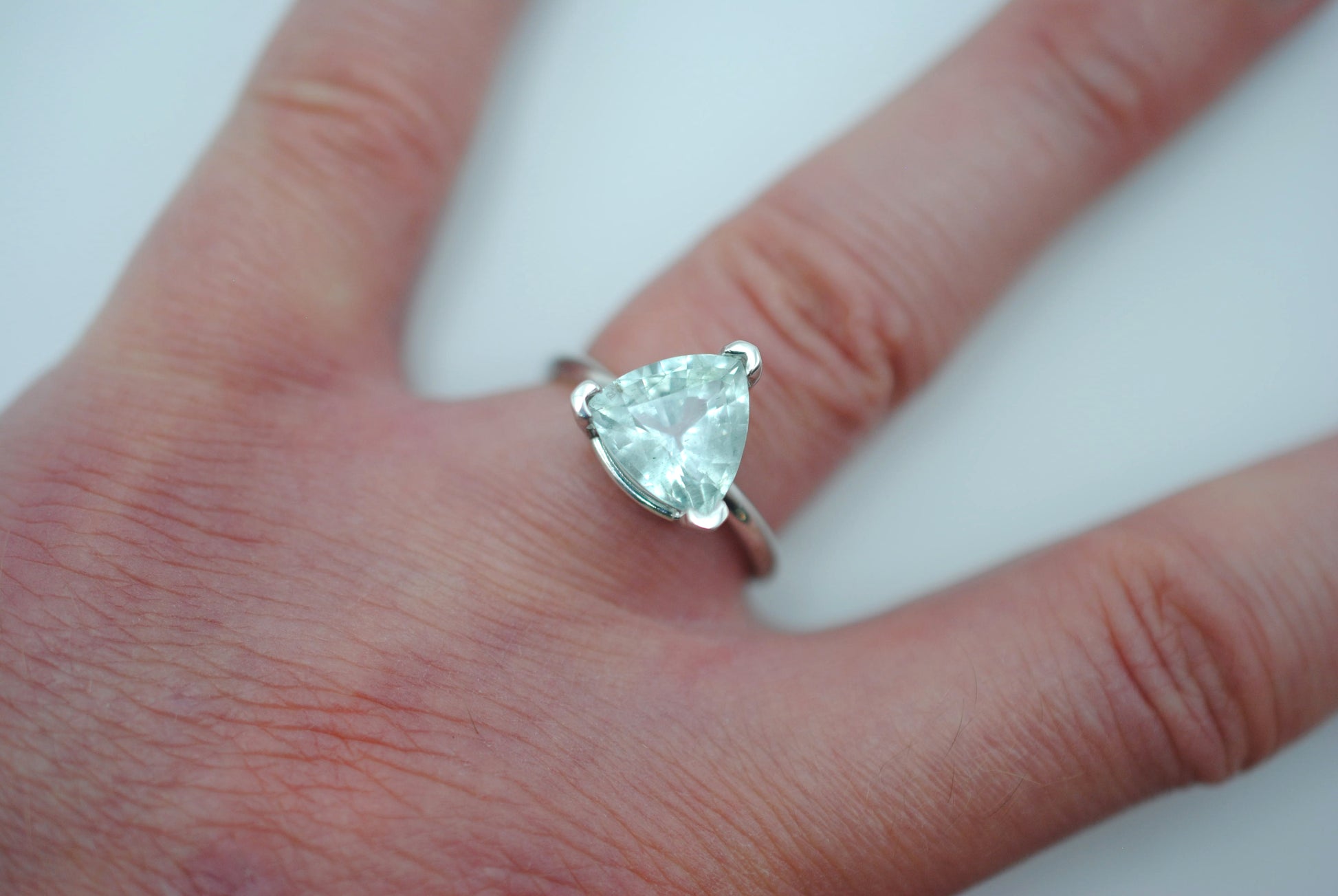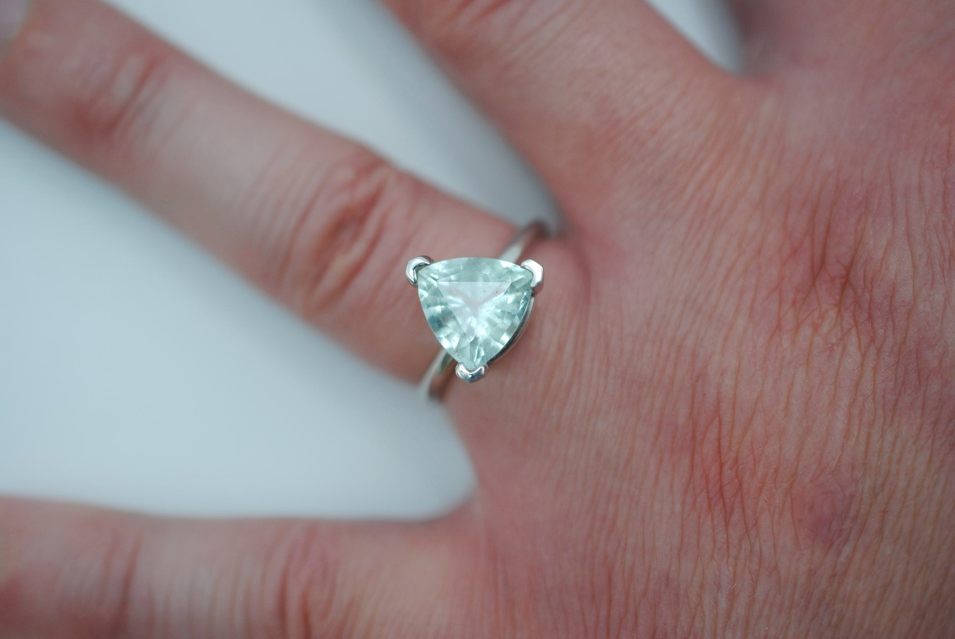It features an ethically sourced natural trillion cut aquamarine. It's 11mm, and 3.31 carats.