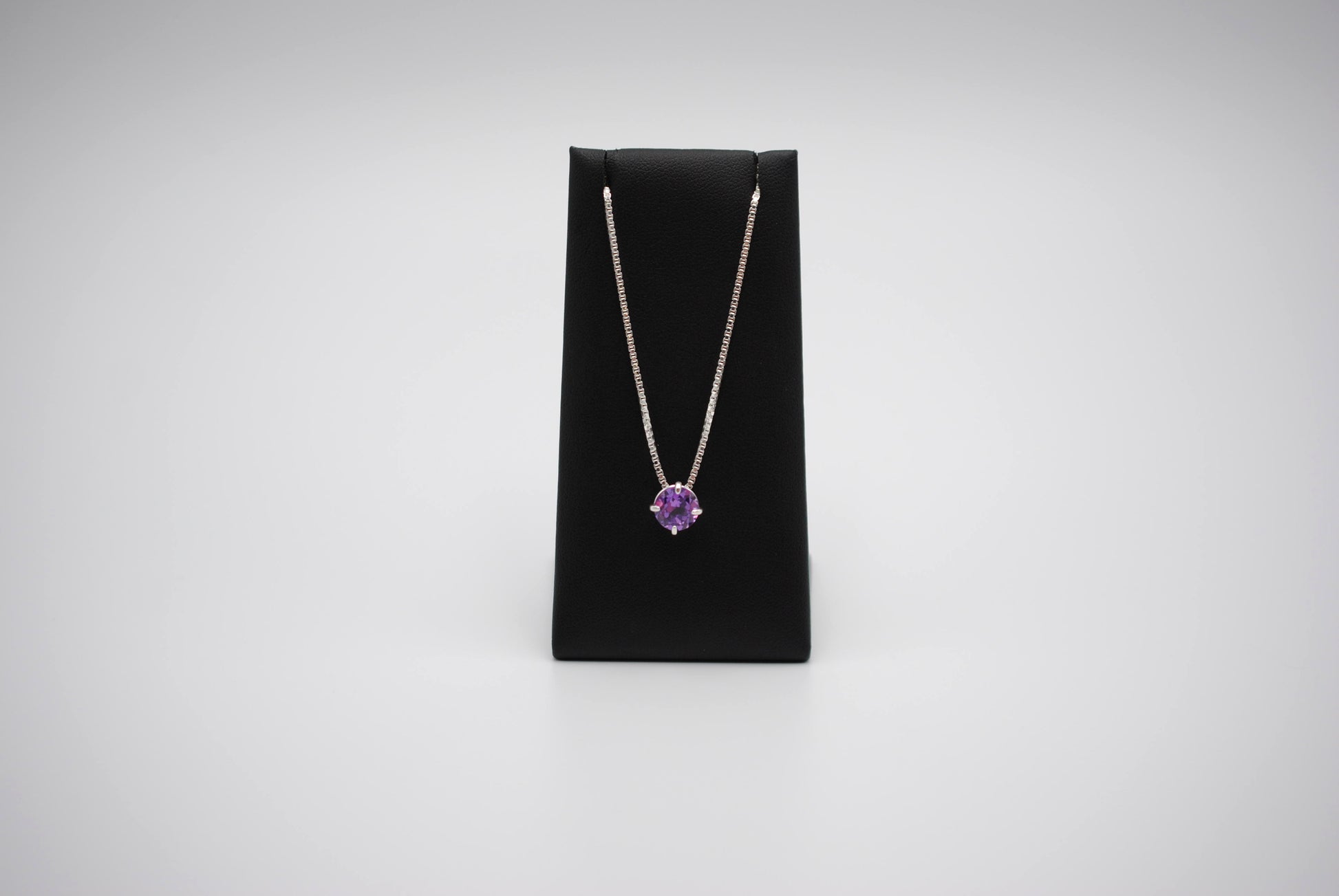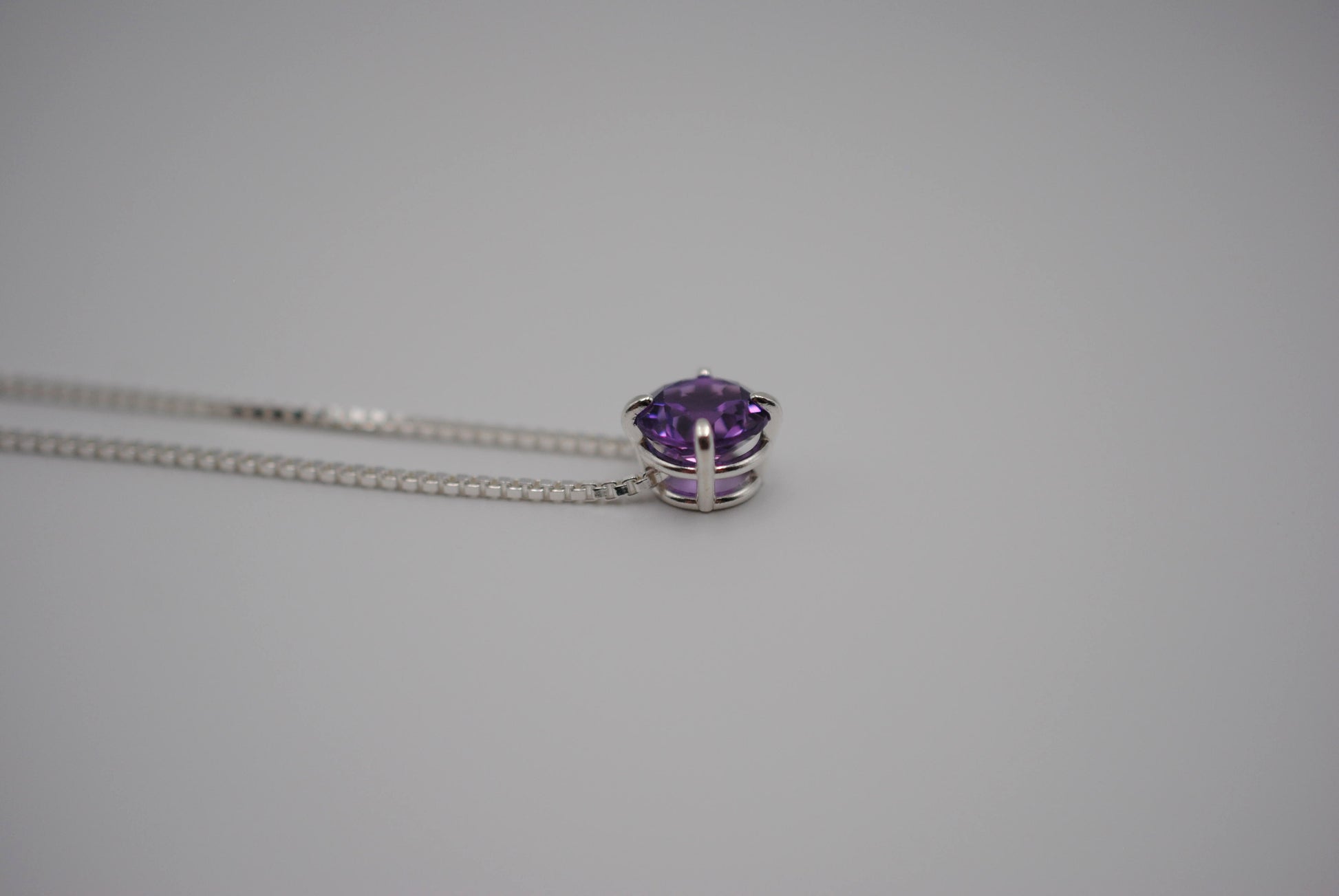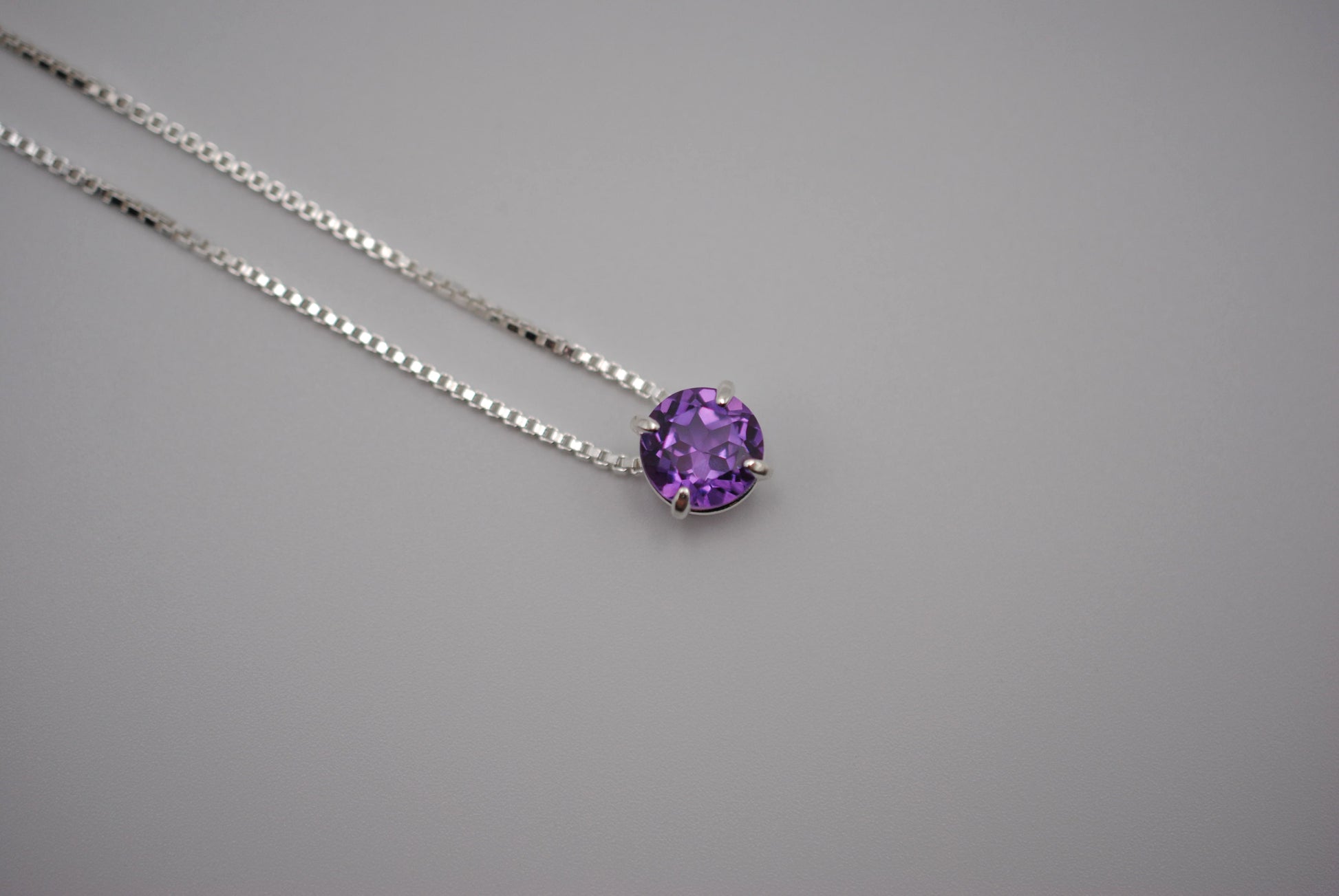 This is our Birthstone Necklace: Round Amethyst, Silver Prong Setting, Adjustable Chain.