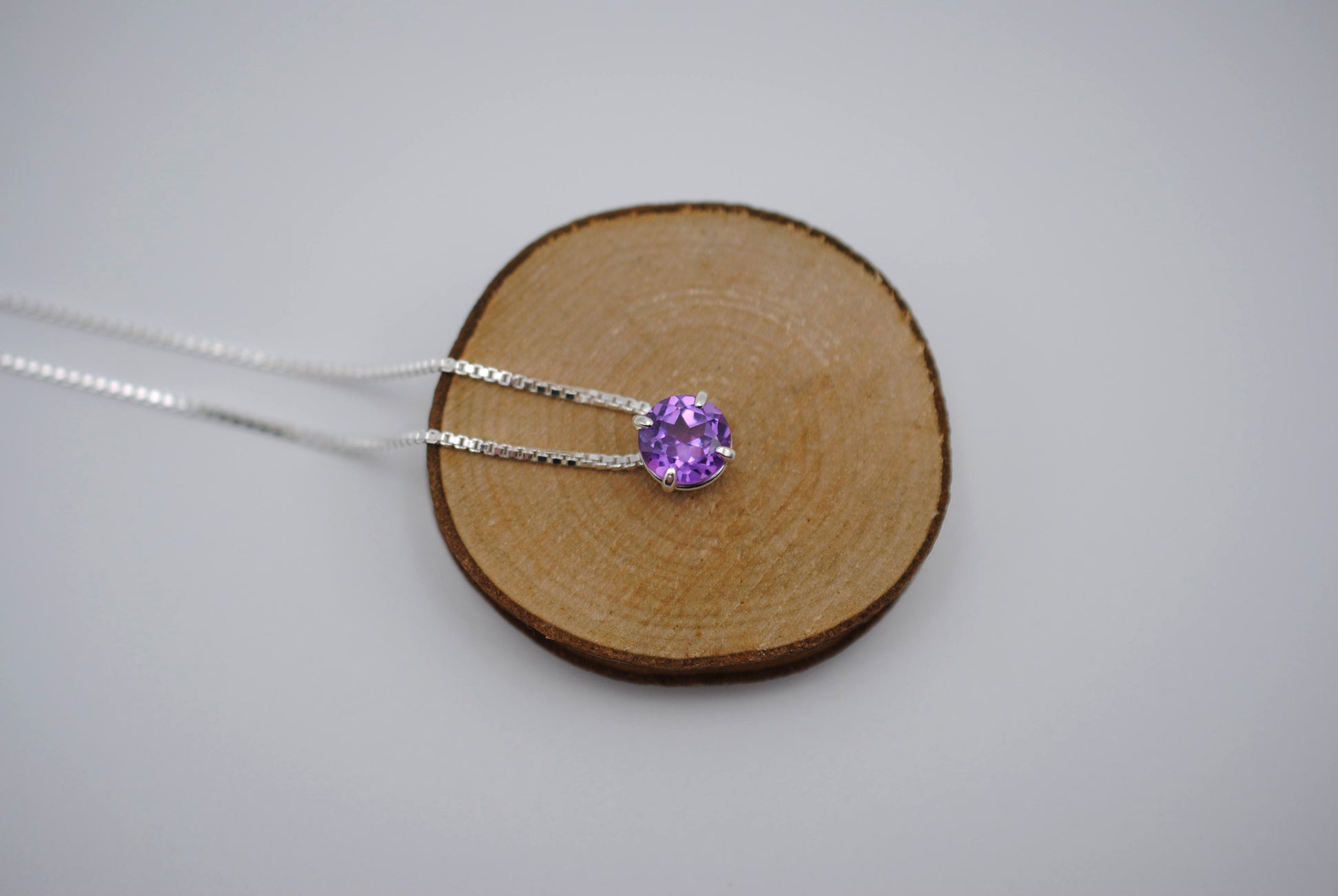 Birthstone Necklace: Round Amethyst, Silver Prong Setting, Adjustable Chain