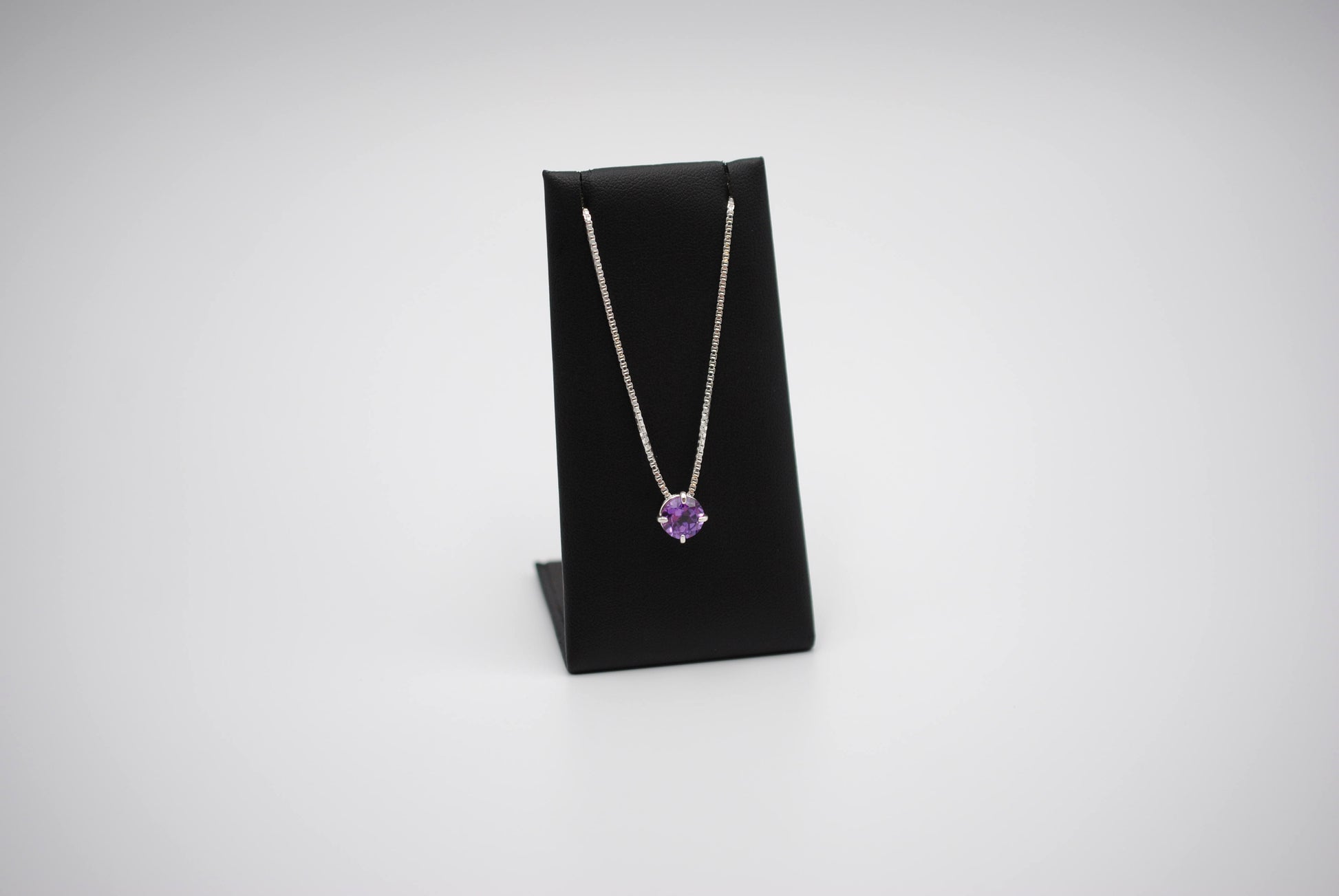 The pendant features an ethically sourced round 8mm simulated amethyst. Simulated means they're lab made imitations of natural gemstones.