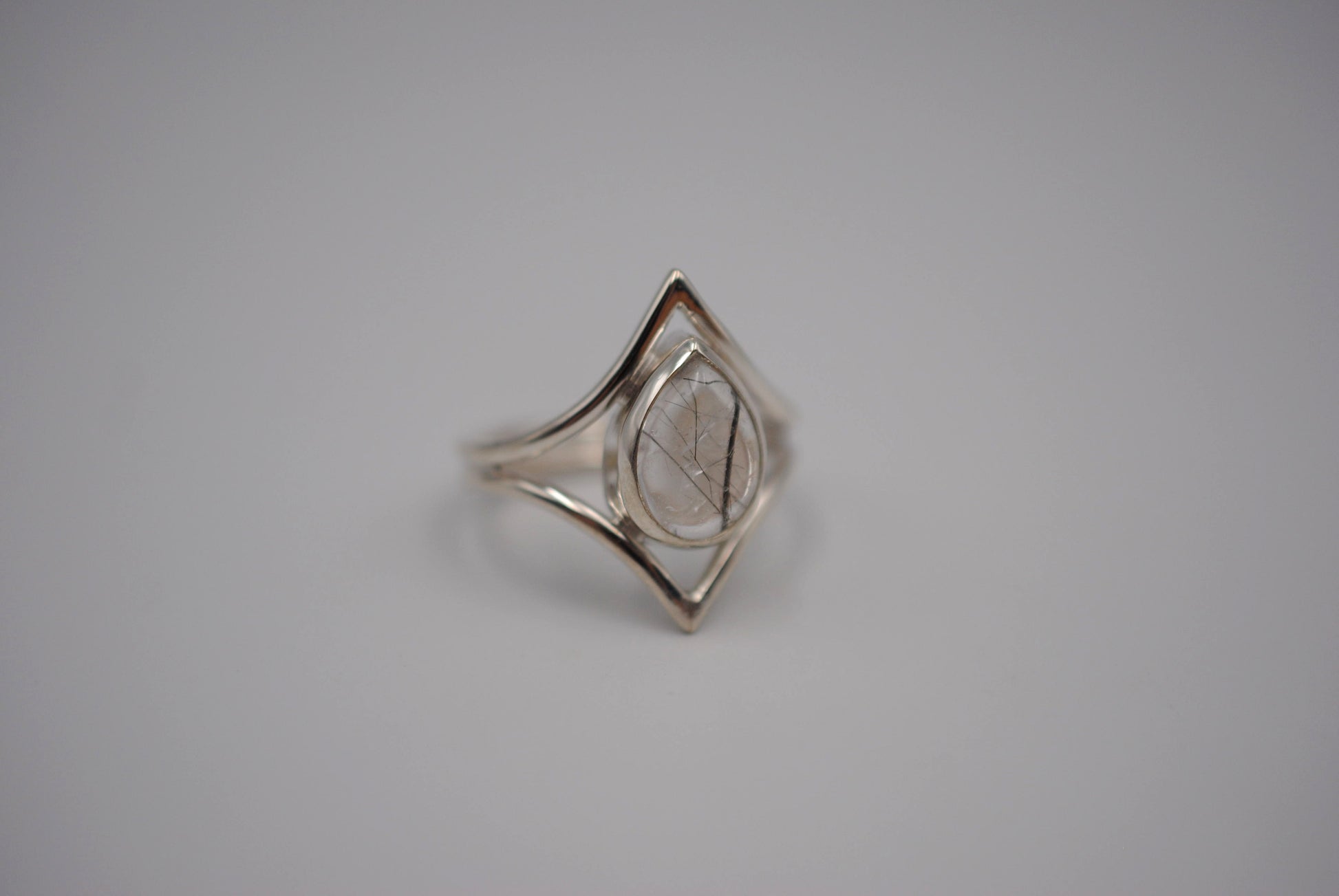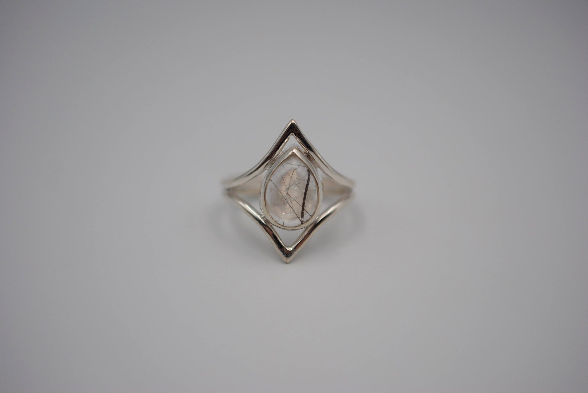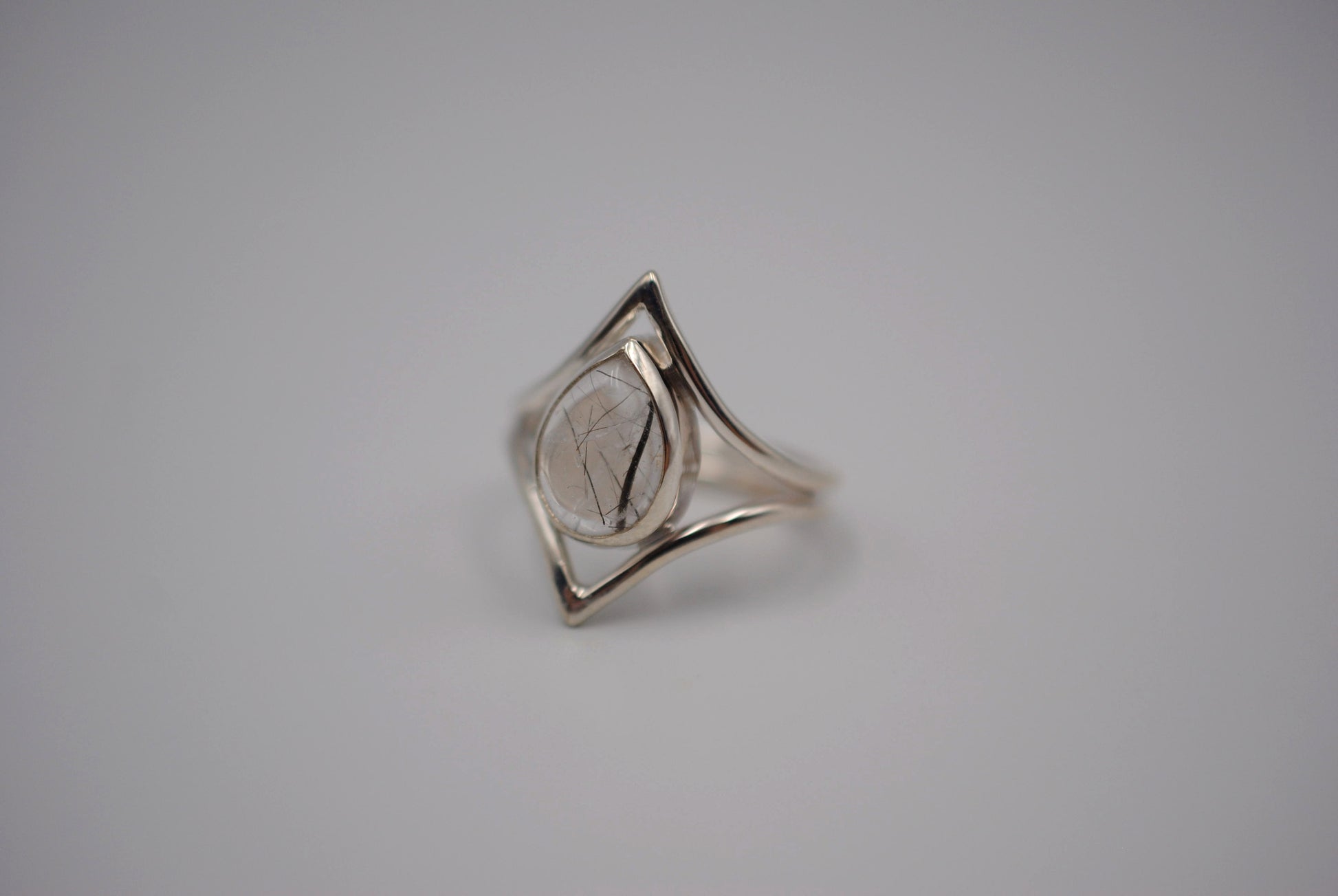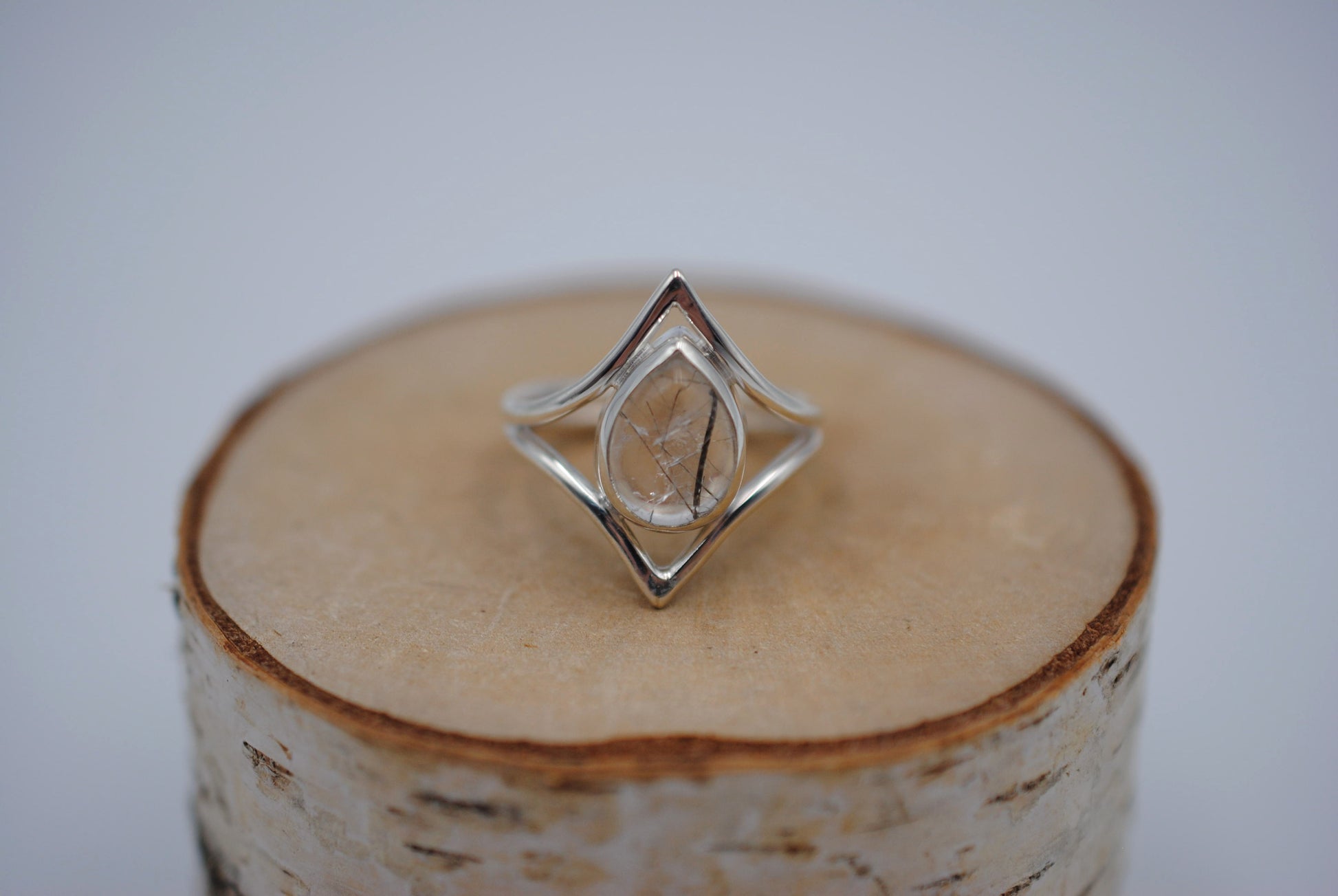 This ring features a rutilated quartz. These stones have tourmaline inclusions. The melding of these two minerals makes for a beautiful organic one of a kind look. These gemstones exemplify wabi sabi, our trademark aesthetic.