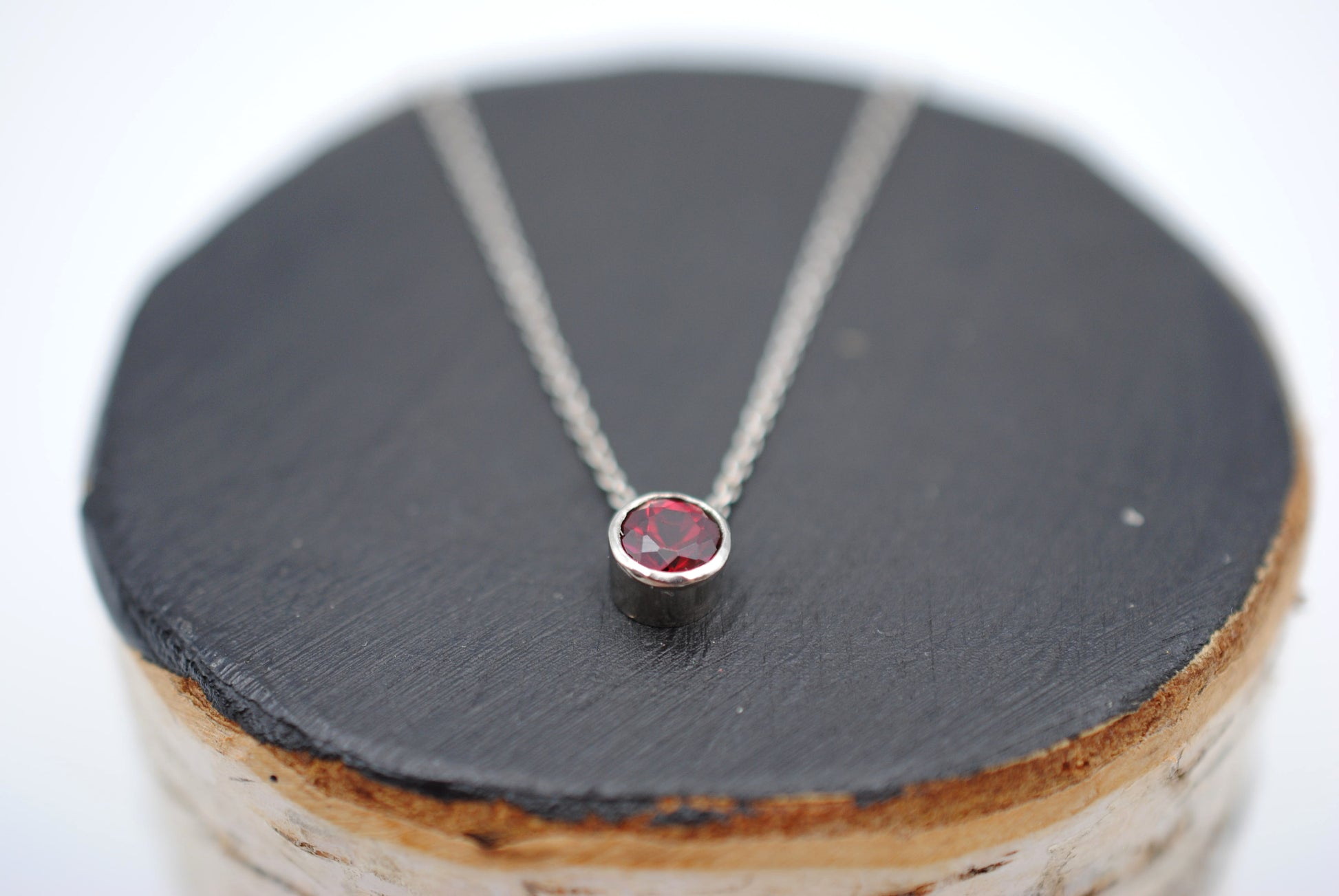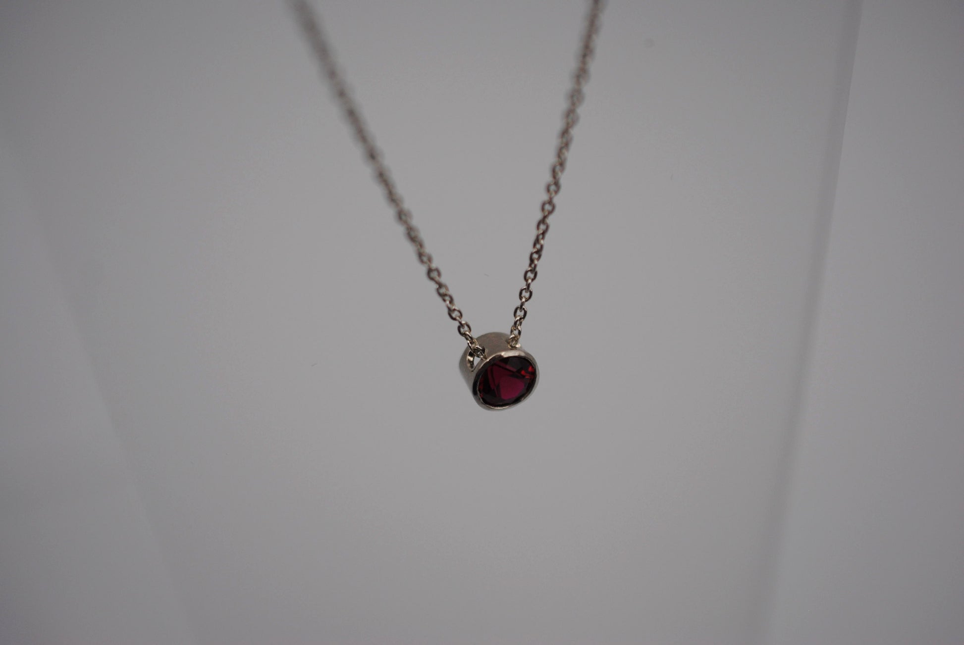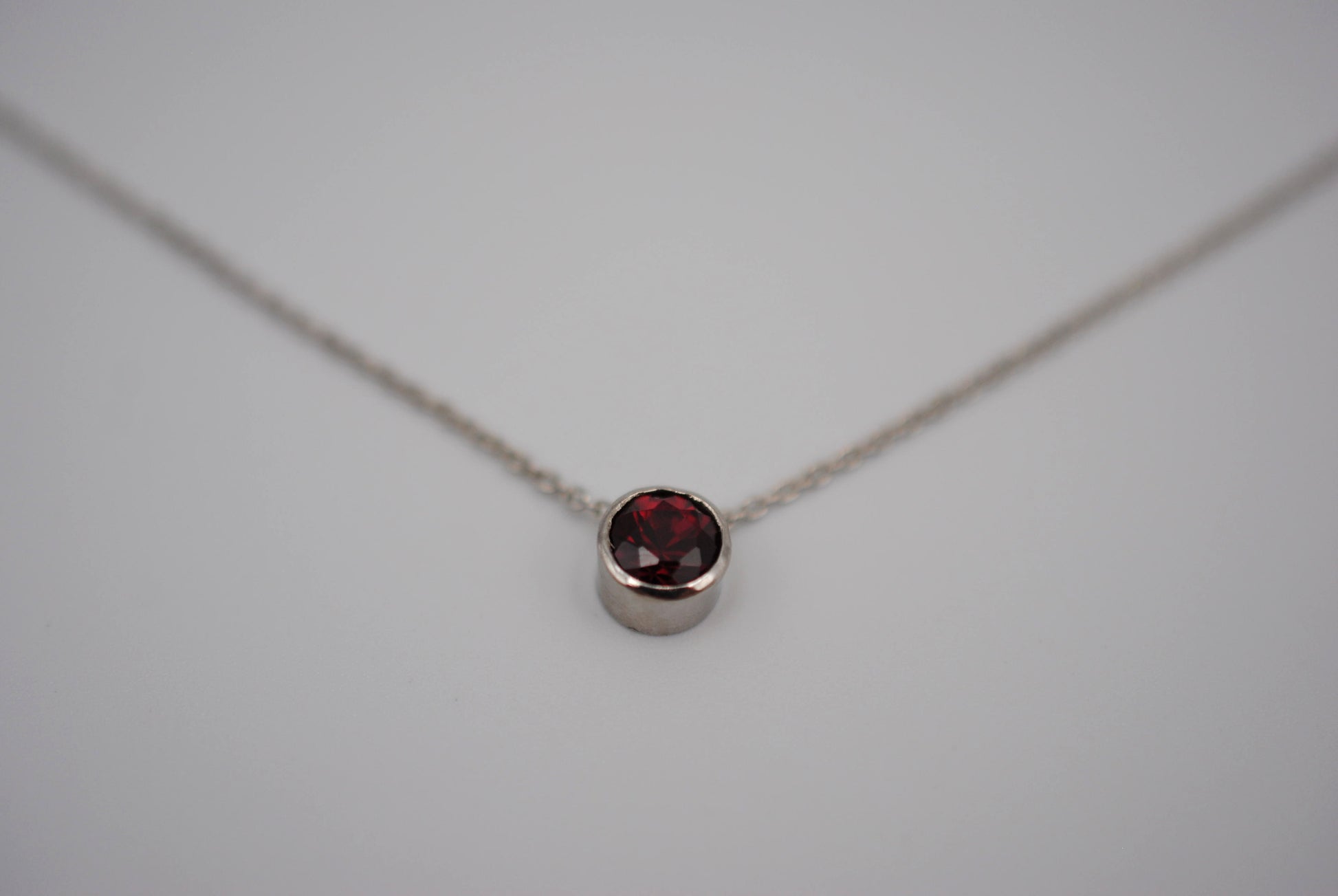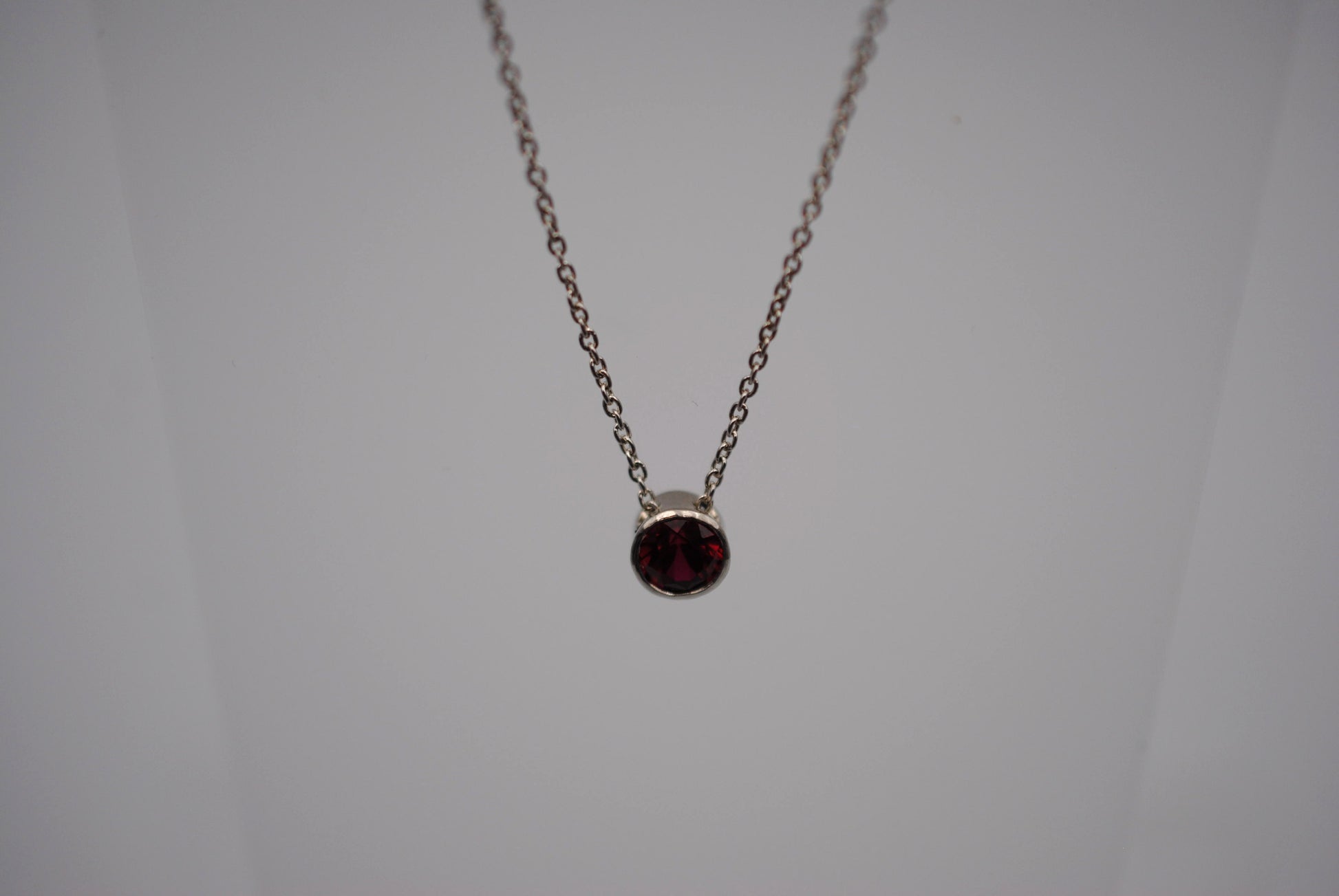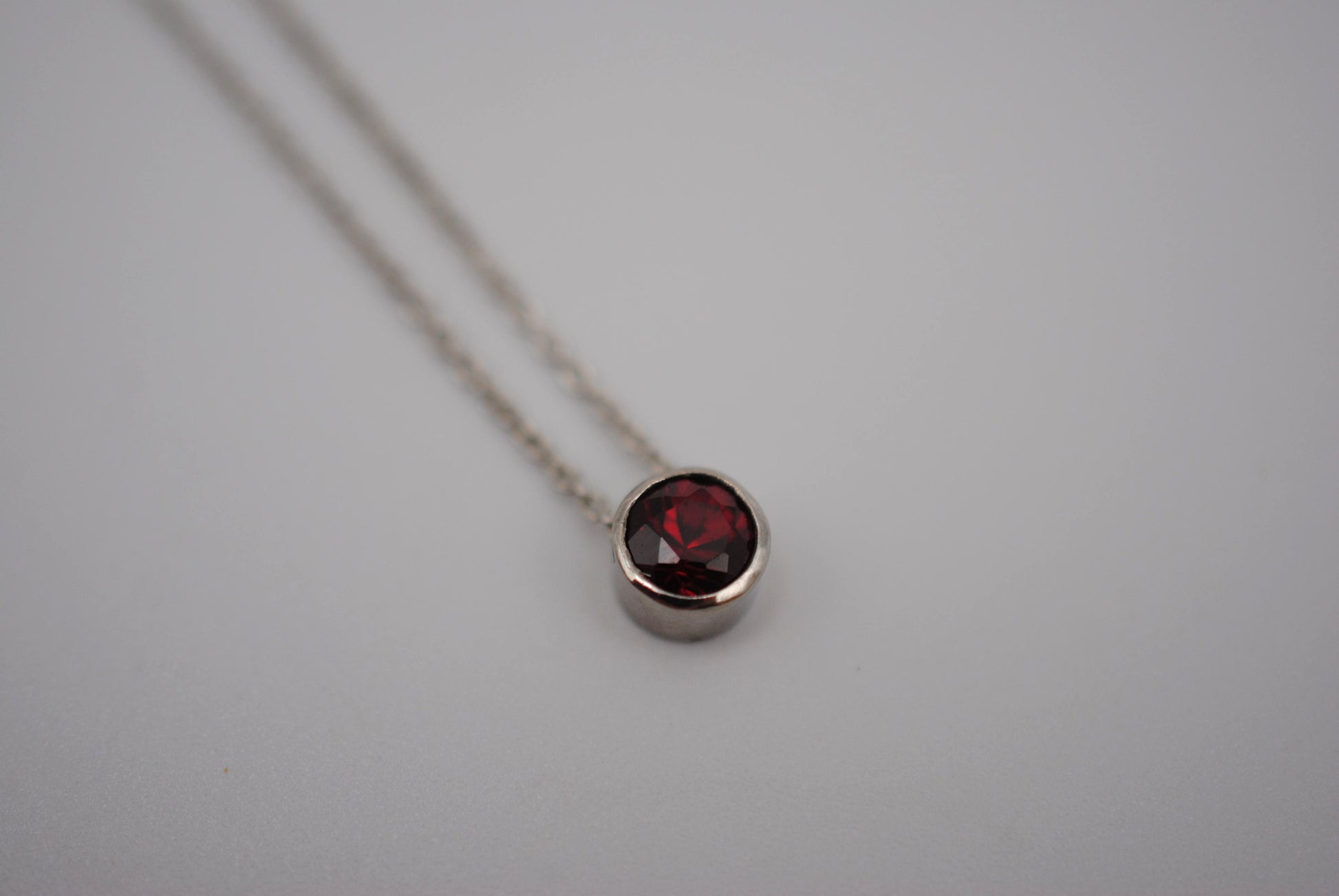 The pendant features an garnet 5mm in diameter. This is the birthstone for January.