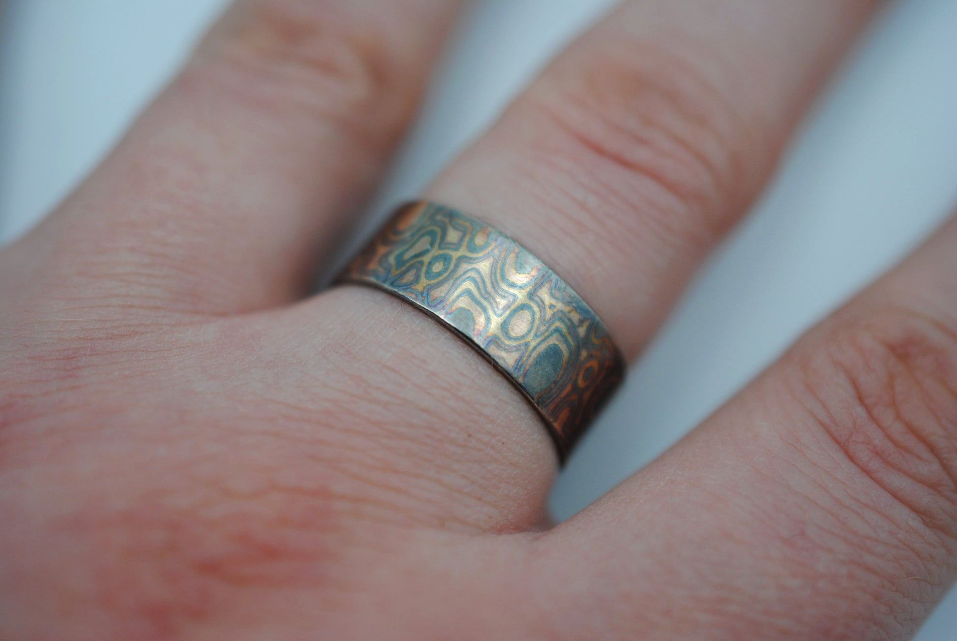This ring has patina. You might like the way it looks without the patina. Give it a look. Be sure to find the Mokume Gane that best suits you.