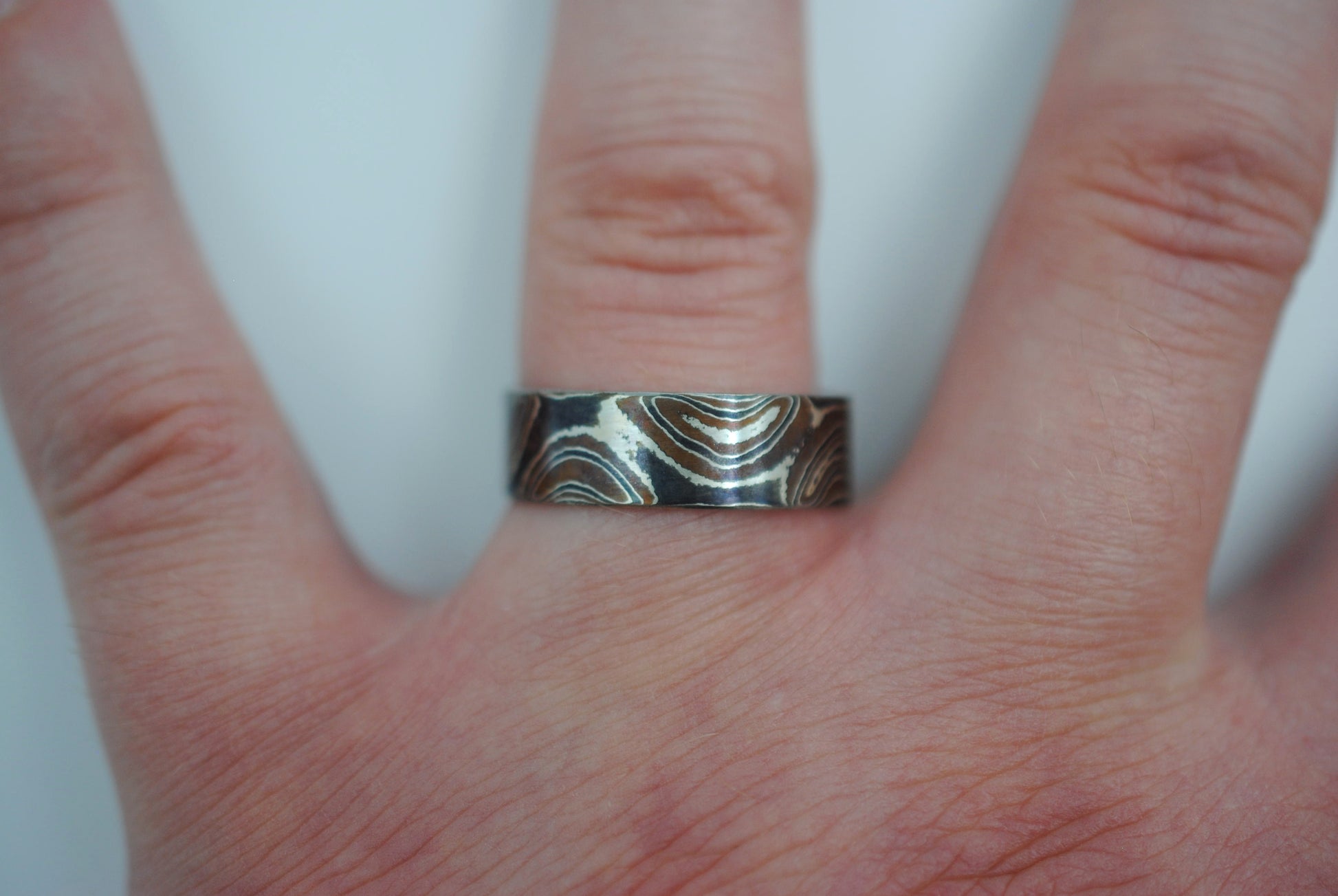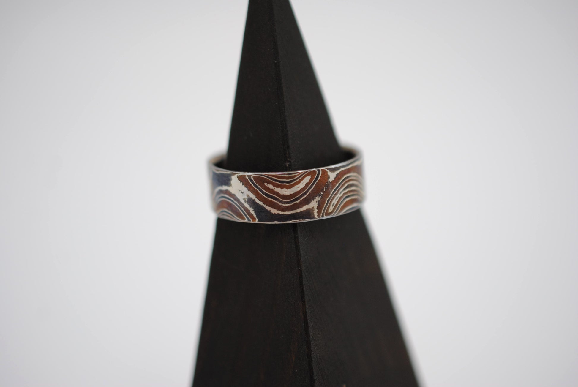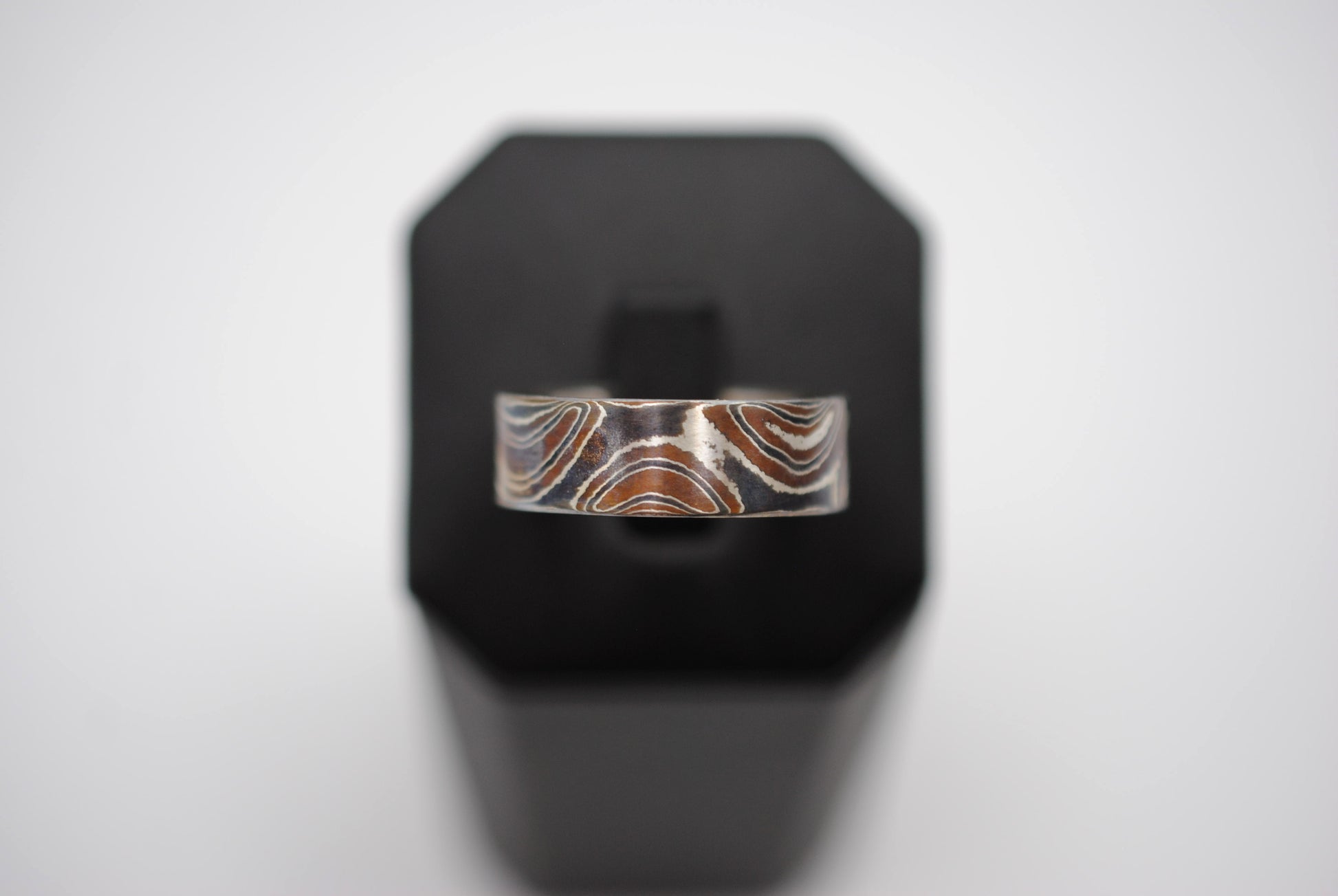This is our Mokume Gane Ring Band: Silver, Copper, and Shibuichi, 7mm Width.