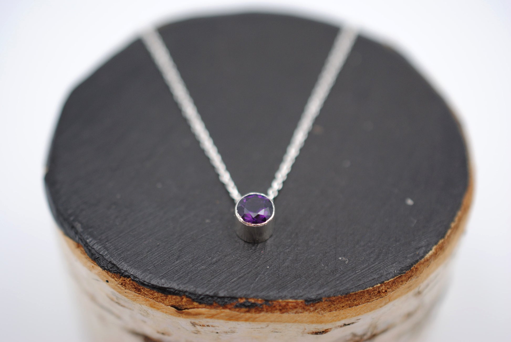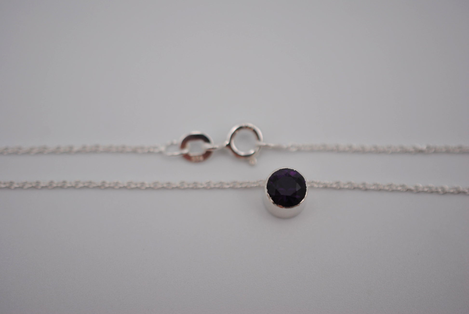 The pendant features an amethyst 5mm in diameter. This is the birthstone for February.