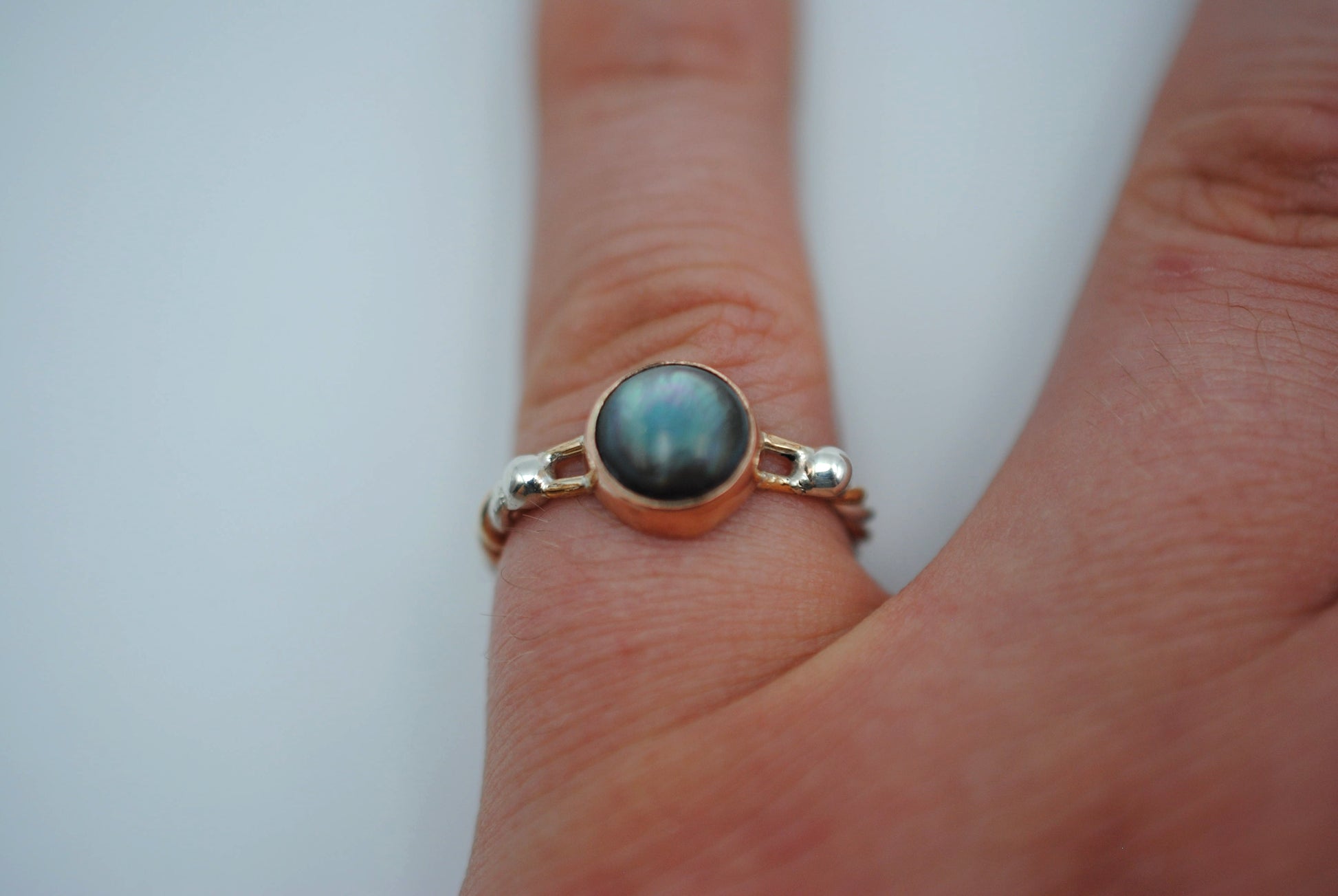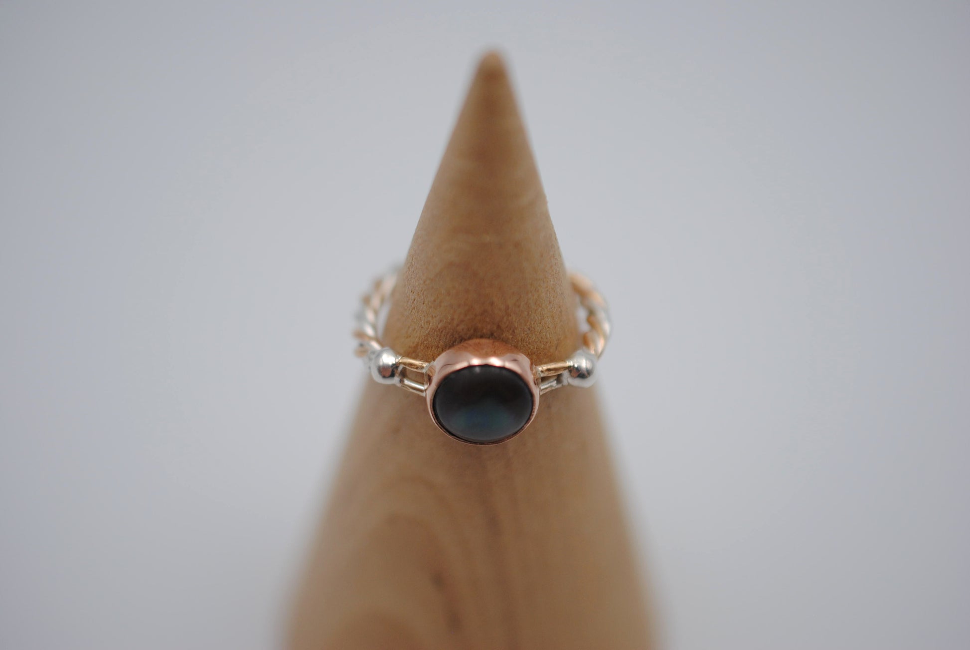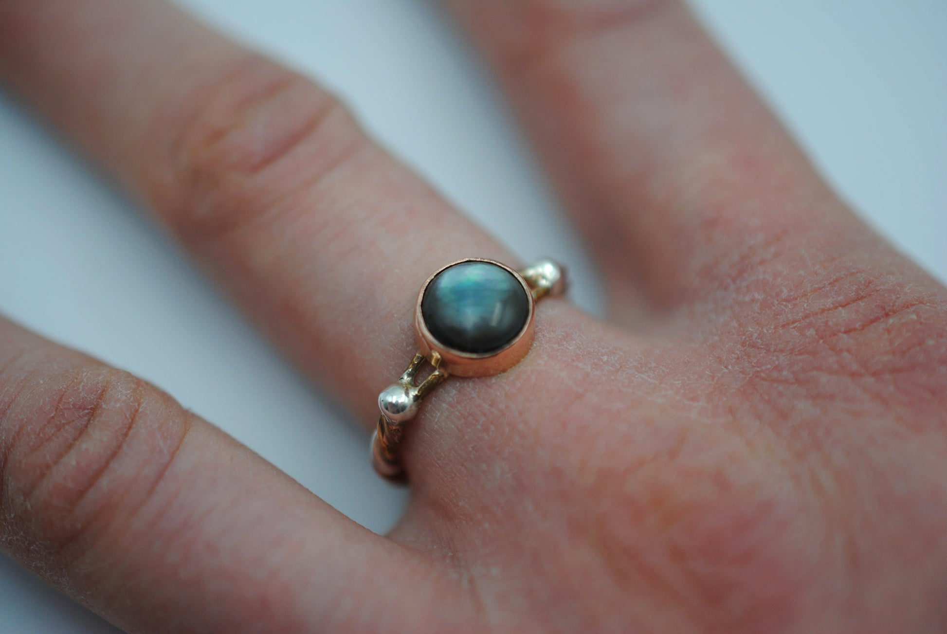 This ring features a mother of pearl. This beautiful iridescent material is sourced from oysters and other molluscs. It is the only gemstone created by a life form. Not only are they beautiful and organic, they are also durable.