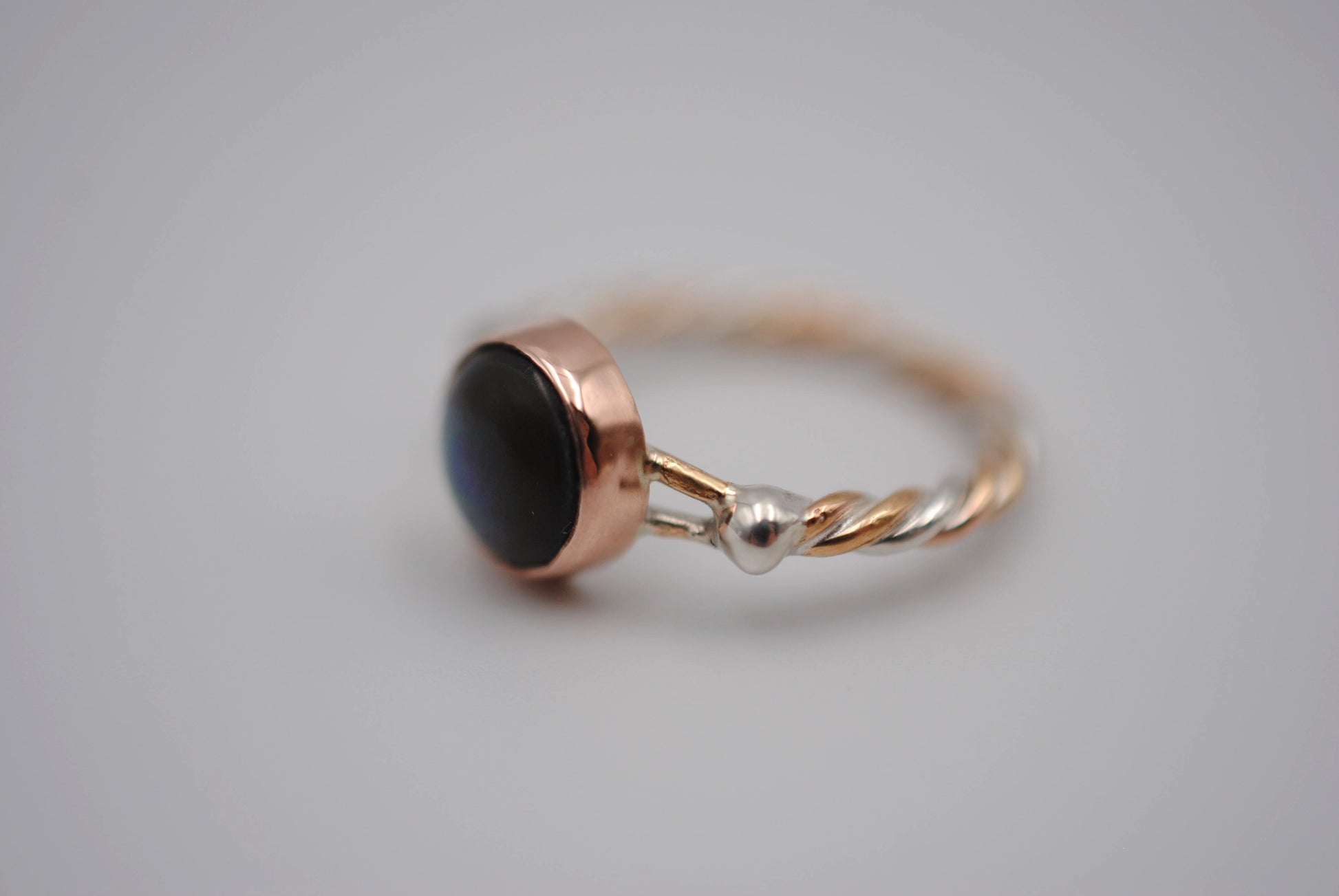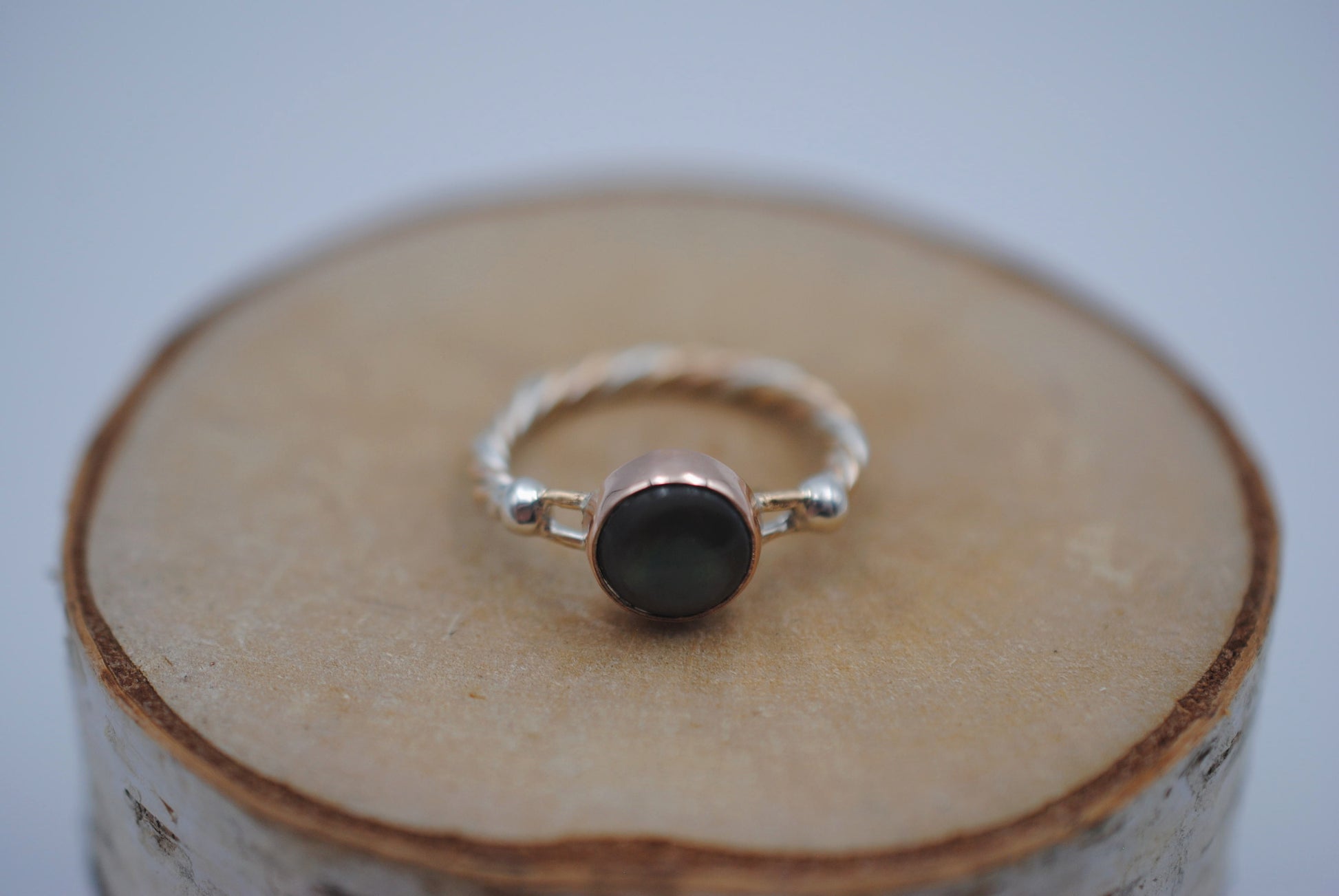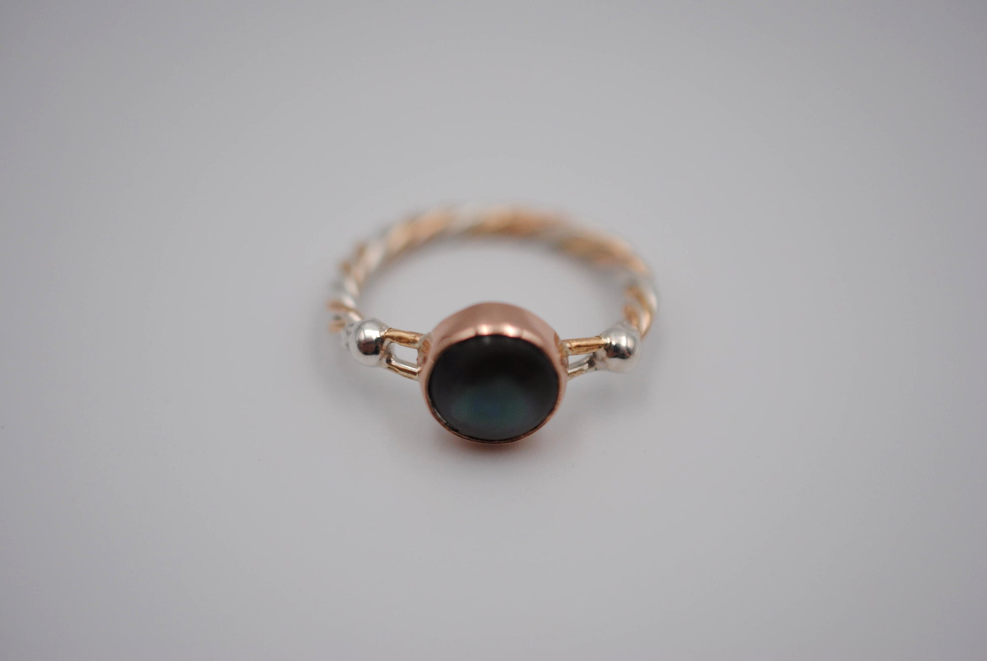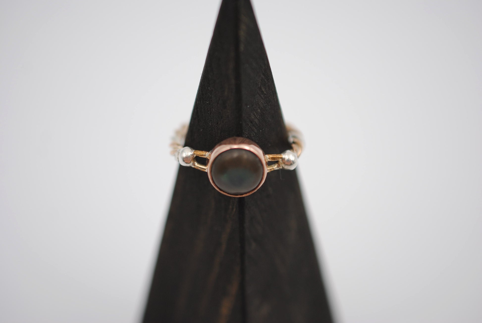This ring features a mother of pearl. This beautiful iridescent material is sourced from oysters and other molluscs. It is the only gemstone created by a life form. Not only are they beautiful and organic, they are also durable.