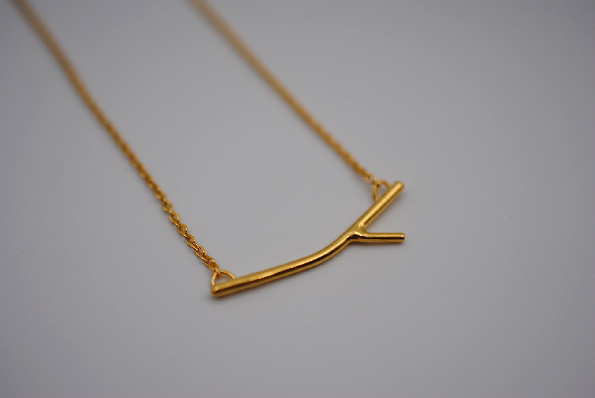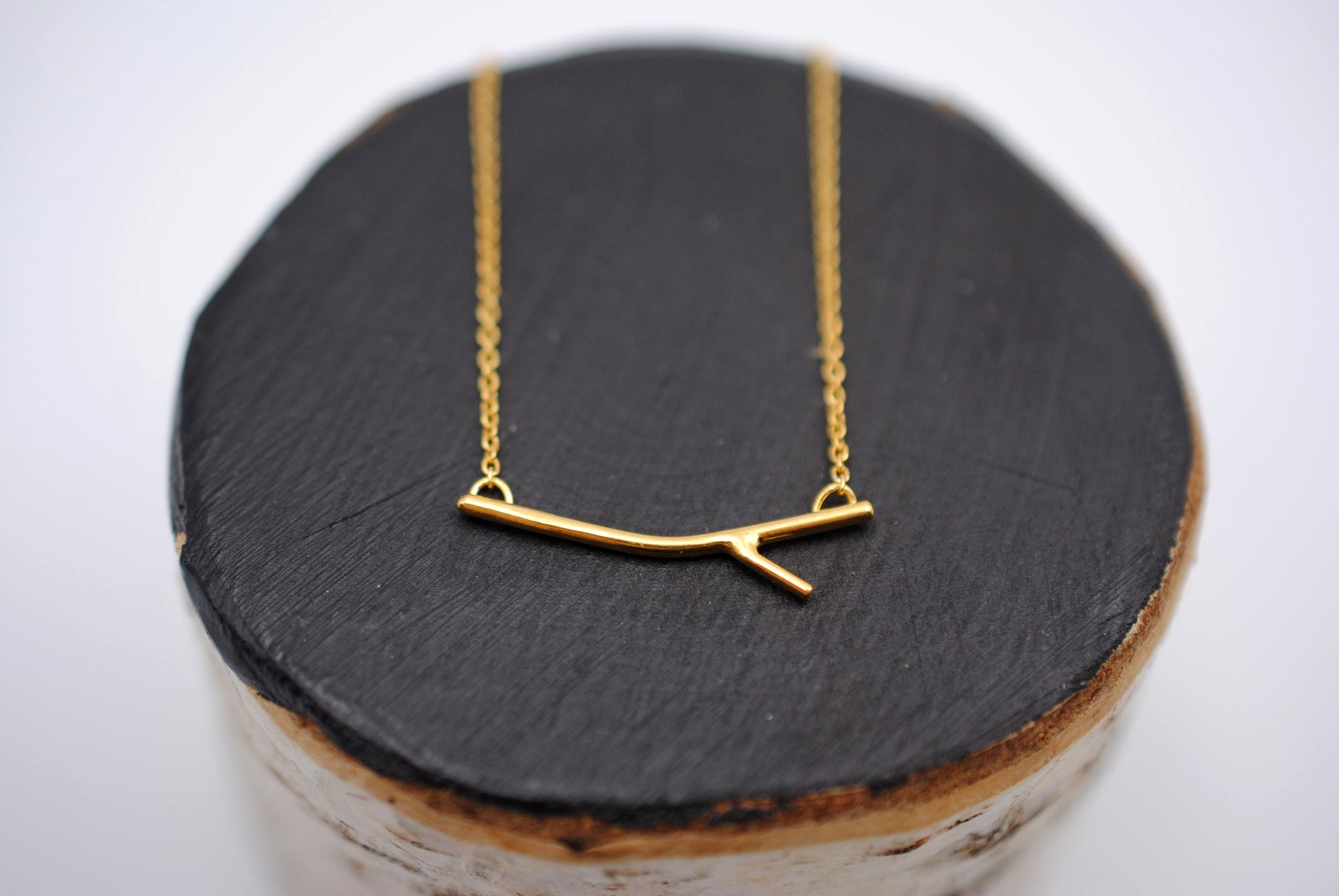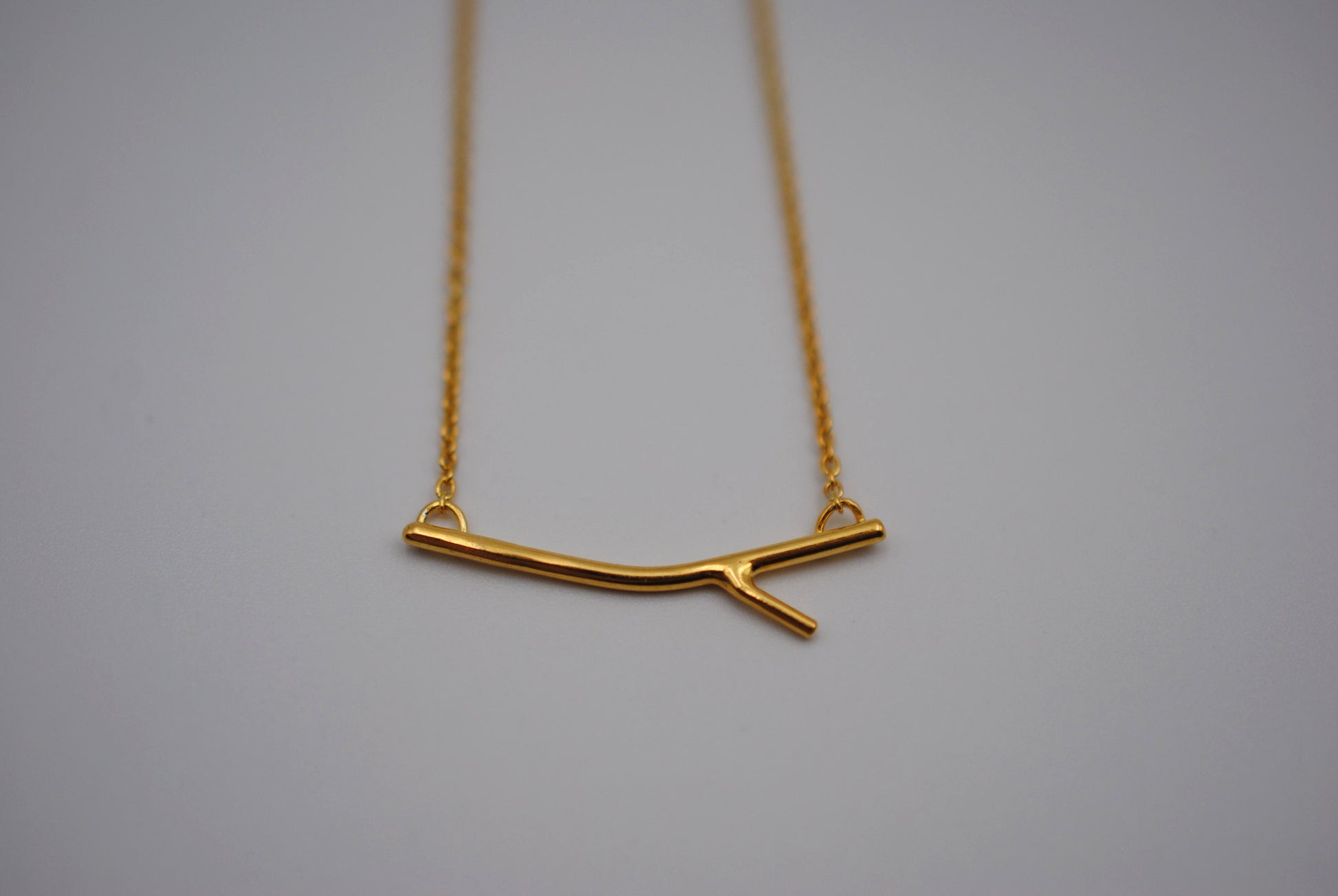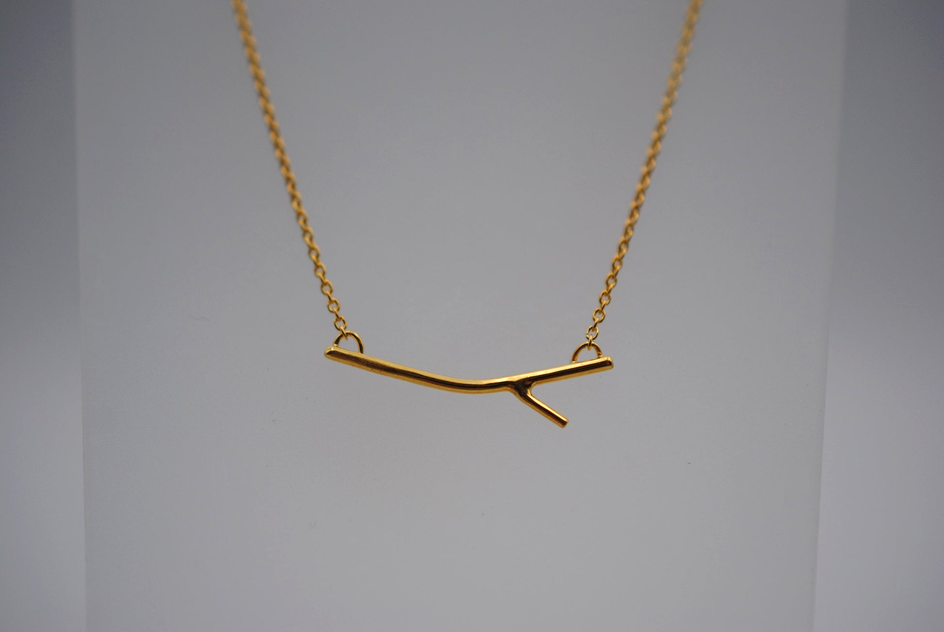 This necklace is also available in silver, rhodium, and rose gold. We also have a twig, branch, and branching necklace. Be sure to give them look.