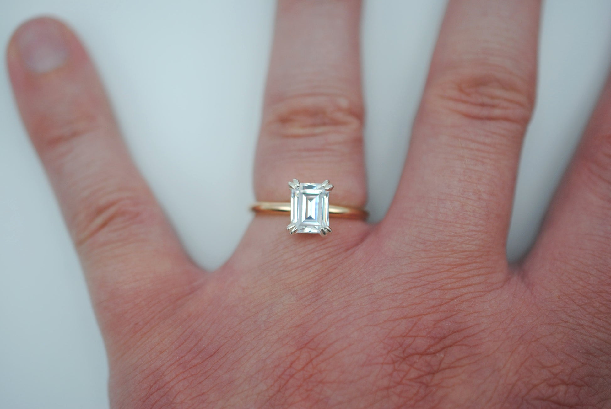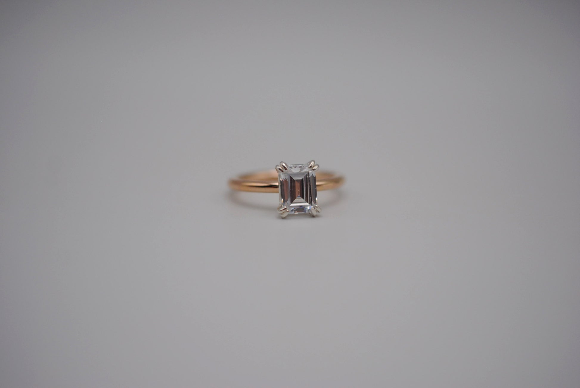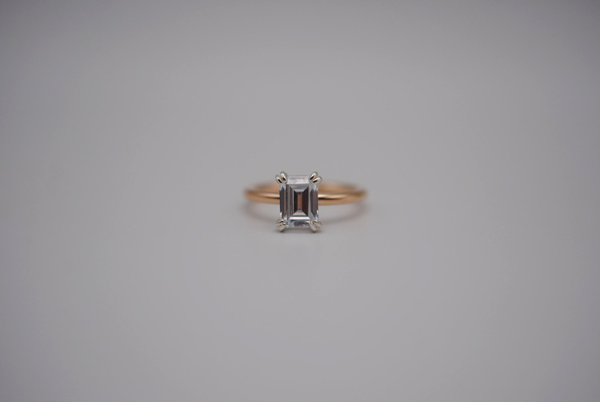 The ring features an ethically sourced 8X6mm emerald cut cubic zirconia. It's in a double prong setting.
