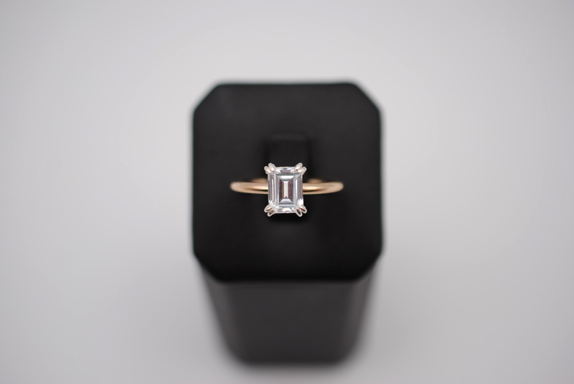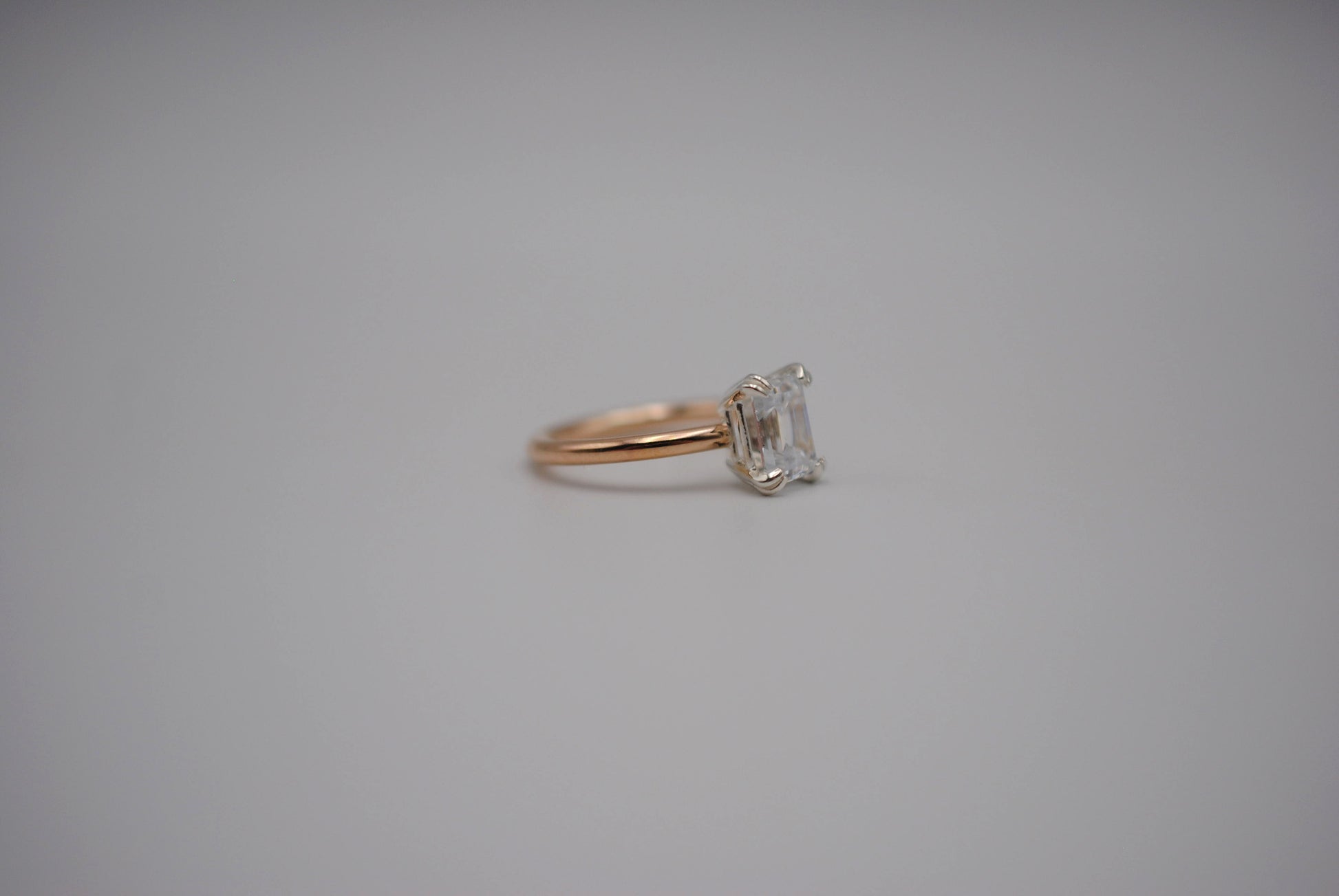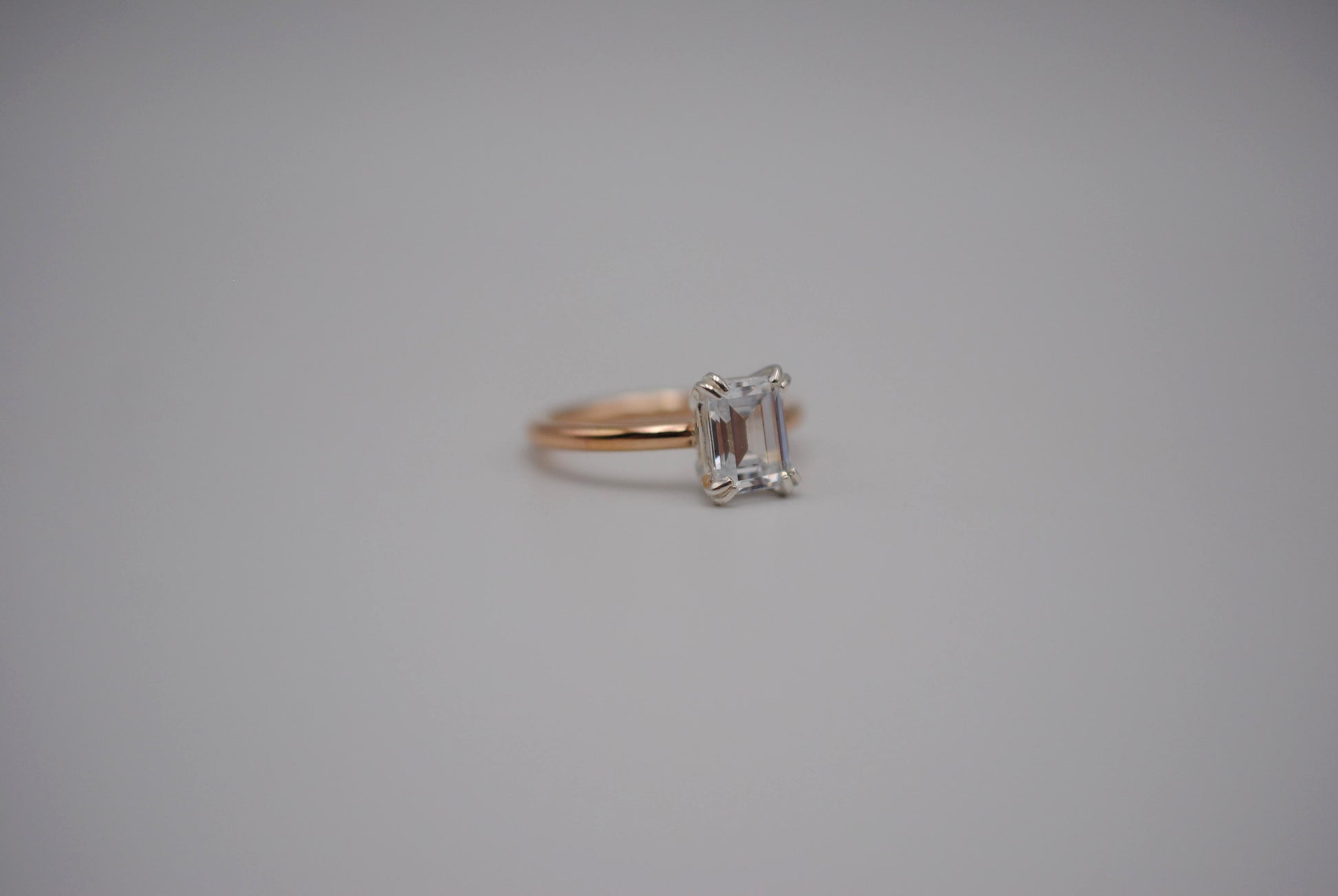 The ring features an ethically sourced 8X6mm emerald cut cubic zirconia. It's in a double prong setting.