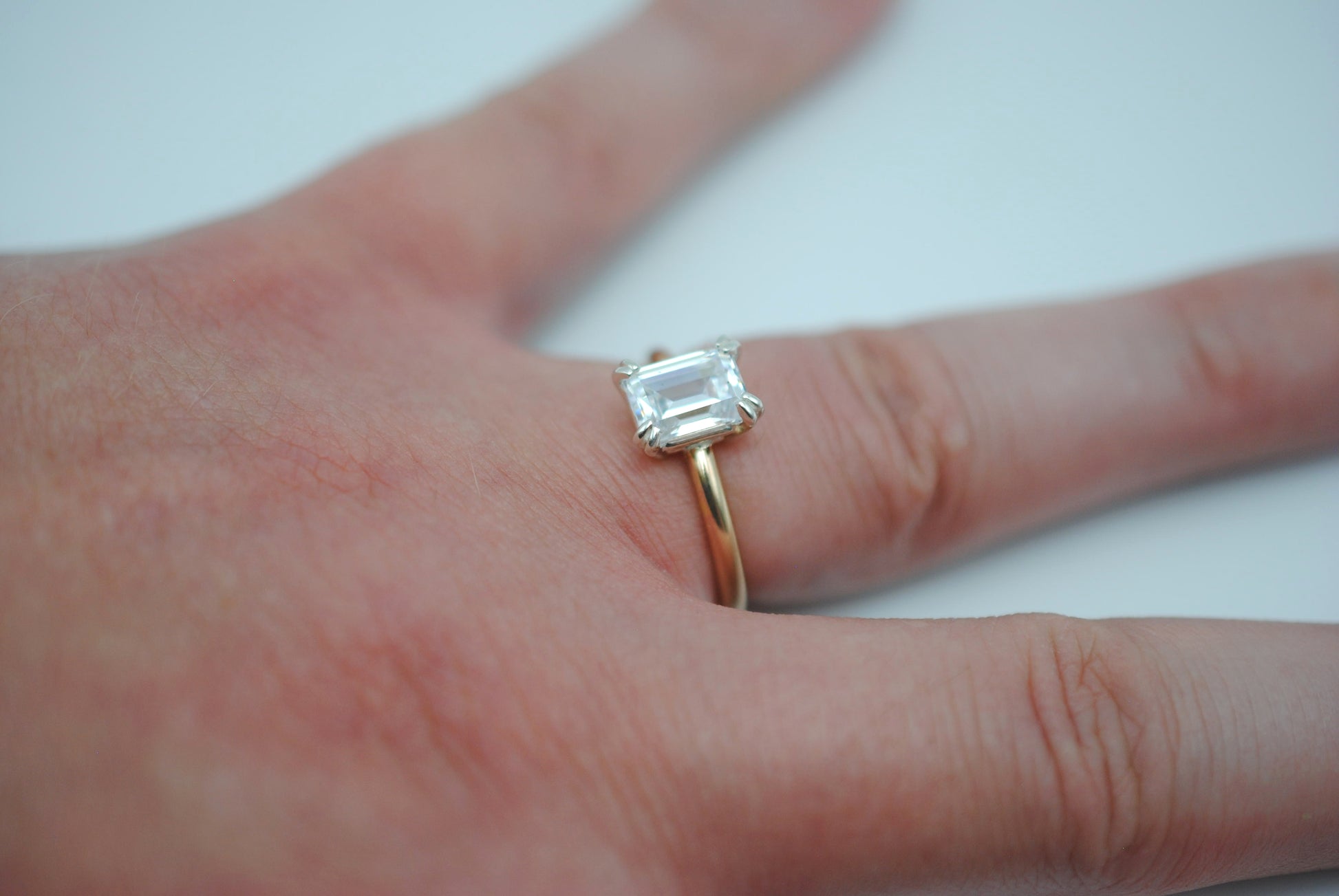 This is our Cubic Zirconia Ring: Emerald Cut, Yellow Gold Fill, Silver Setting.