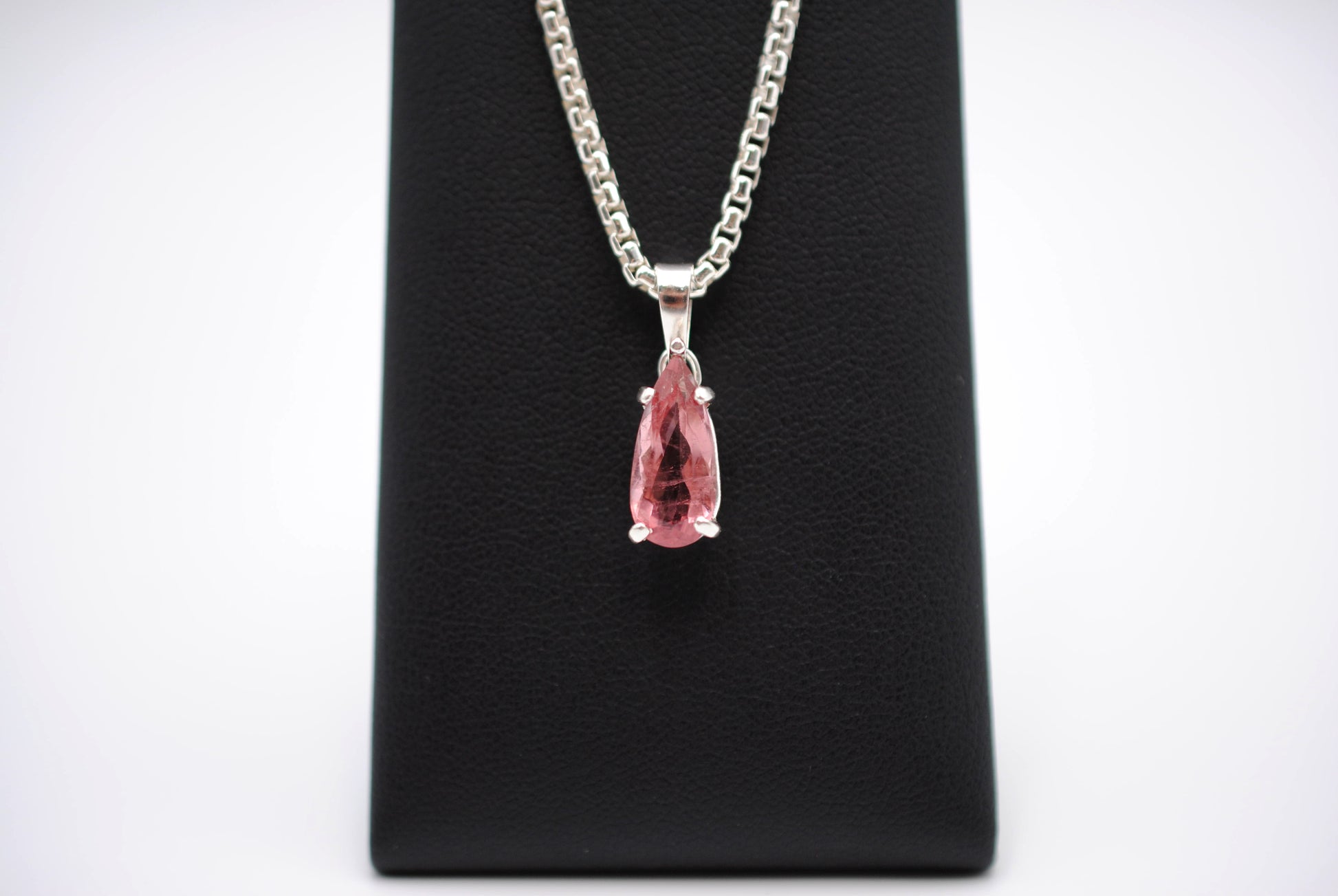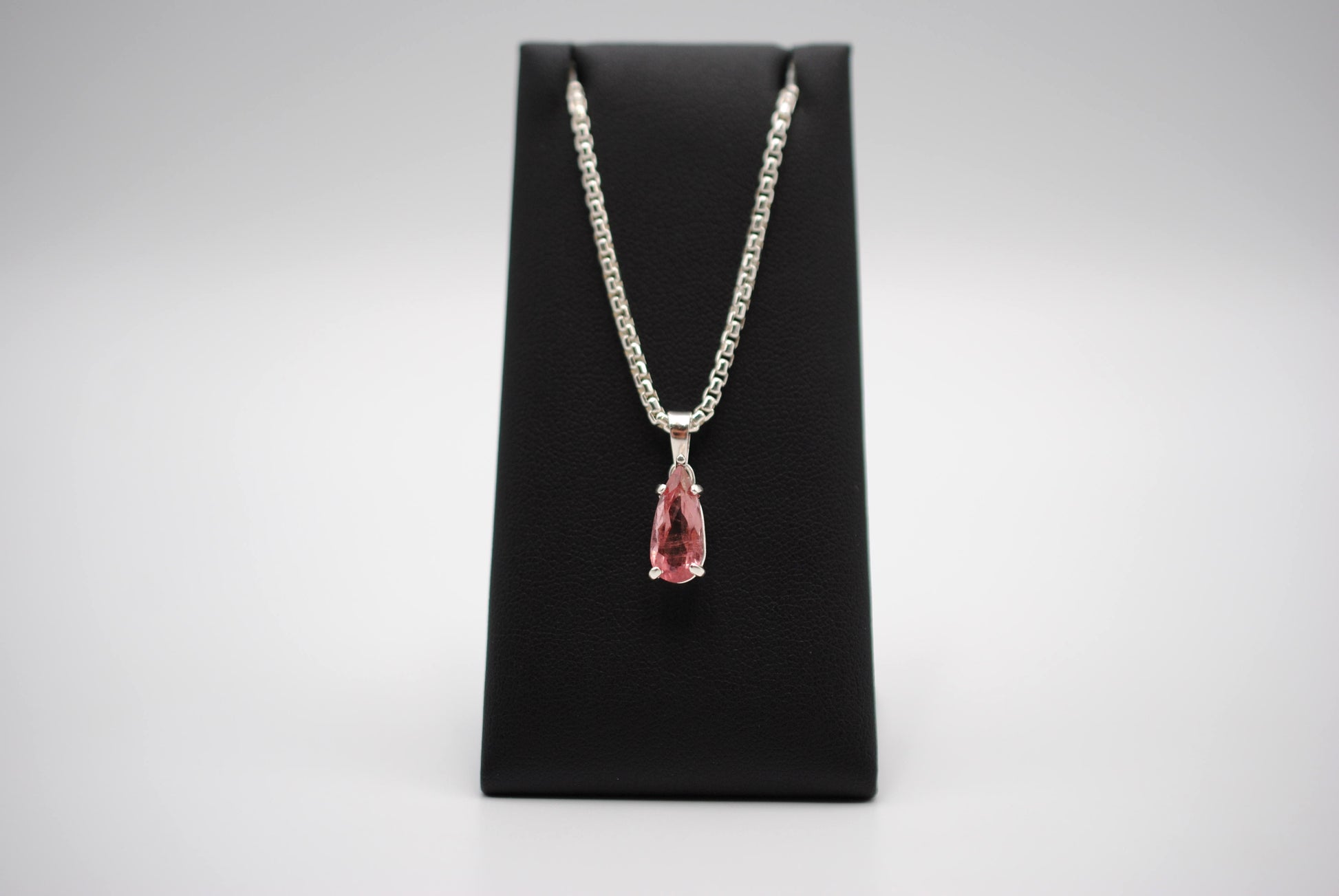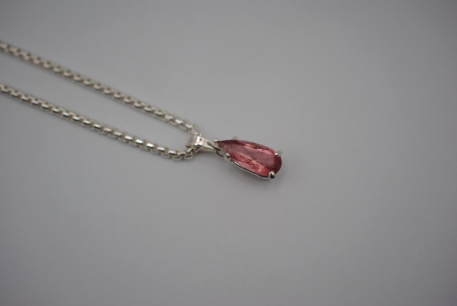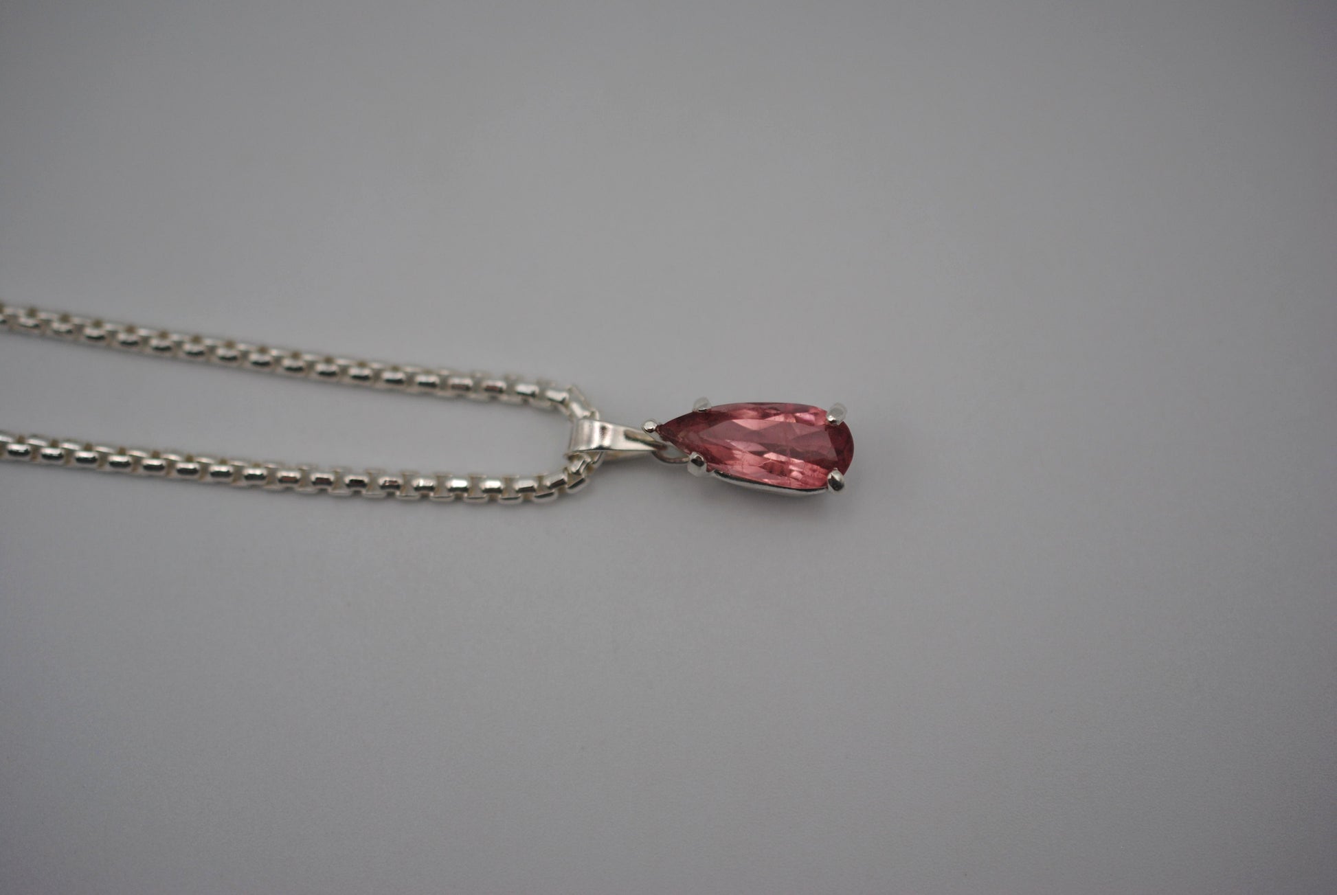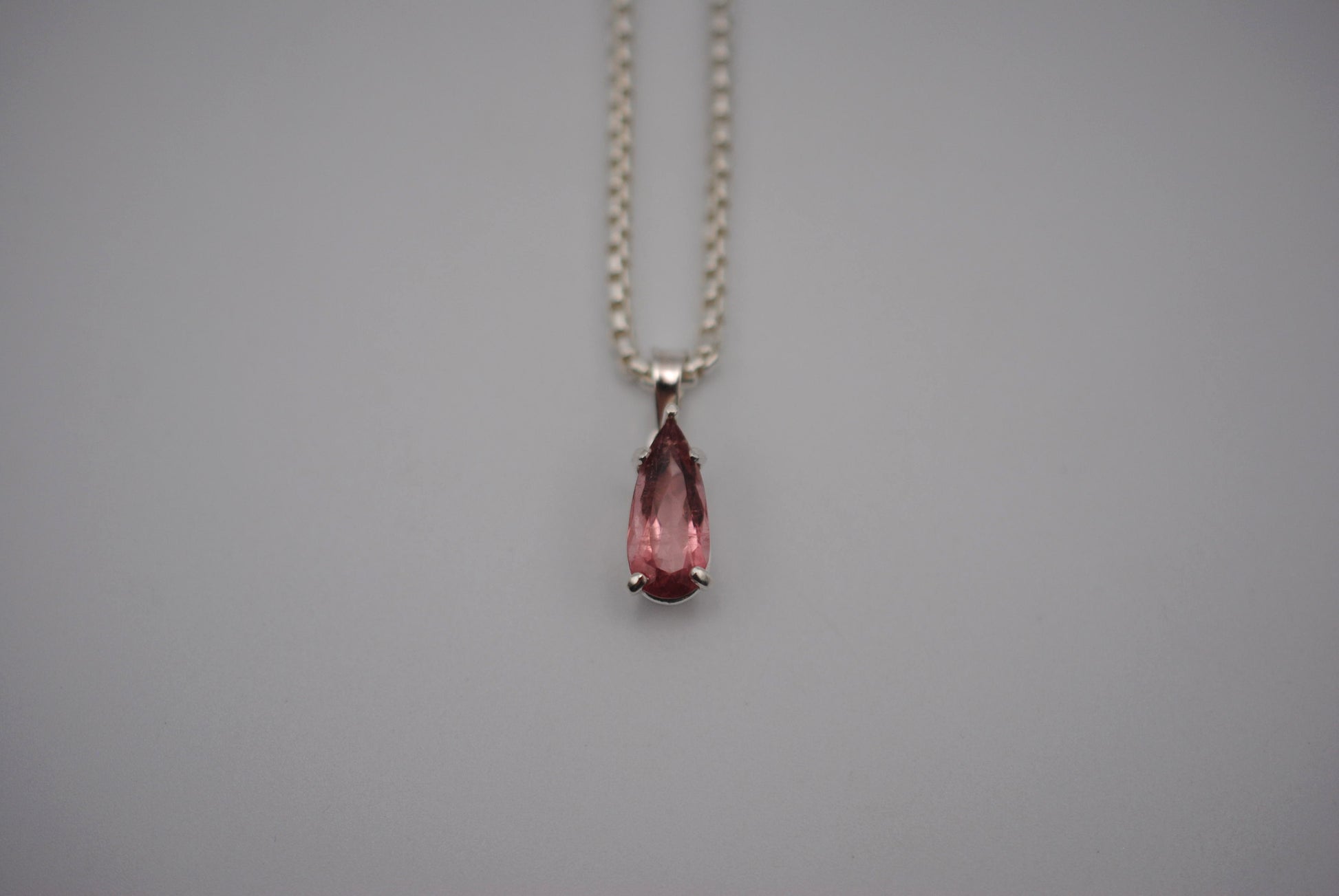 This is our Elongated Pear Pink Tourmaline Pendant Necklace on Rounded Box Chain.