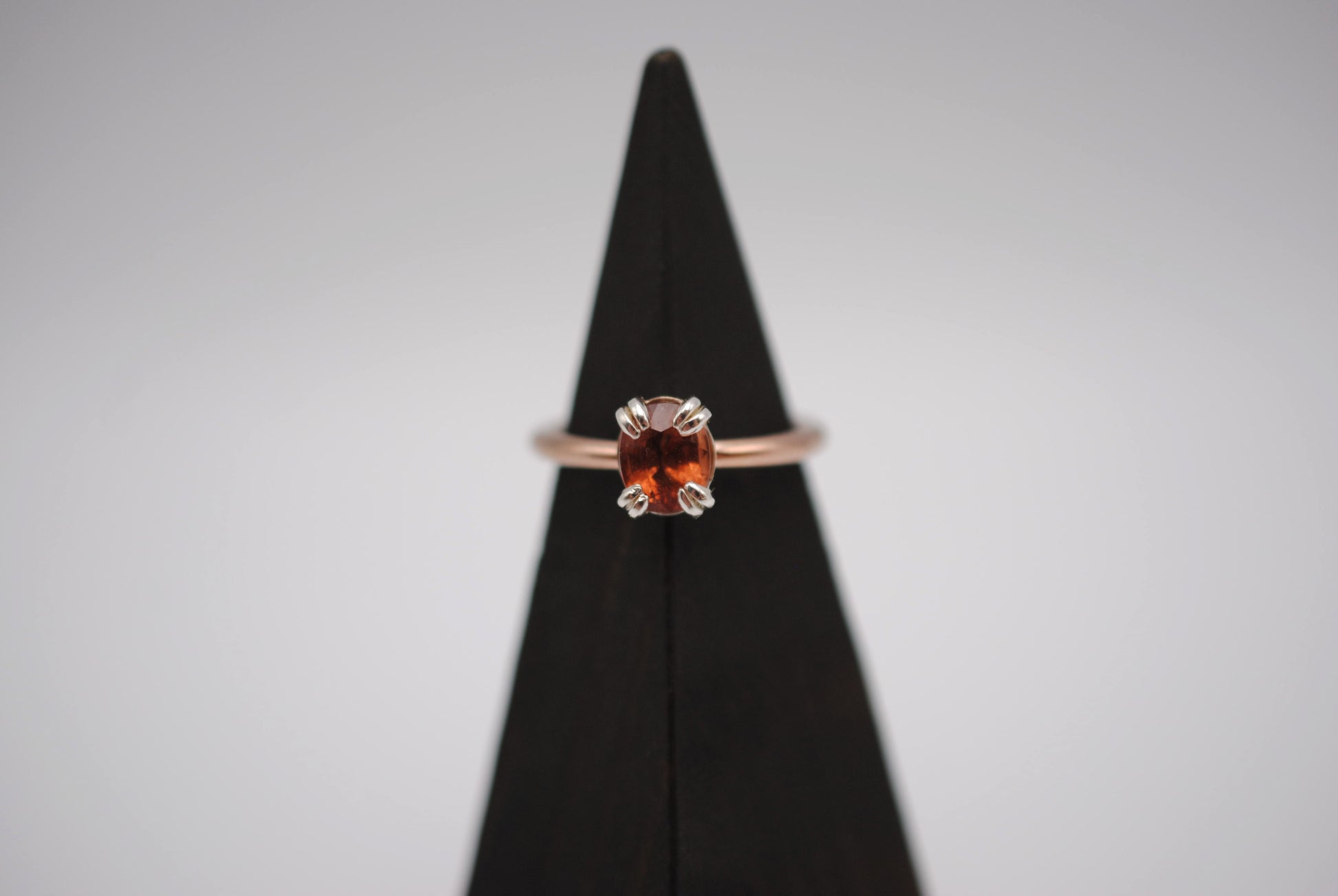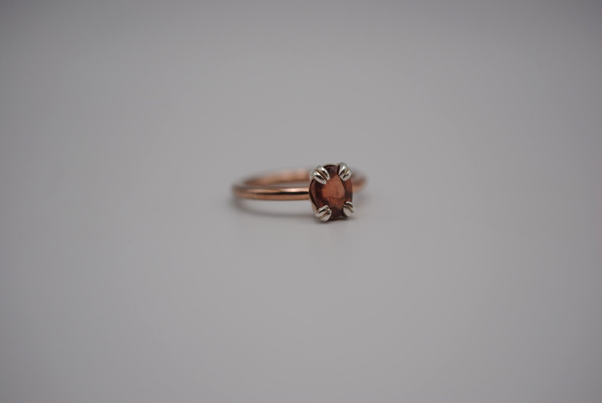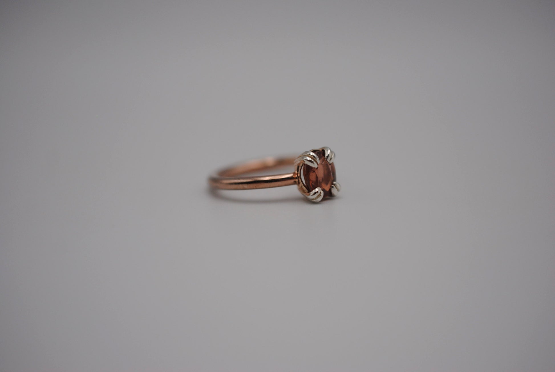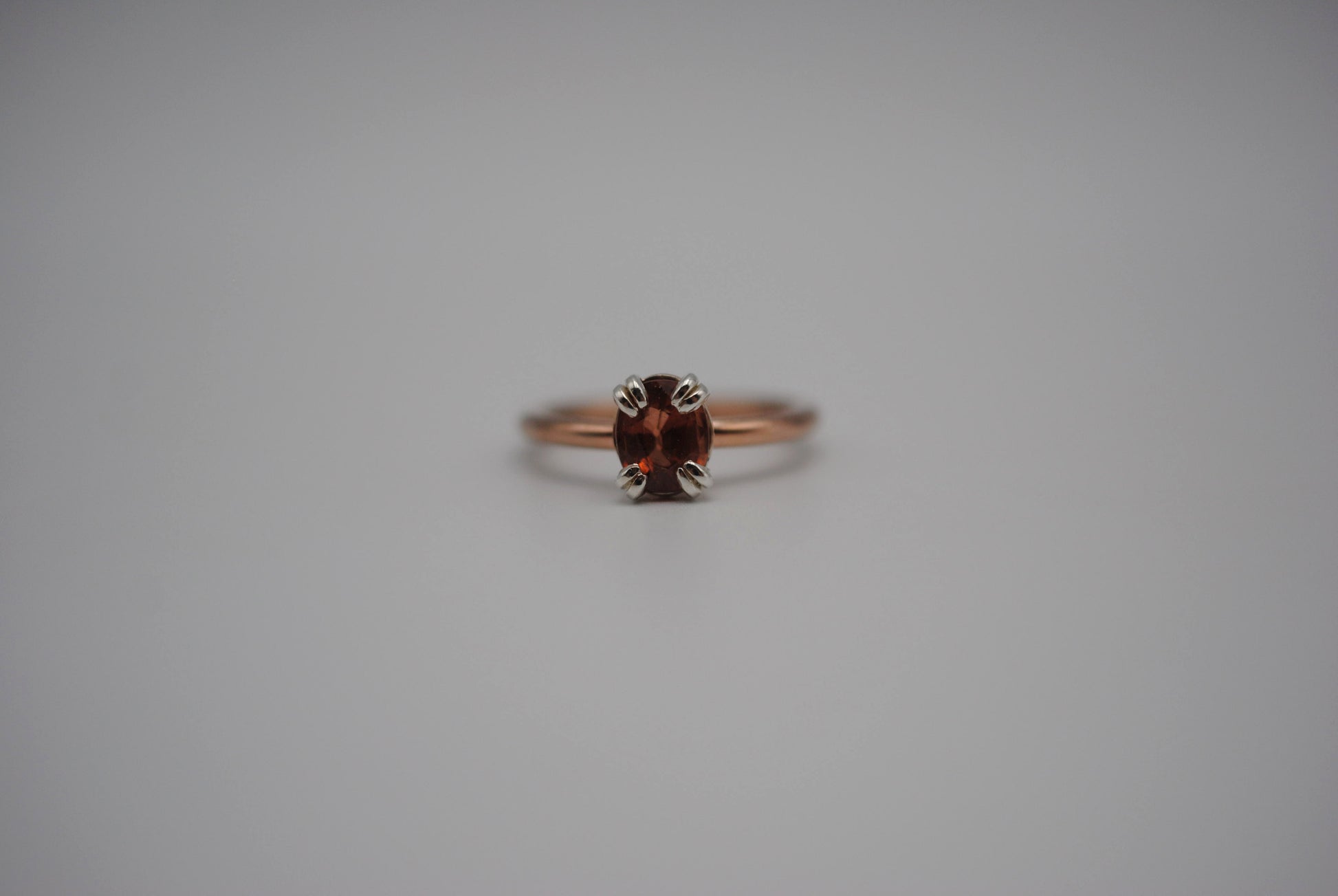 This is our Garnet Ring: Oval Cut, Rose Gold Fill, Double Prong Silver Setting.