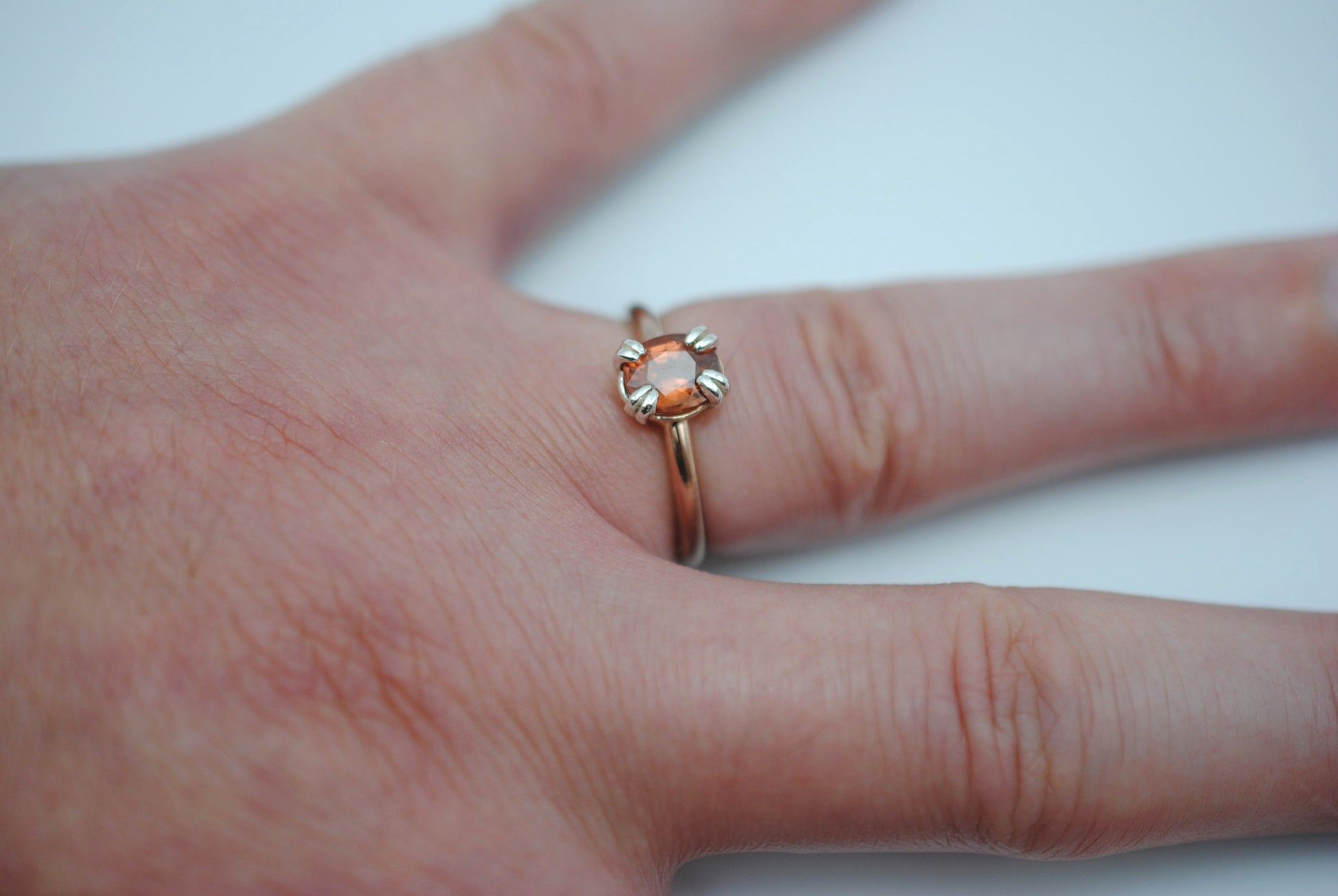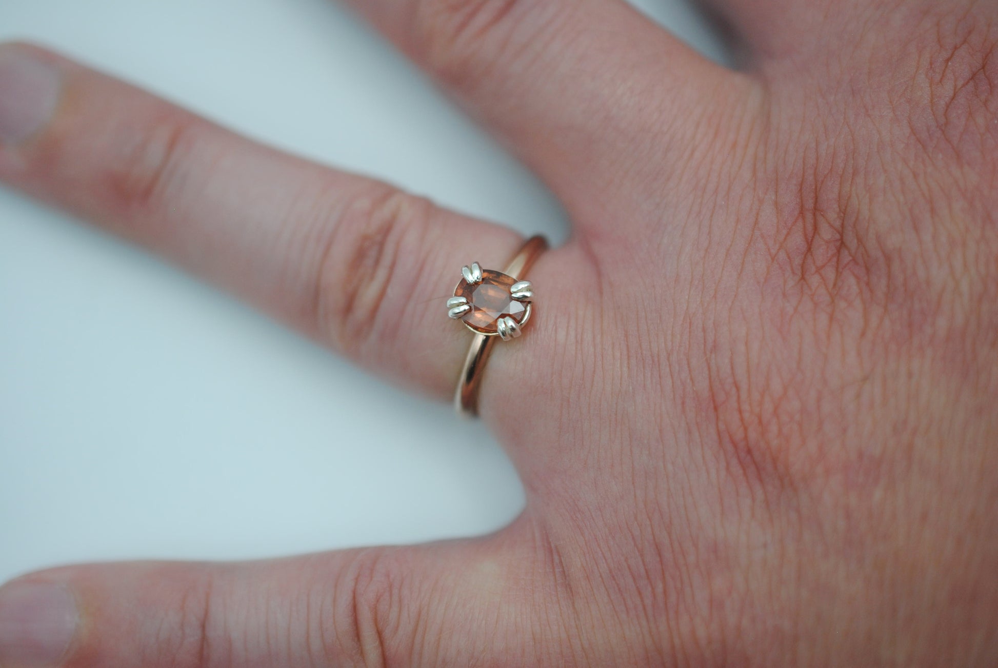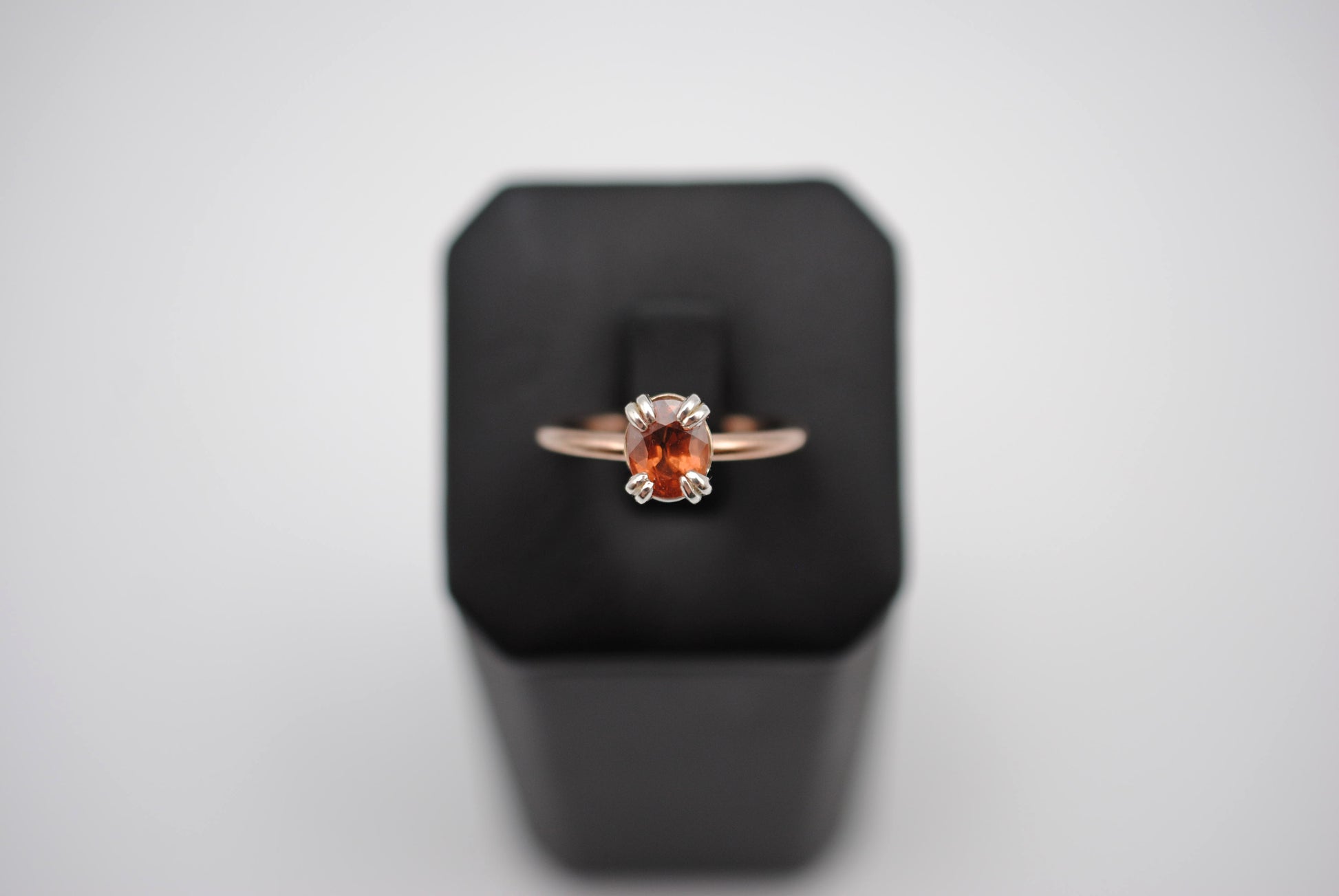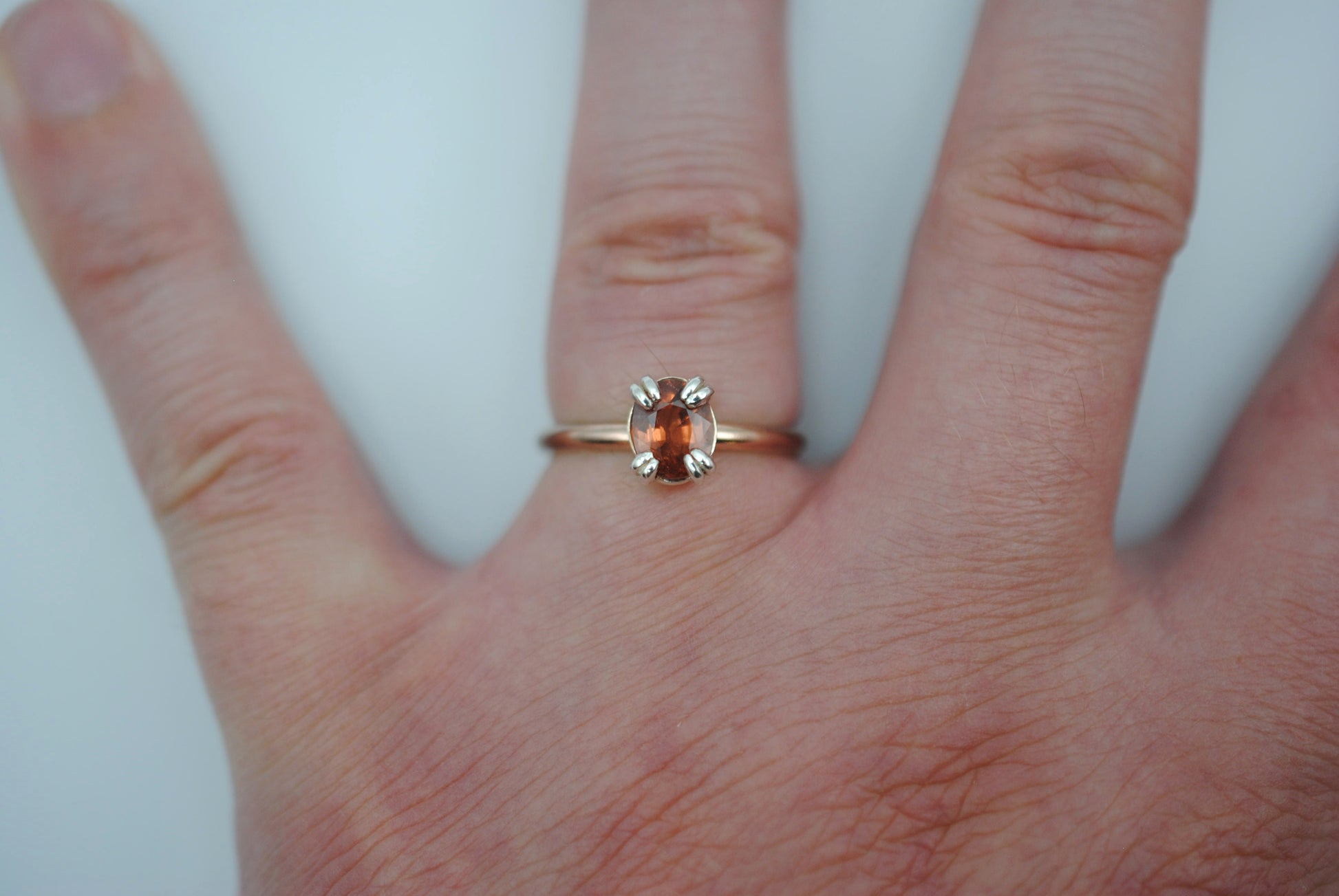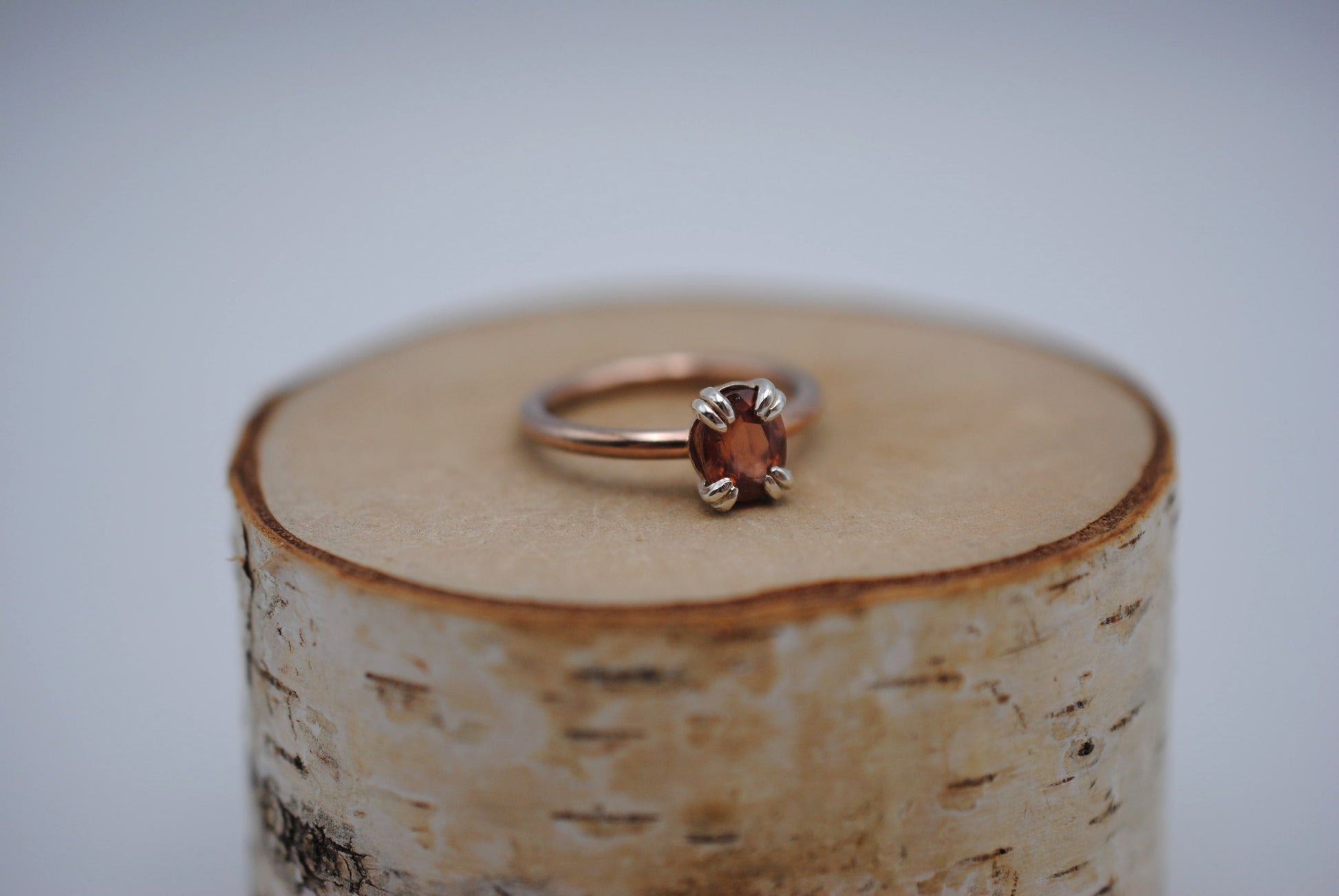 This is our Garnet Ring: Oval Cut, Rose Gold Fill, Double Prong Silver Setting.
