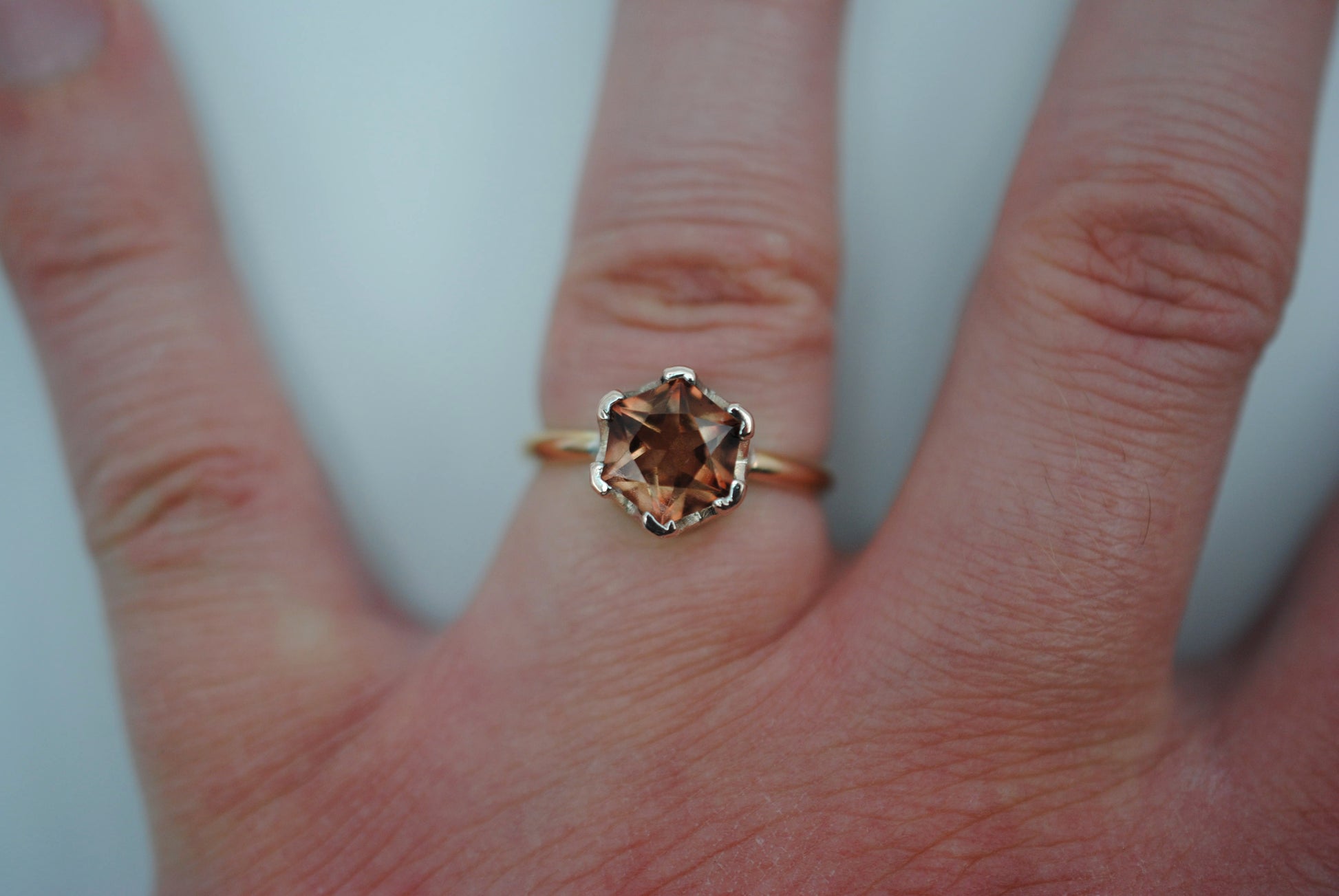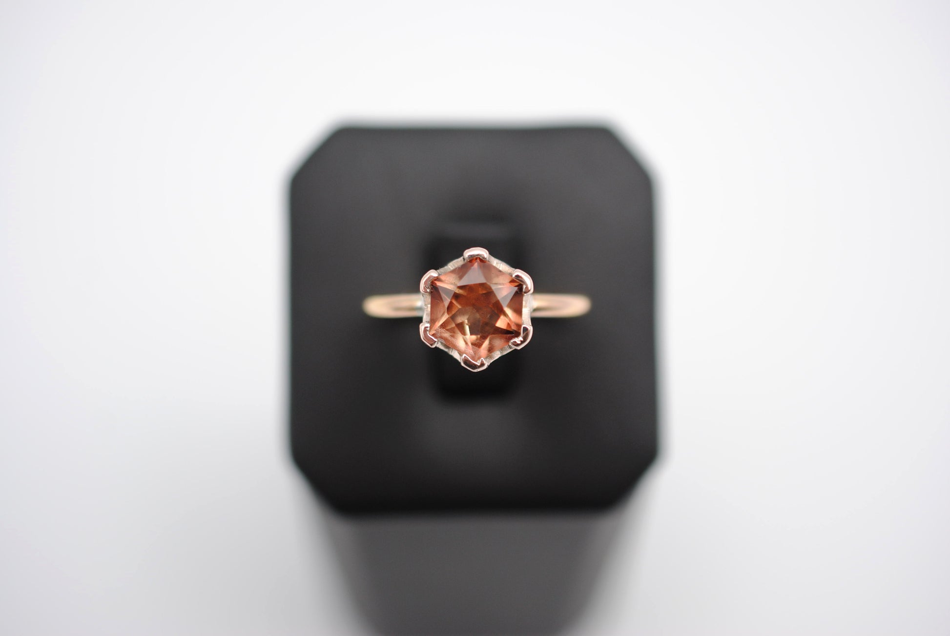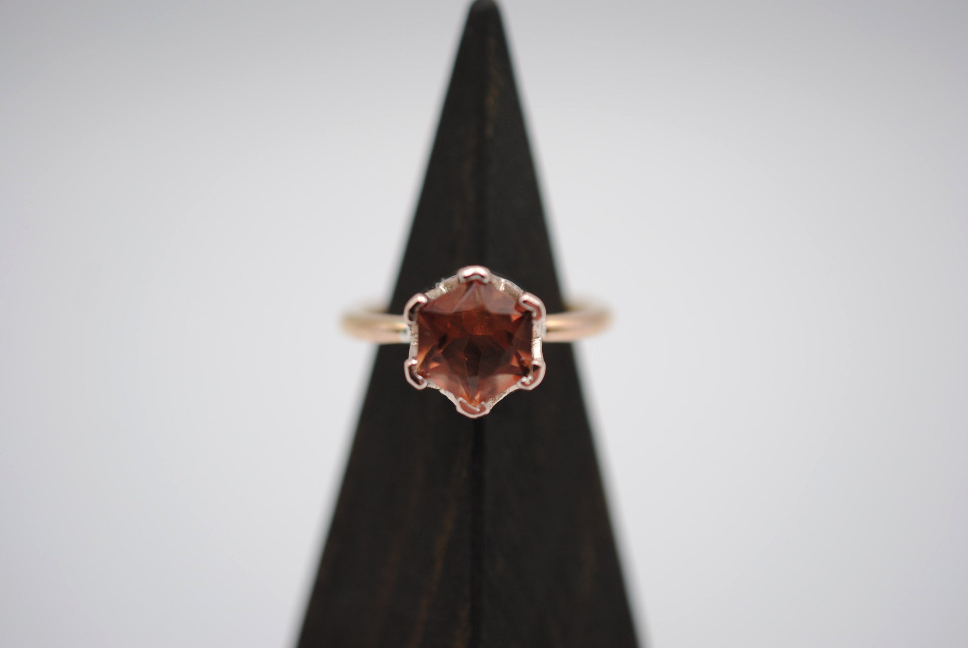 The ring features an ethically sourced natural and untreated 8mm hexagon cut Oregon Sunstone. This sunstone has a burnt orange to champagne yellow bi-color with lots of schiller. Schiller is the copper inclusions that look like glitter within the gemstone. Unlike diamond inclusions, these inclusions add value to the sunstones.