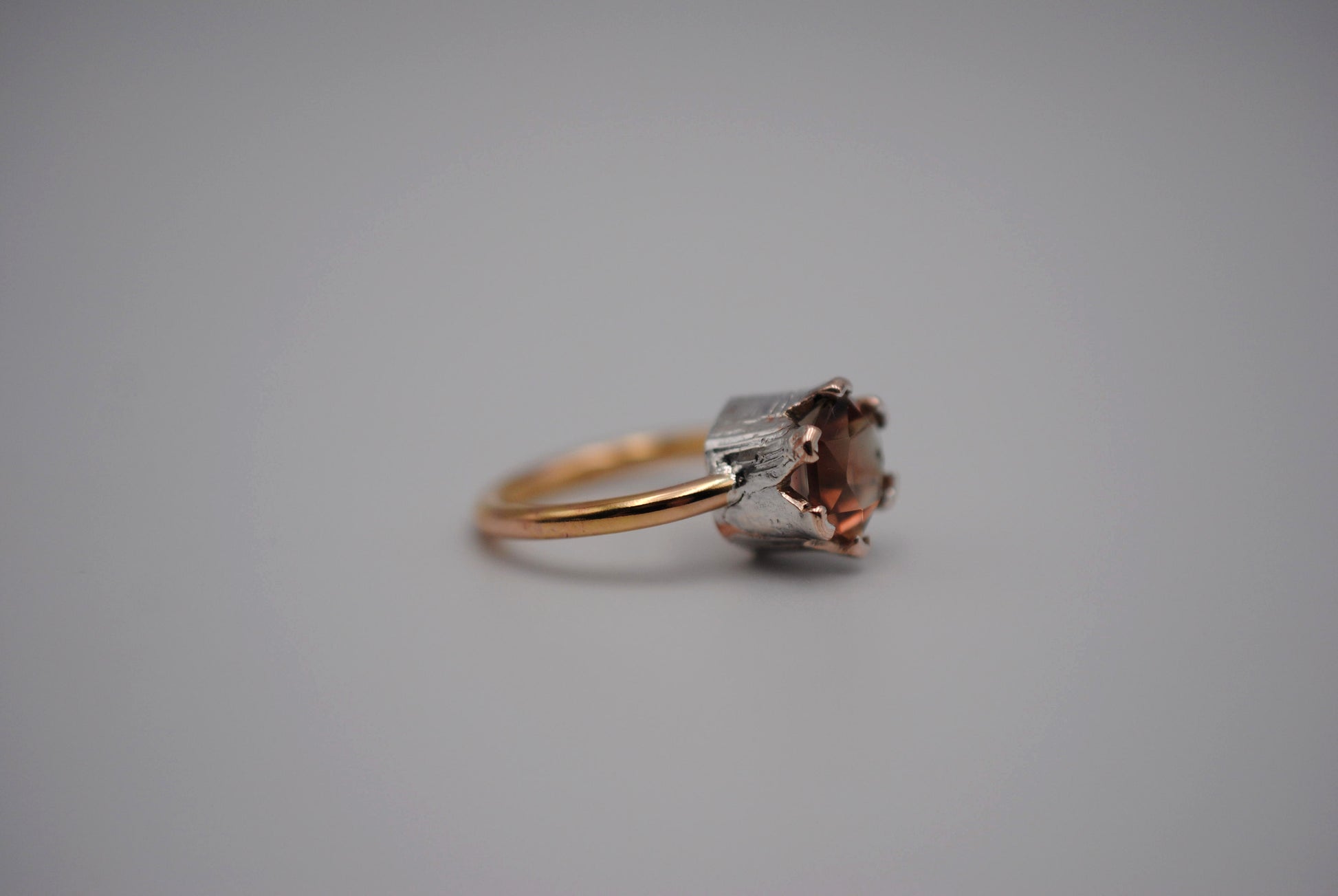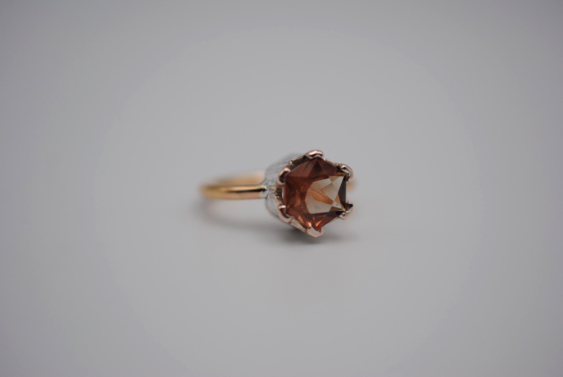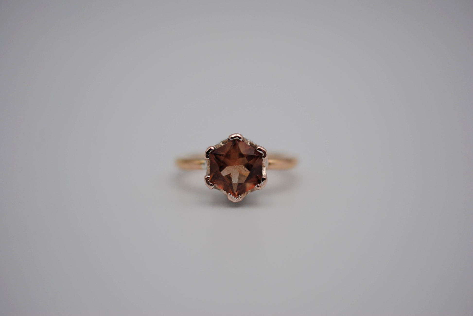 The ring features an ethically sourced natural and untreated 8mm hexagon cut Oregon Sunstone. This sunstone has a burnt orange to champagne yellow bi-color with lots of schiller. Schiller is the copper inclusions that look like glitter within the gemstone. Unlike diamond inclusions, these inclusions add value to the sunstones.