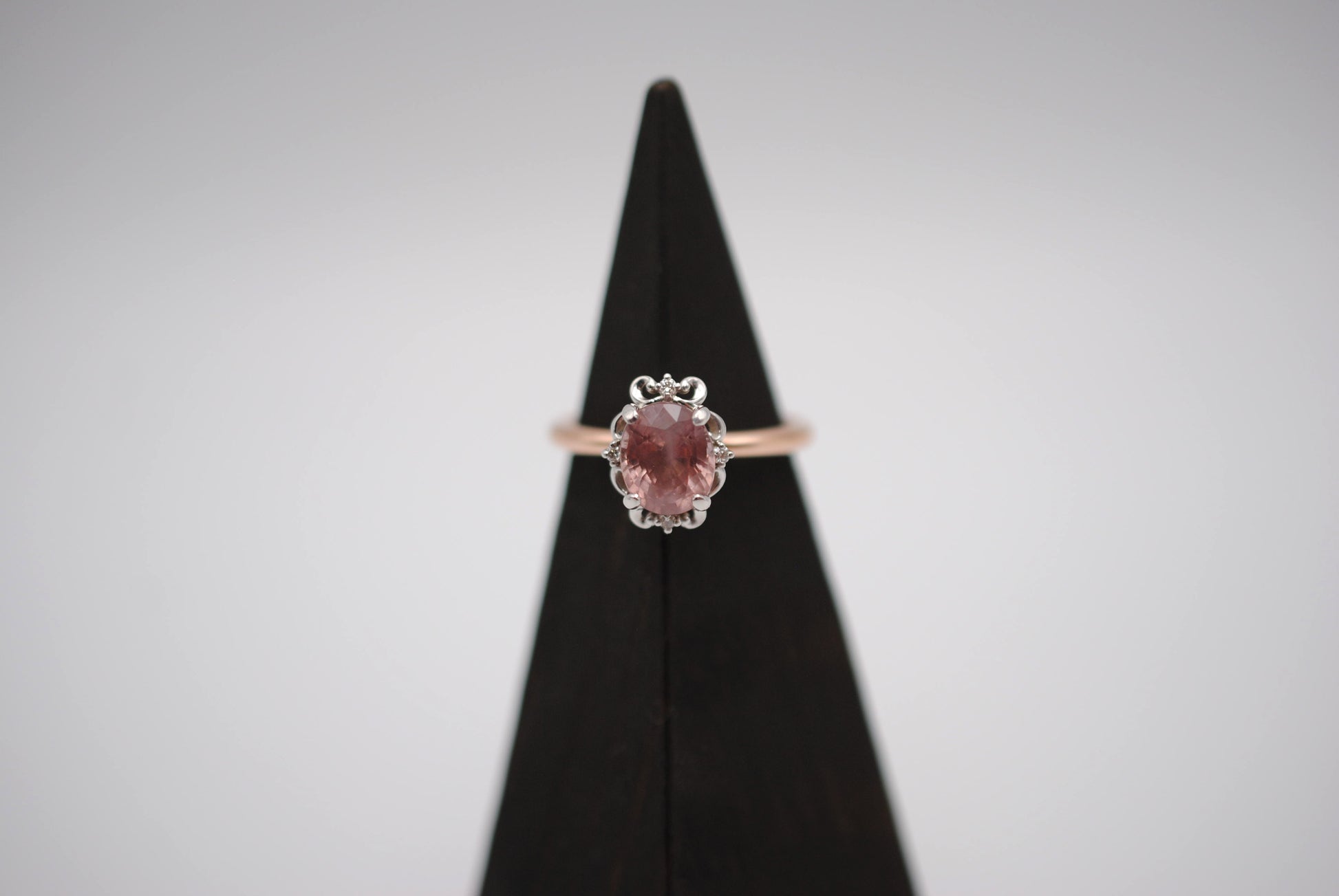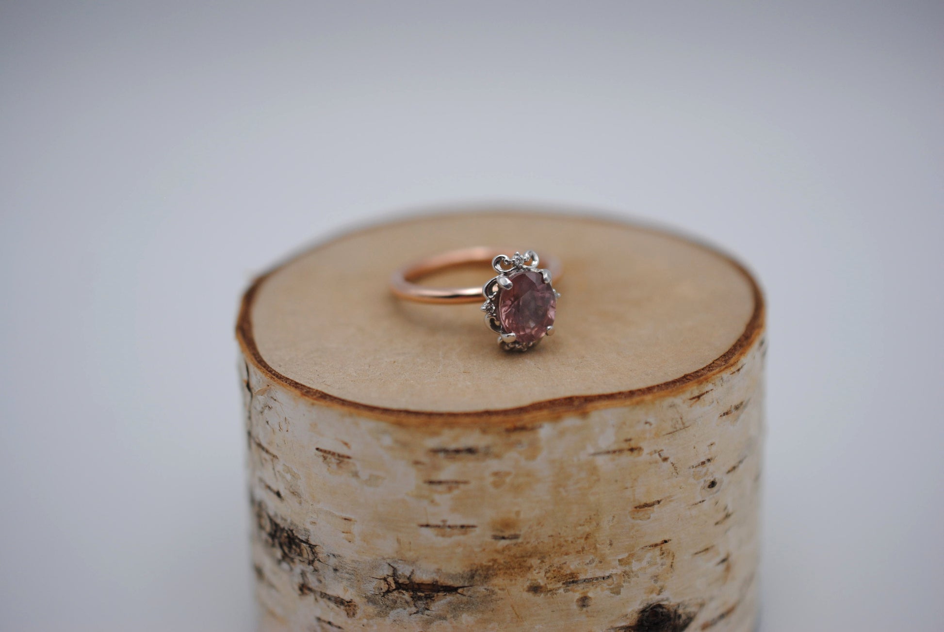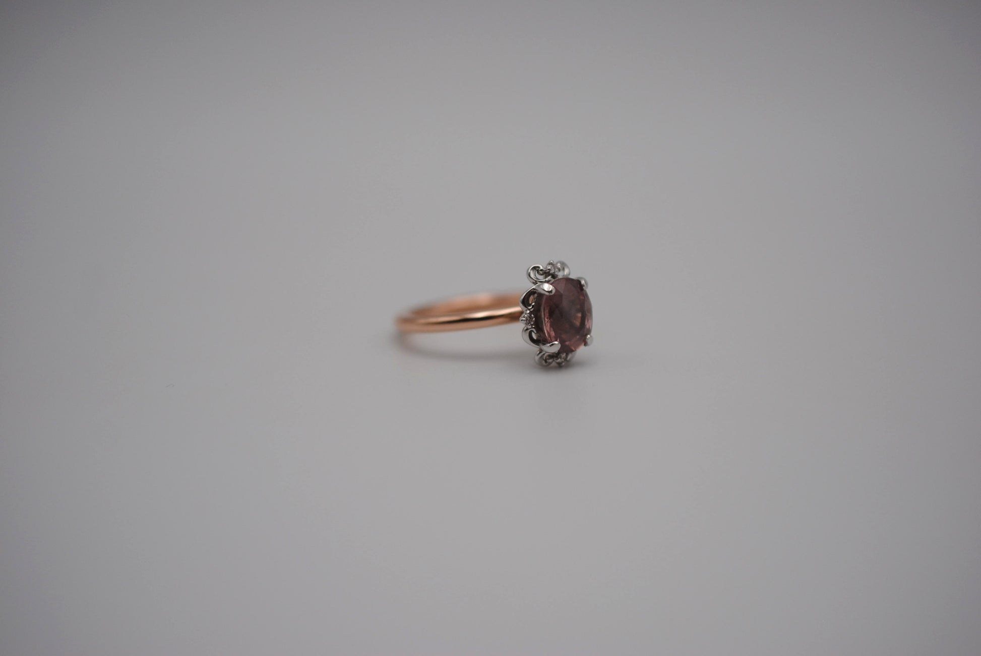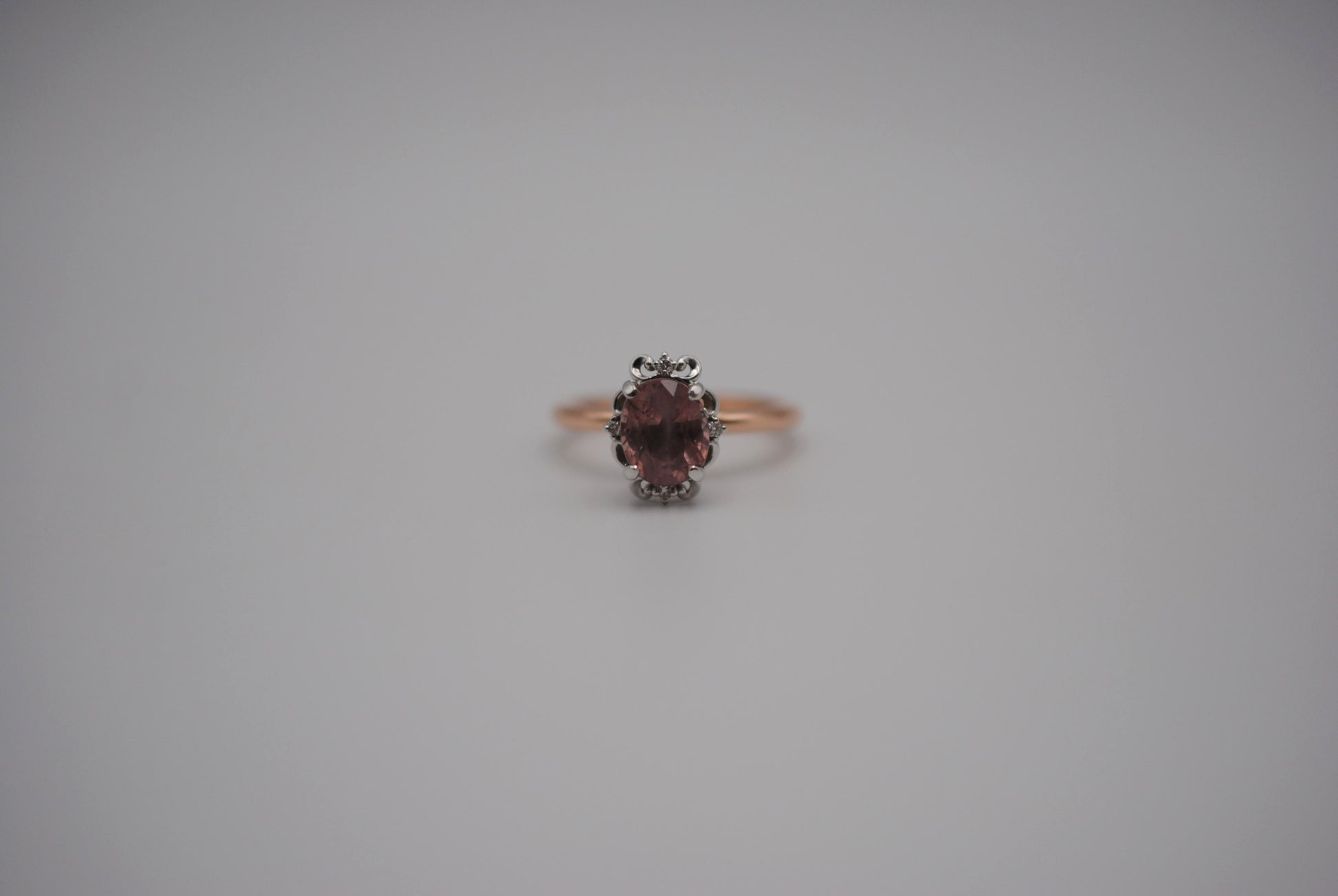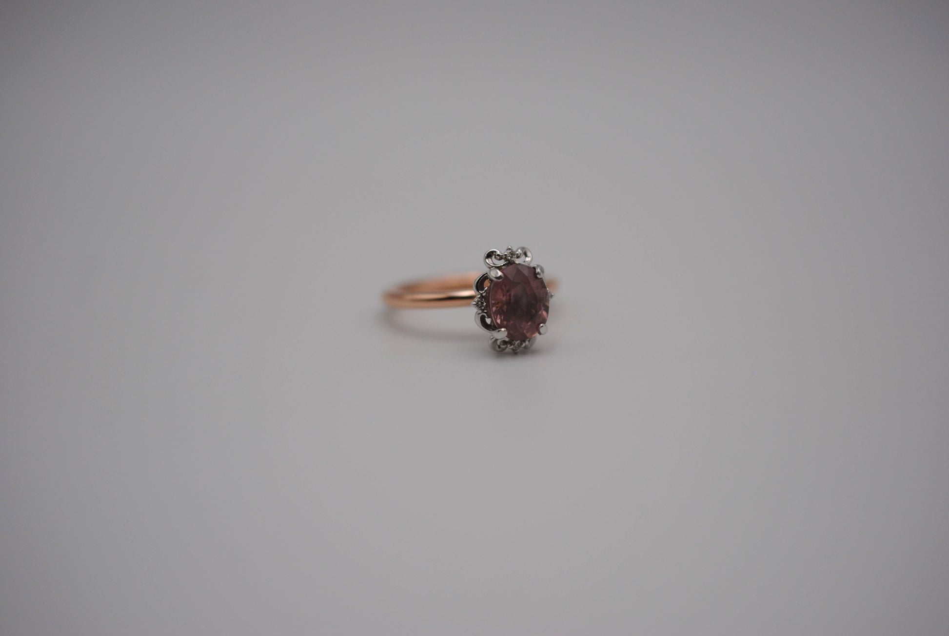 Malaia Garnet Ring: Oval Cut, Rose Gold Fill Band, White Gold Vintage Diamond Setting.