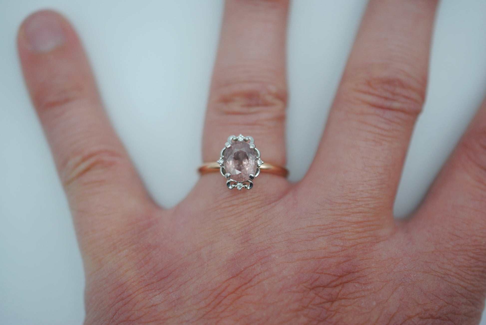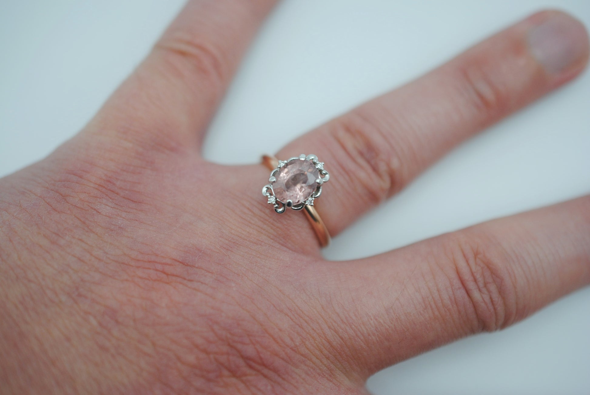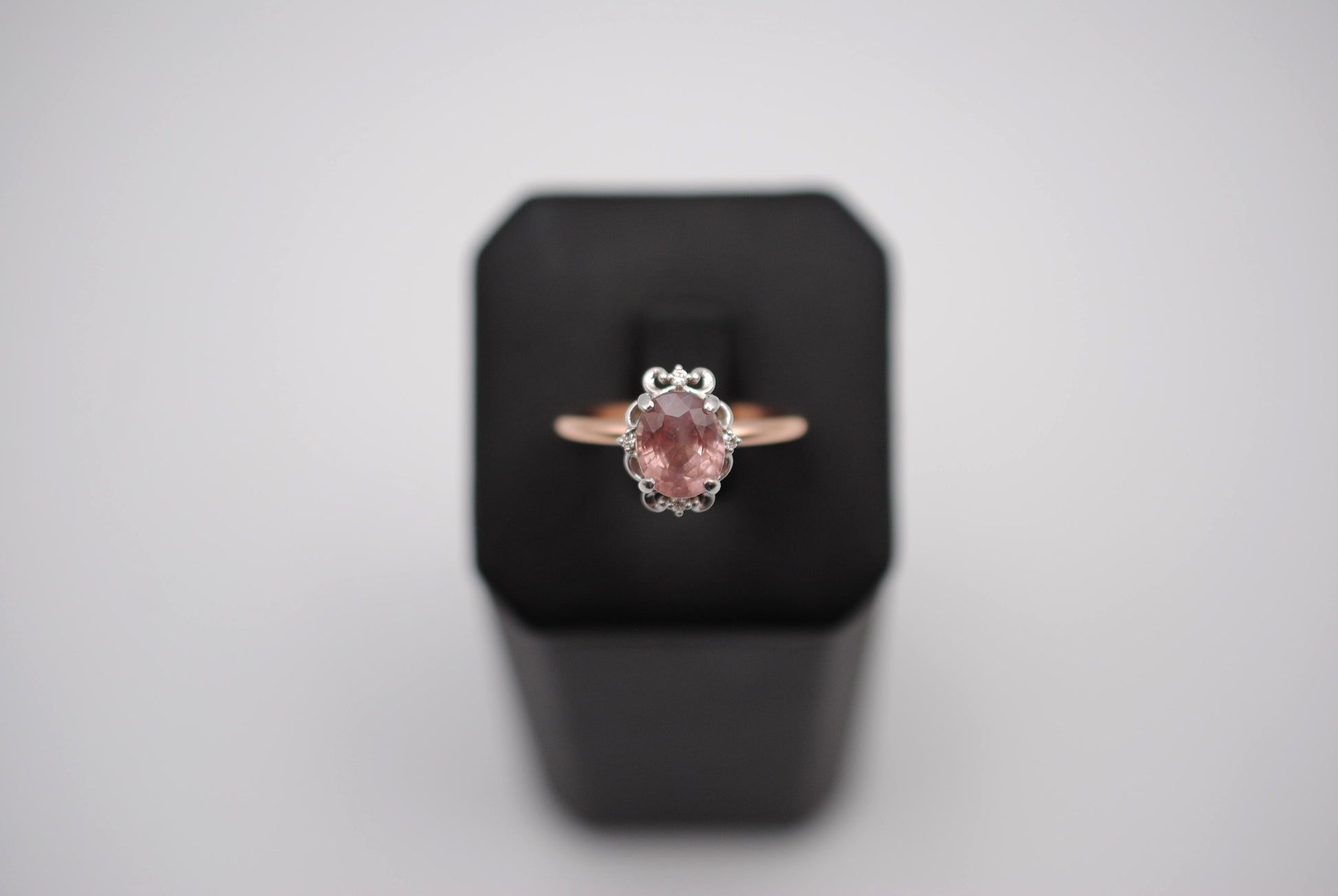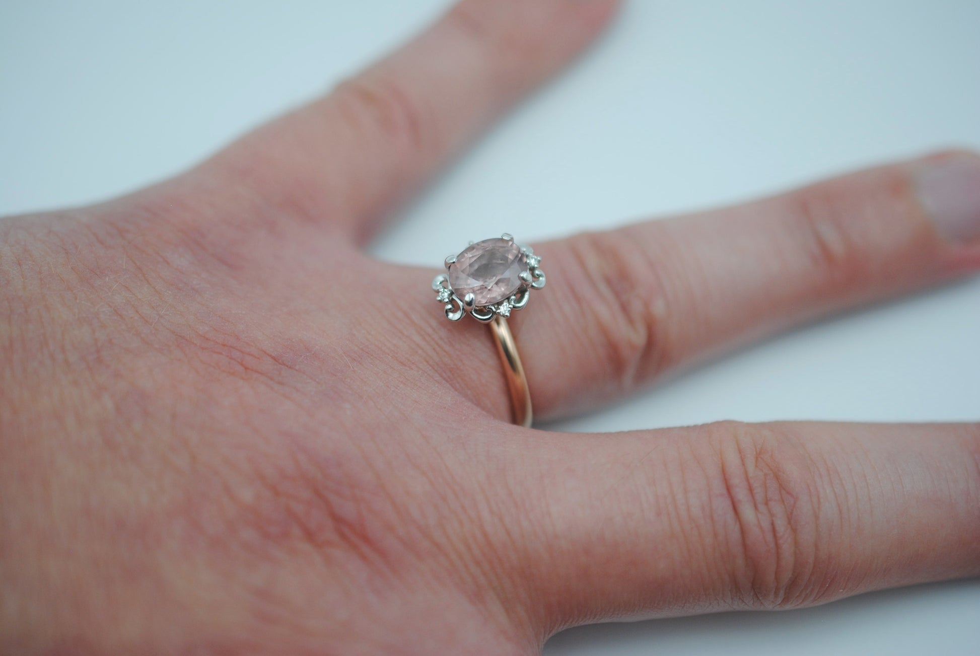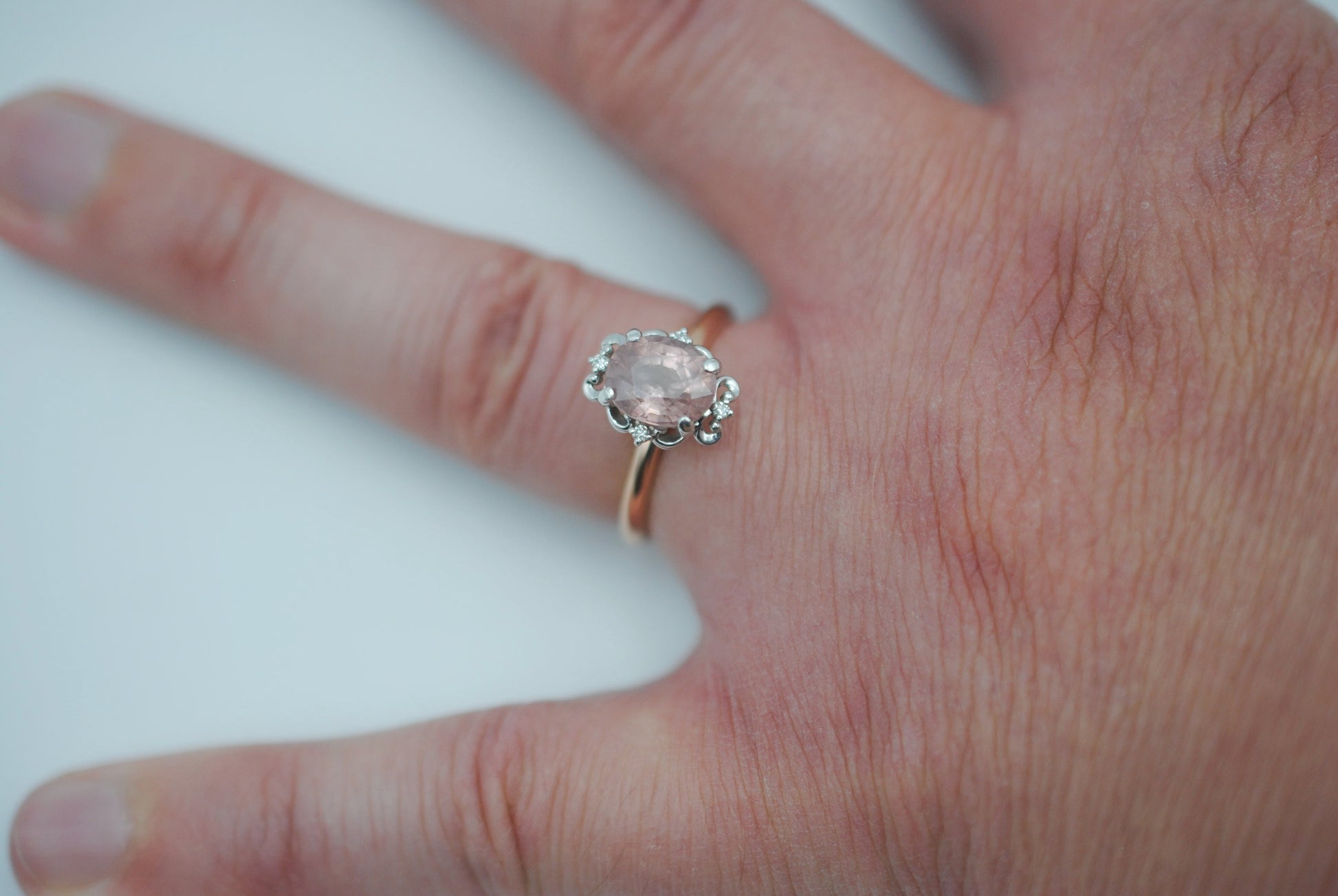 Malaia Garnet Ring: Oval Cut, Rose Gold Fill Band, White Gold Vintage Diamond Setting.