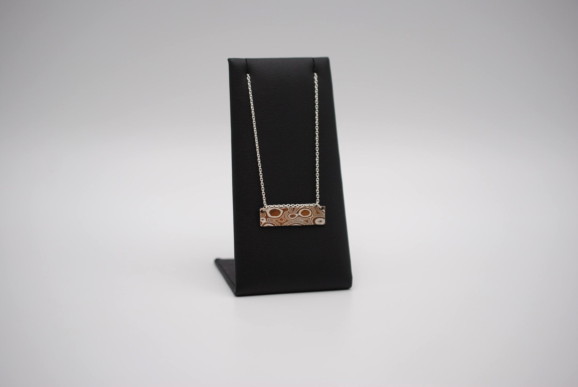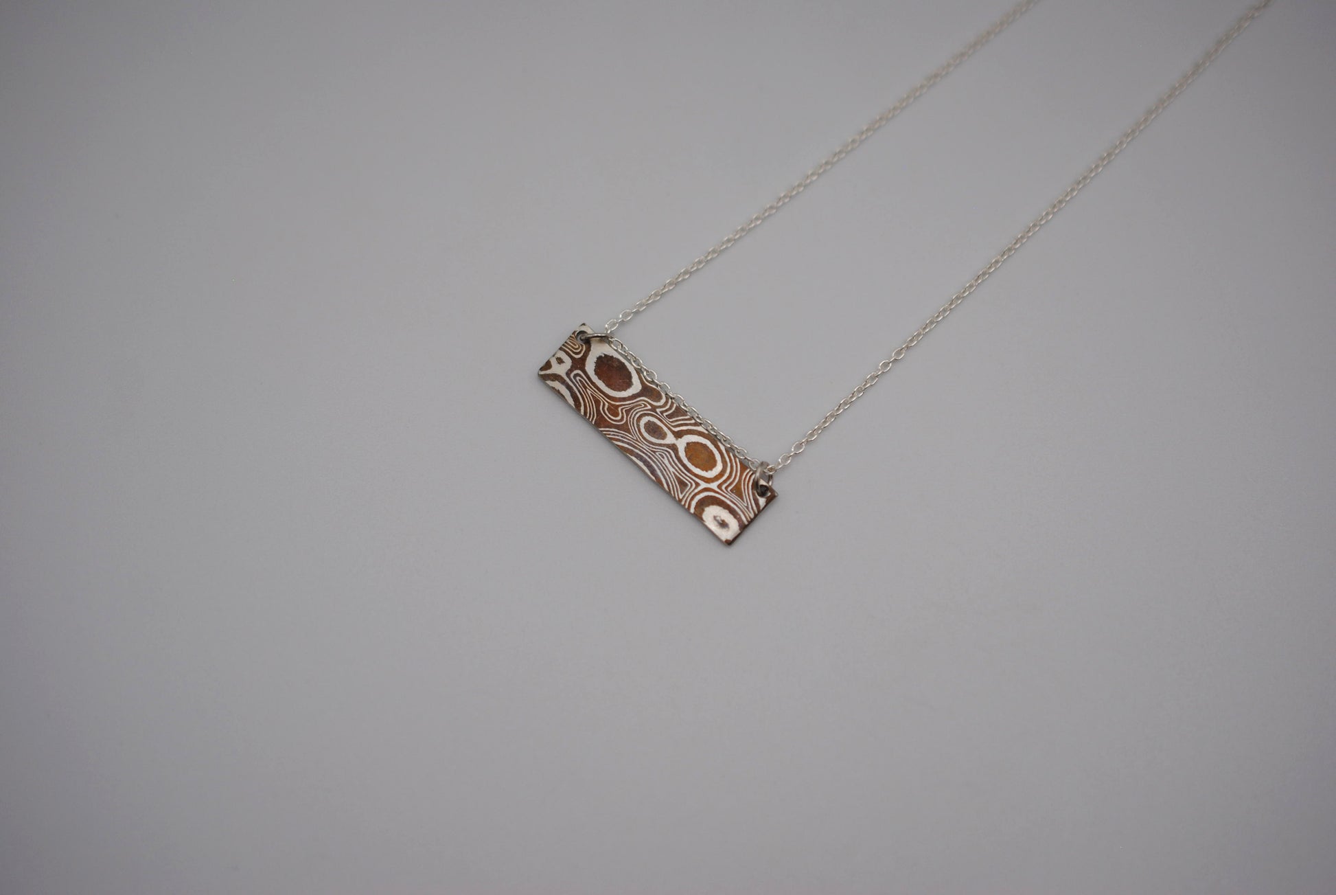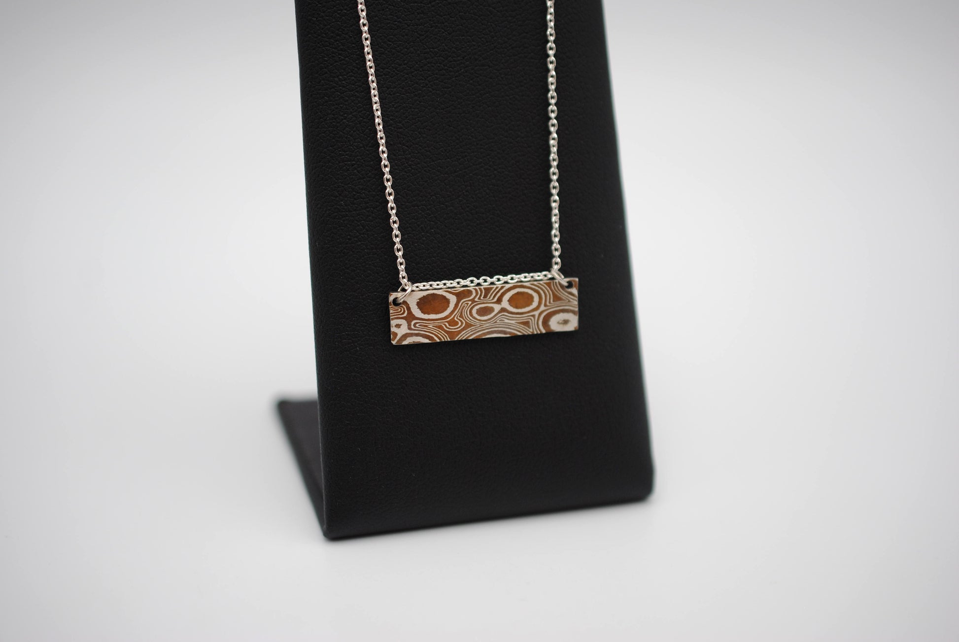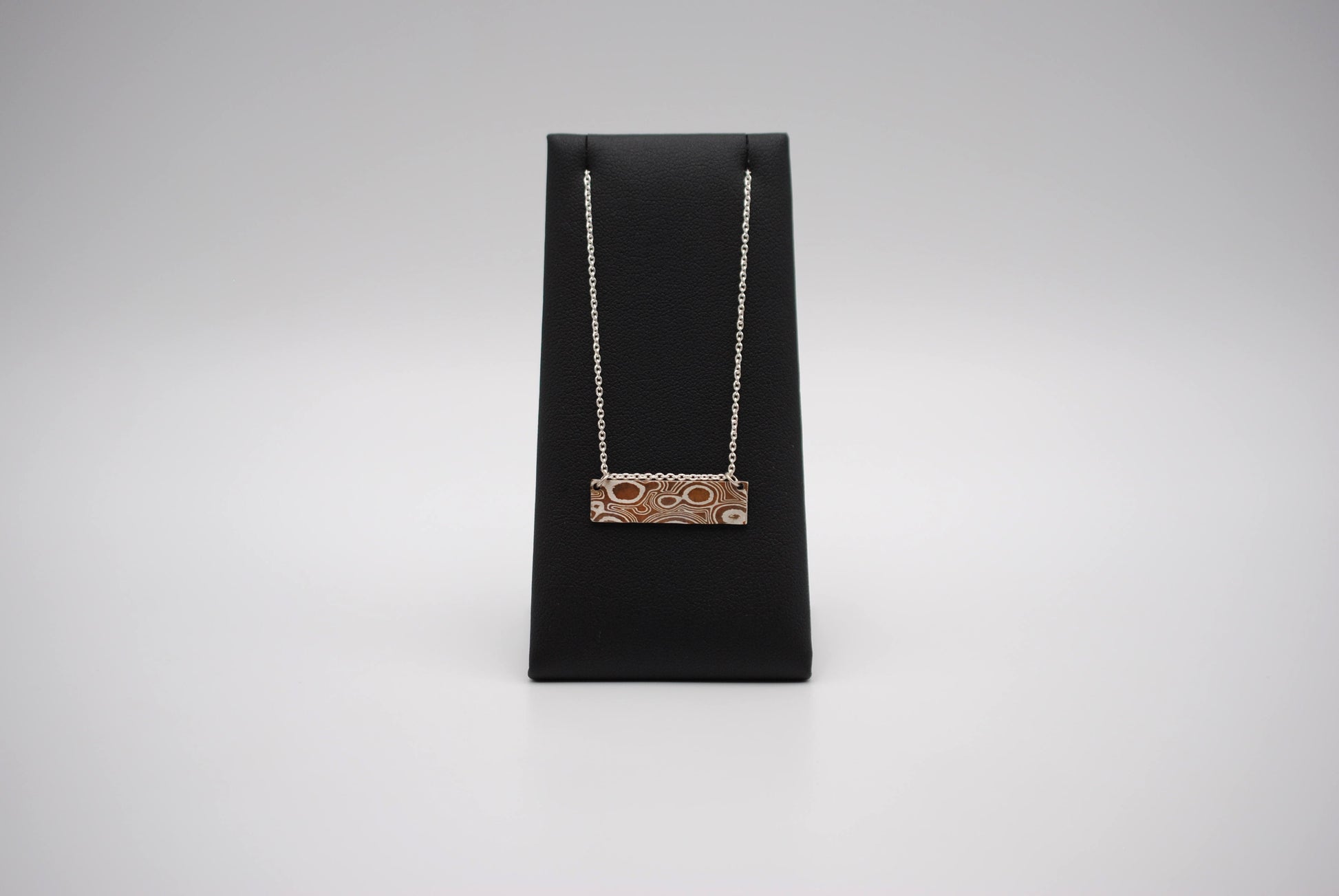 This is our Mokume Gane Bar Necklace: Silver and Copper, Cable Chain. This is a perfect necklace for wood lovers.