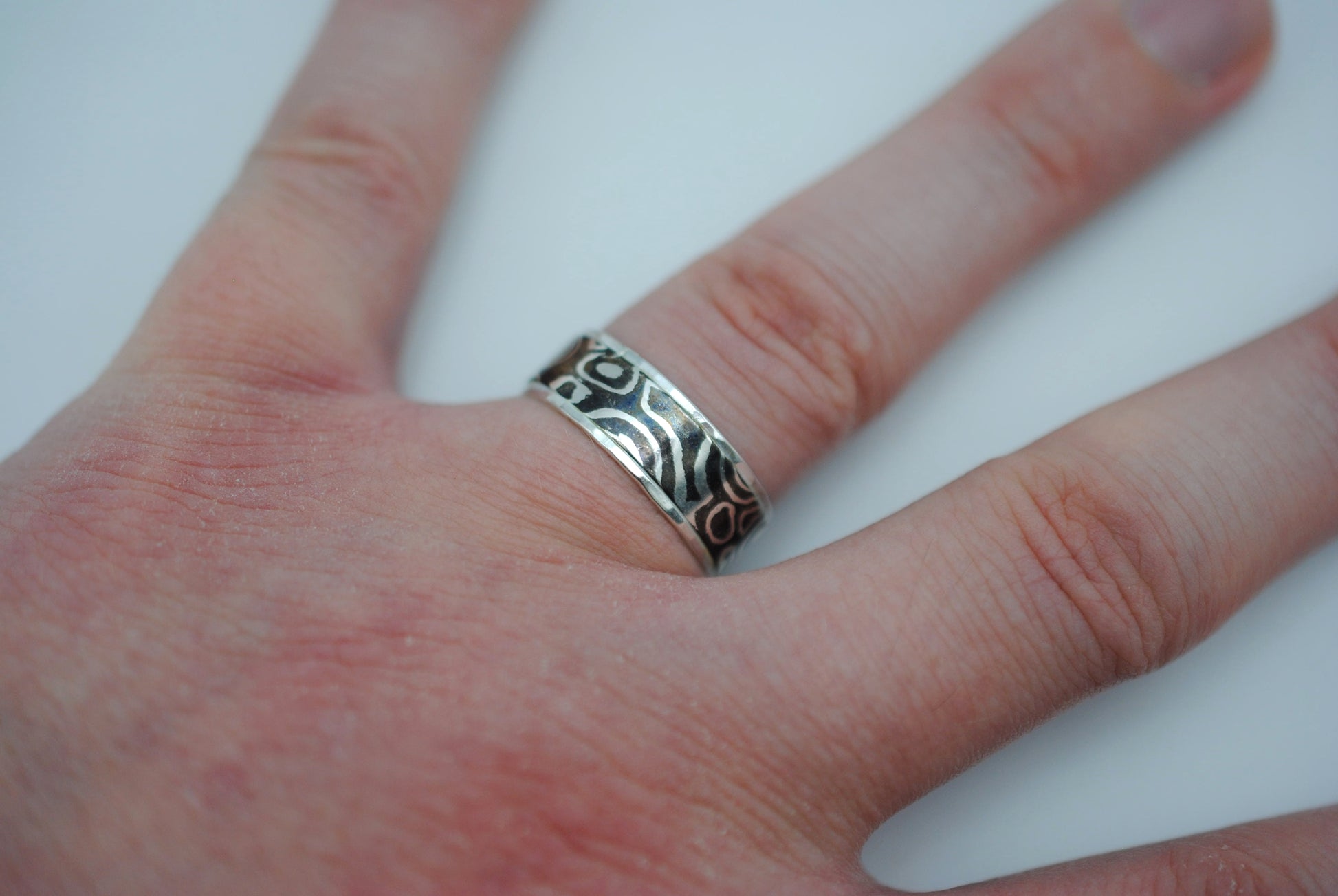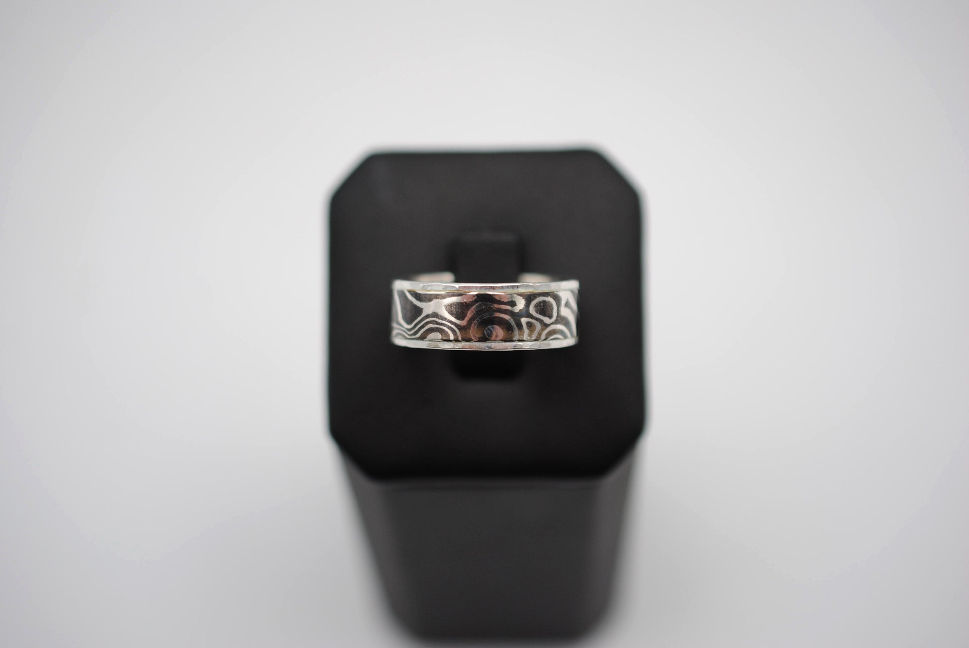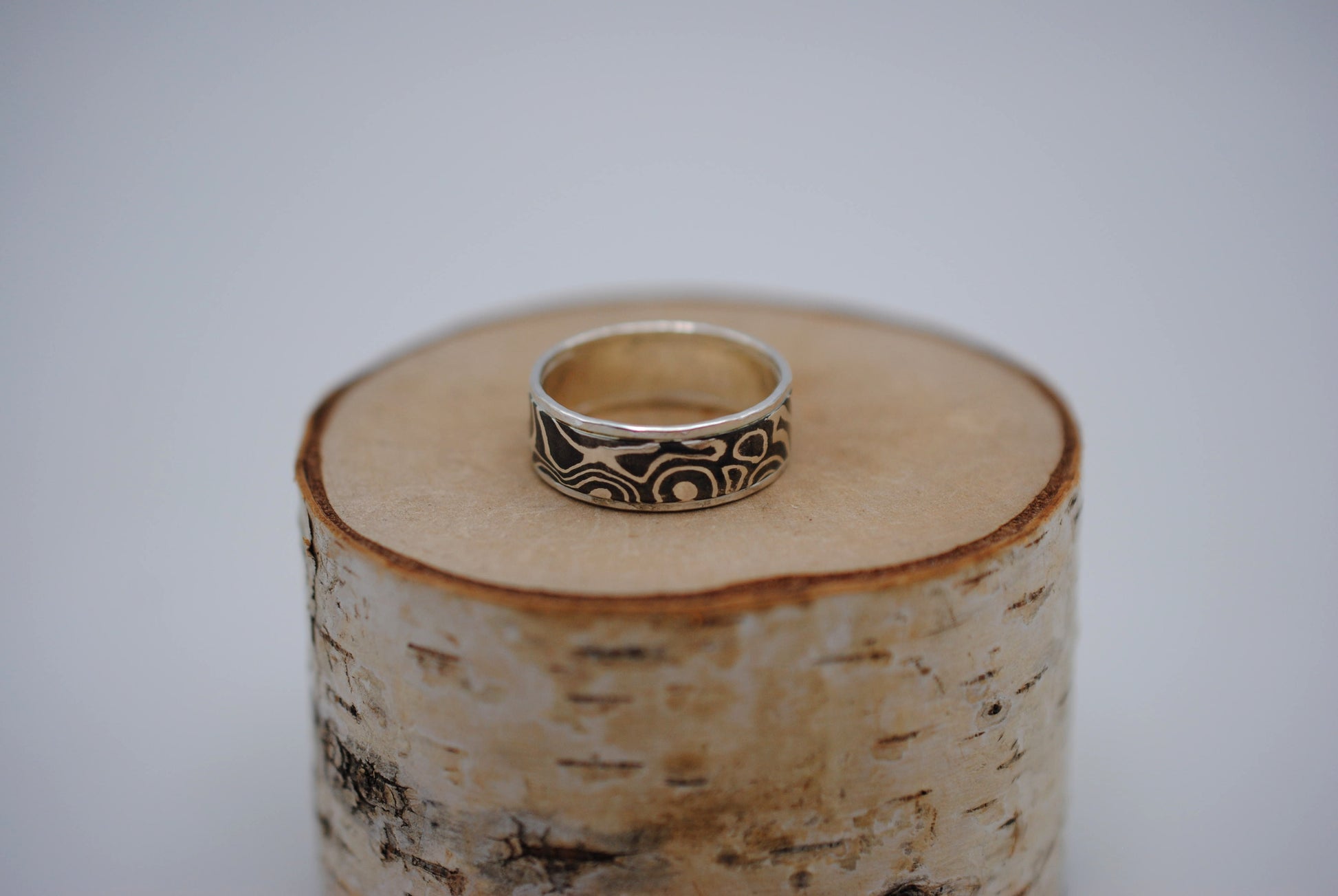 This mokume gane is made with two different metal alloys: silver and shibuichi. The ring is patina-ed which gives it luster.