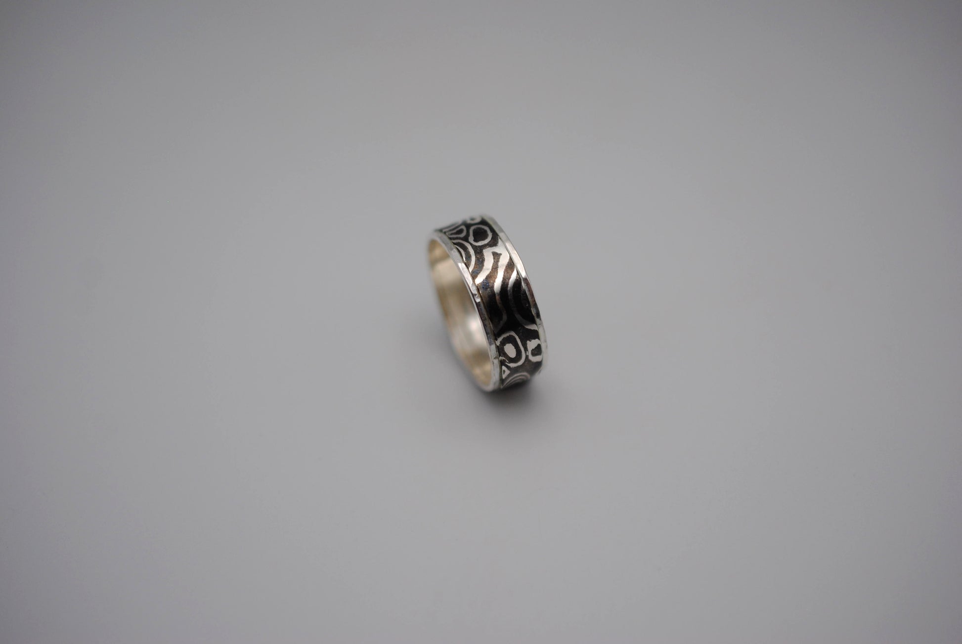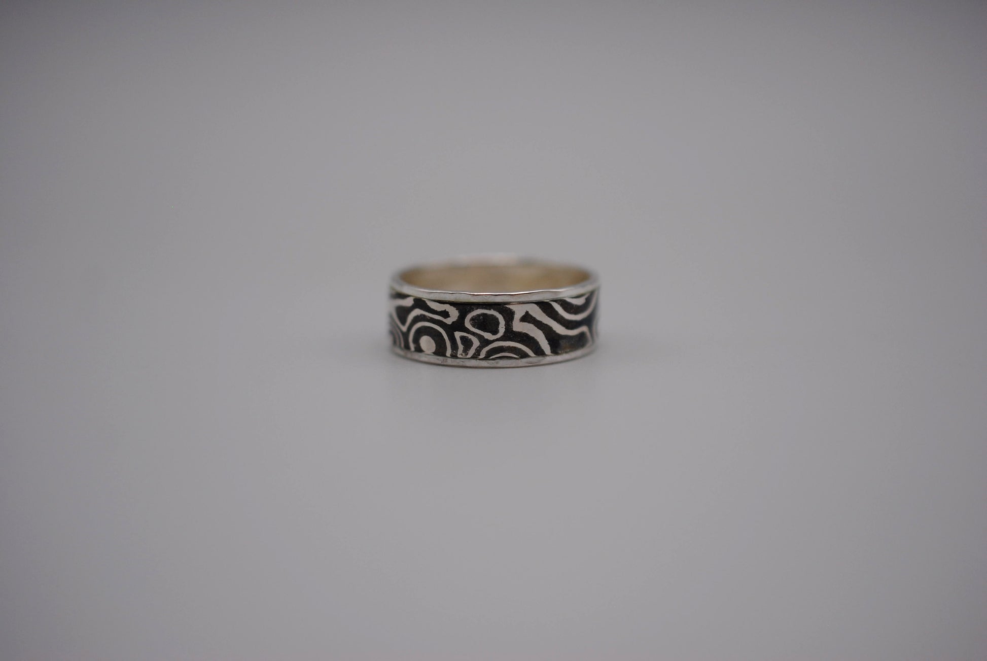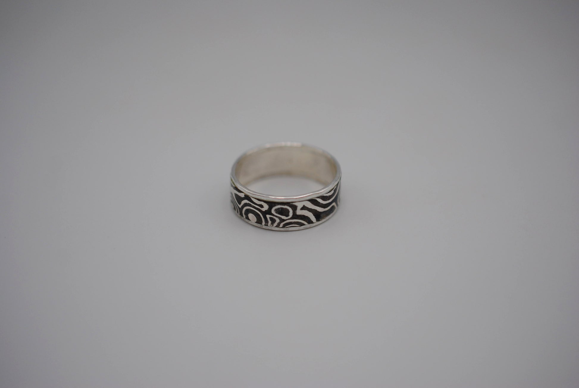 This mokume gane is made with two different metal alloys: silver and shibuichi. The ring is patina-ed which gives it luster.