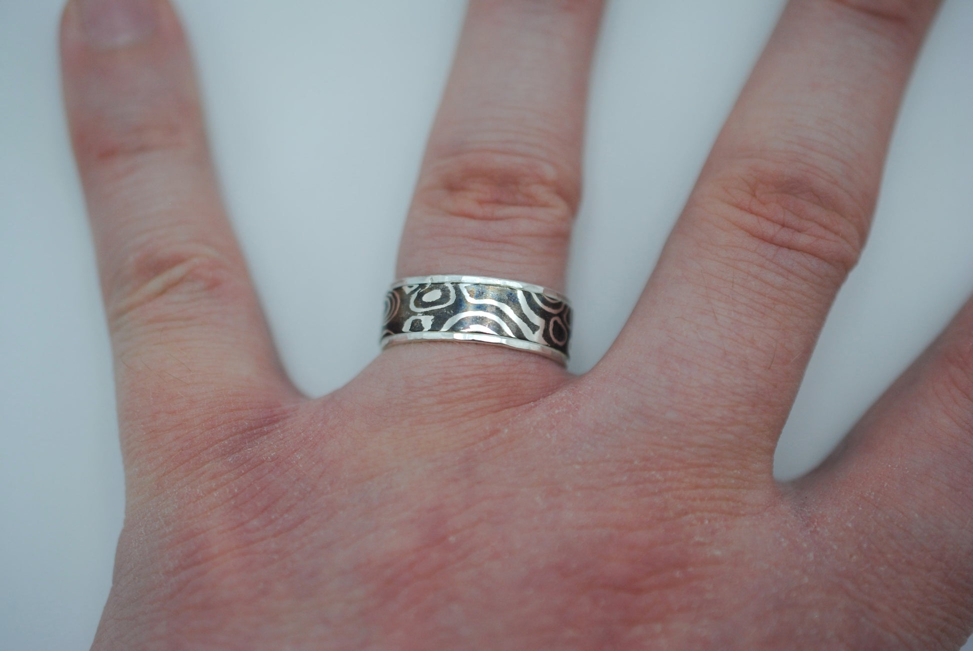 Mokume Gane Ring Band: Silver and Shibuichi, Silver Hammered Banding, Thin Width