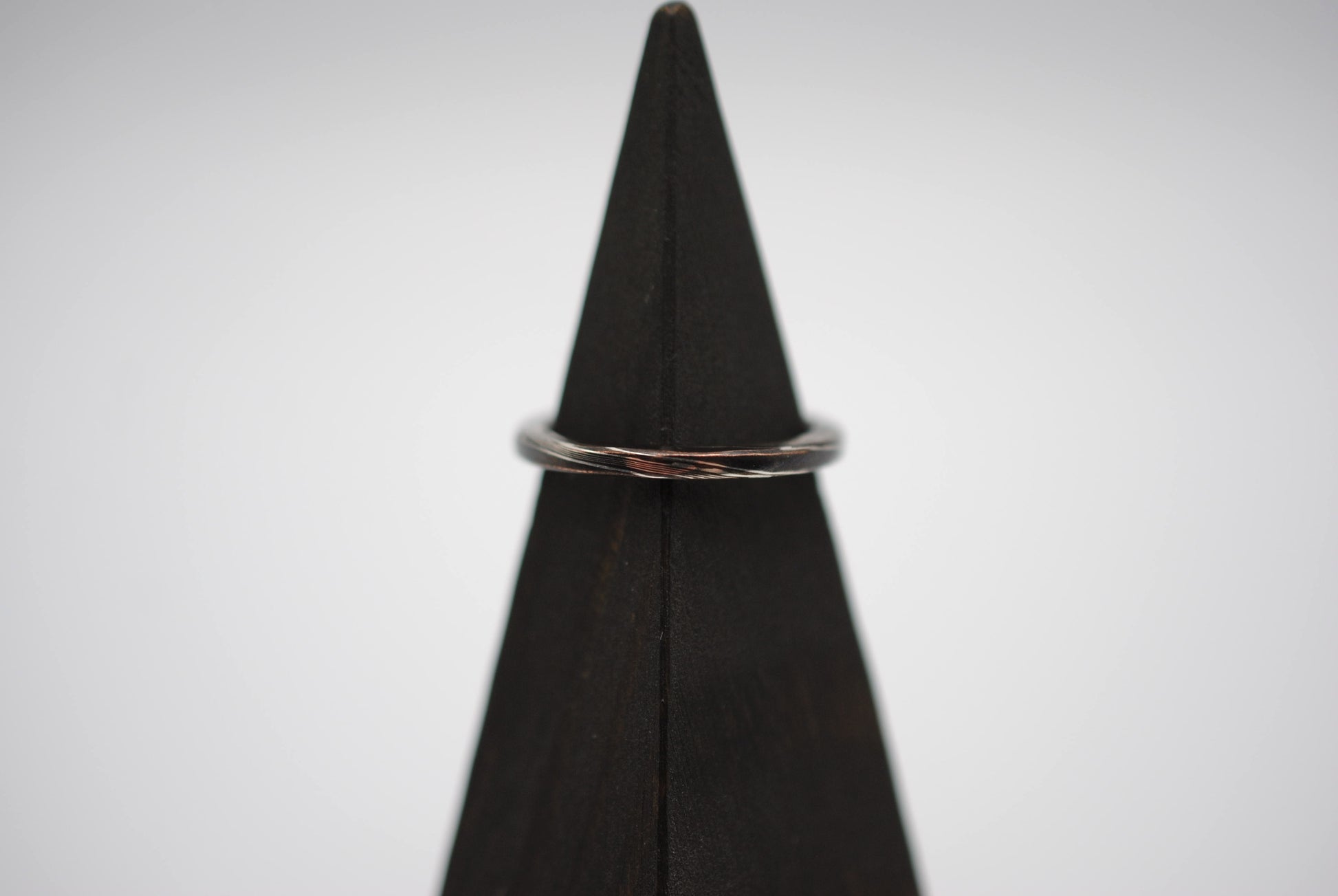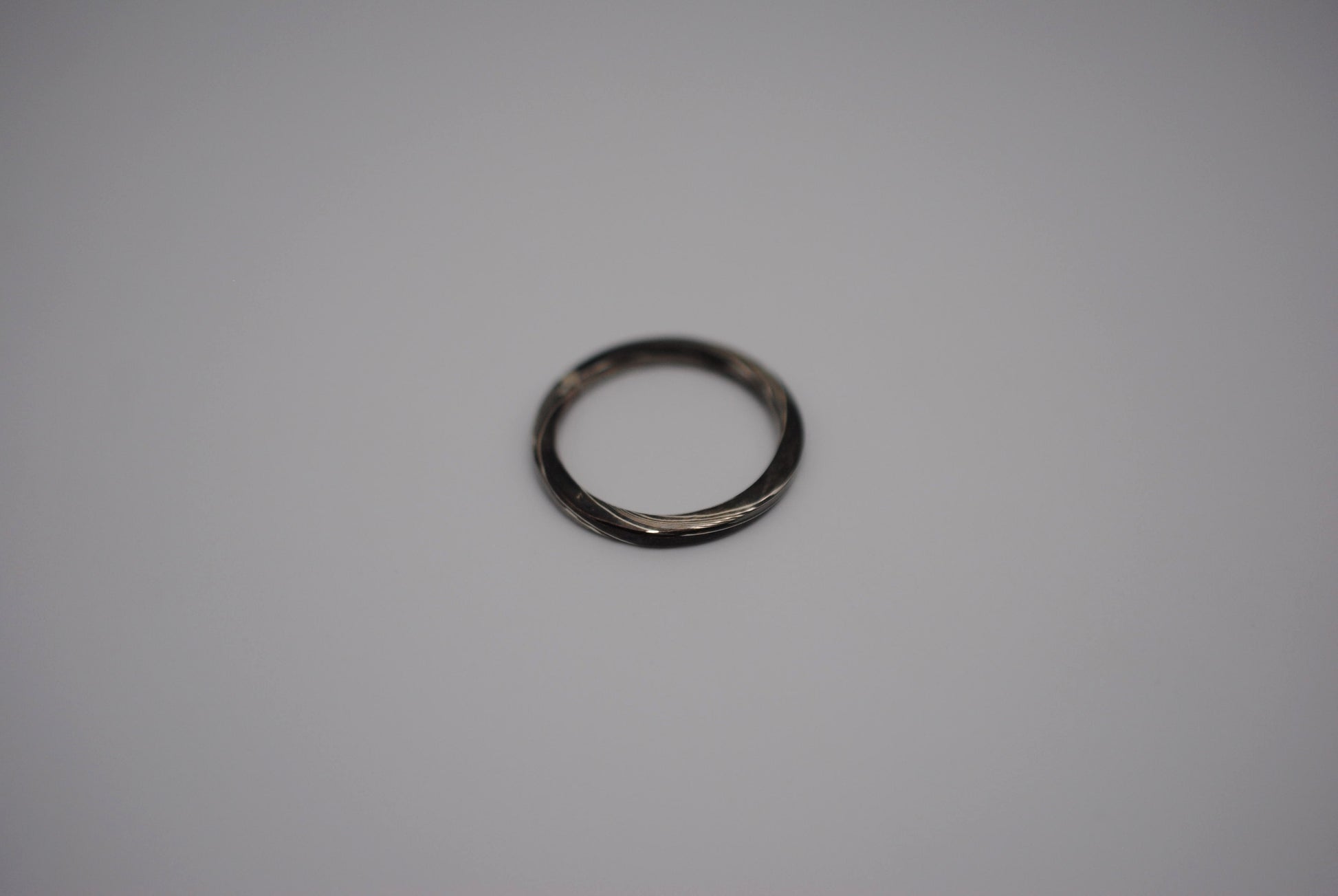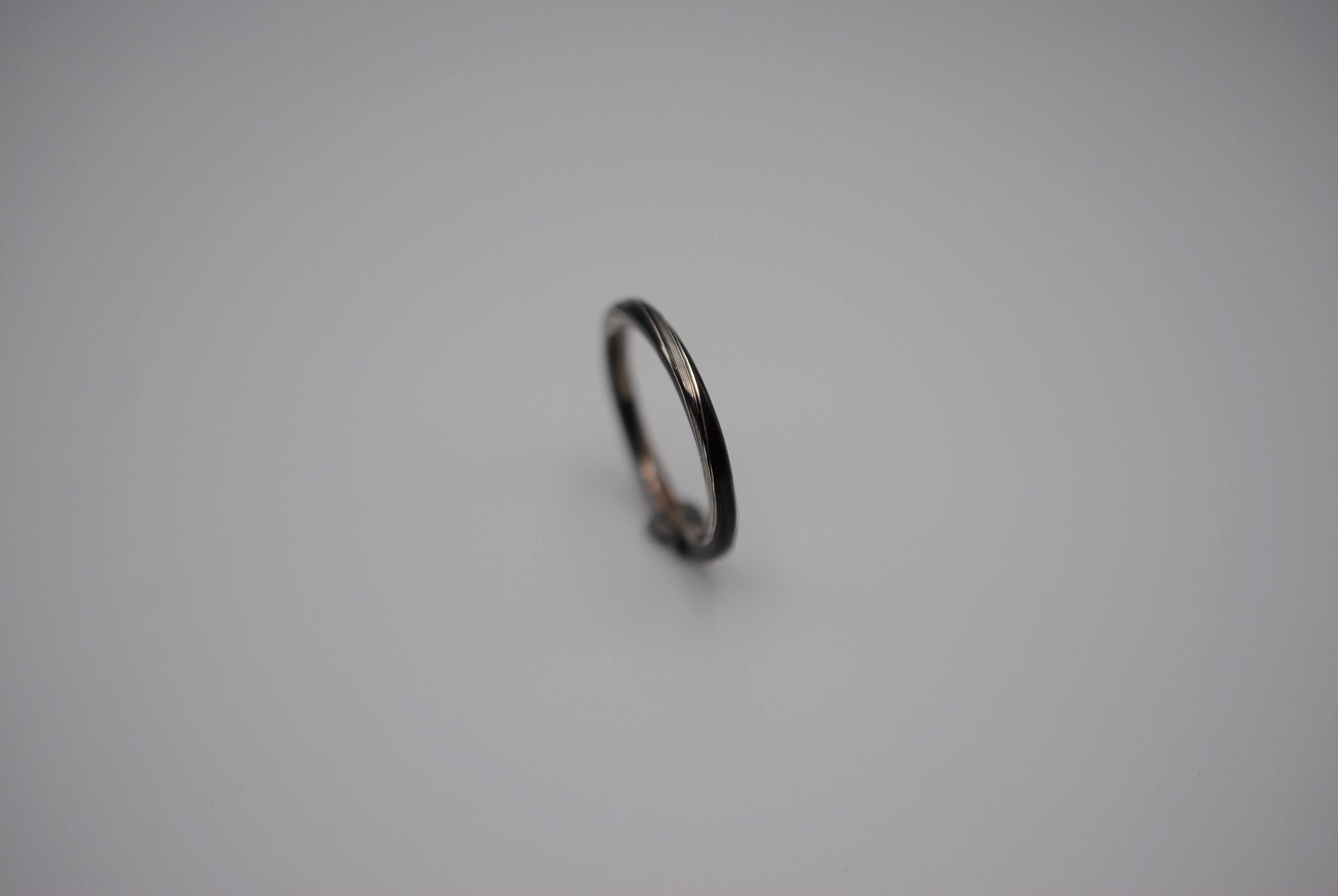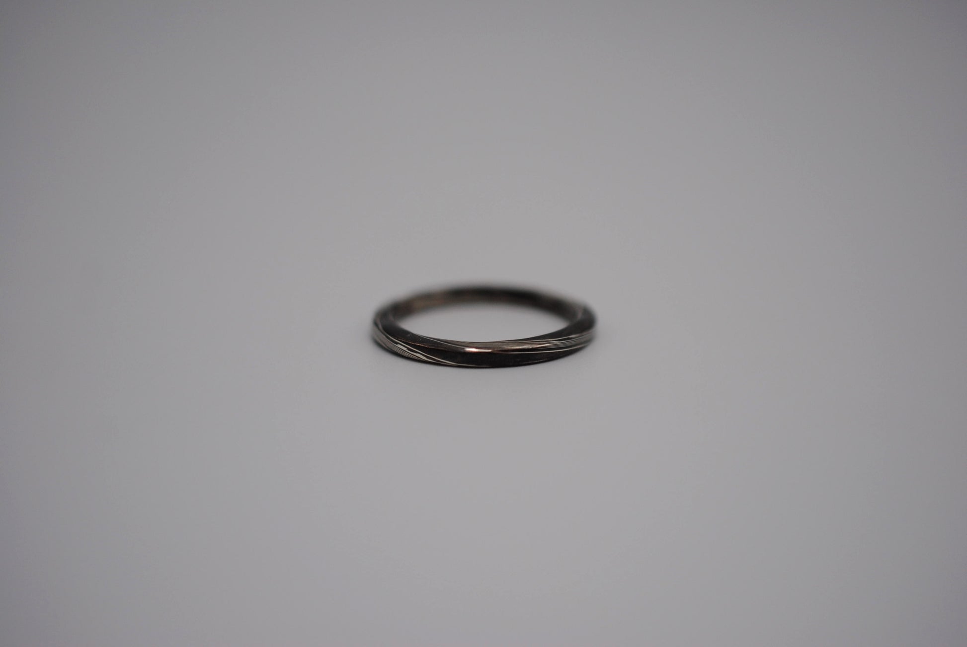 This is our Mokume Gane Ring Band: Silver and Shibuichi, Twist Pattern, Thin Width.