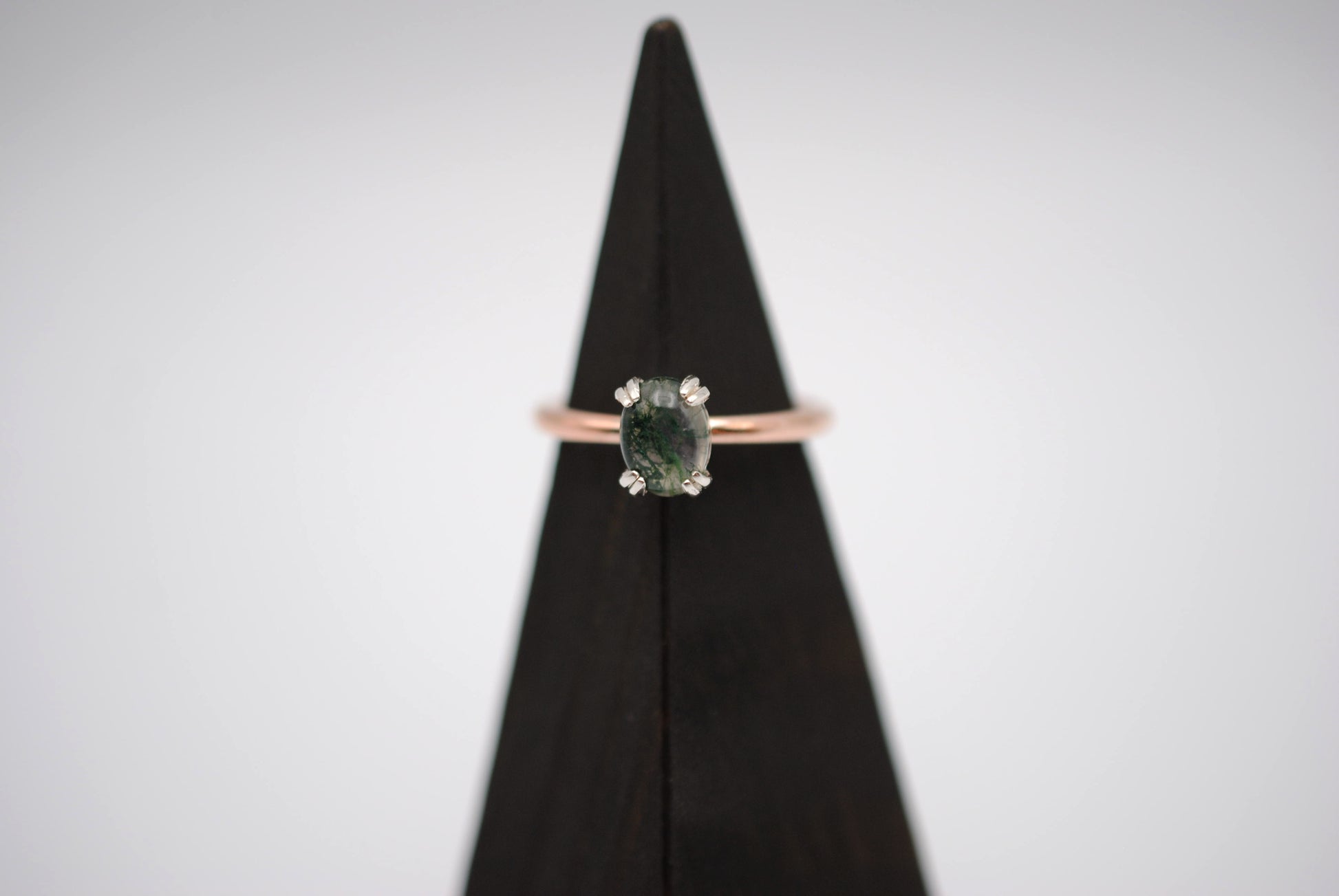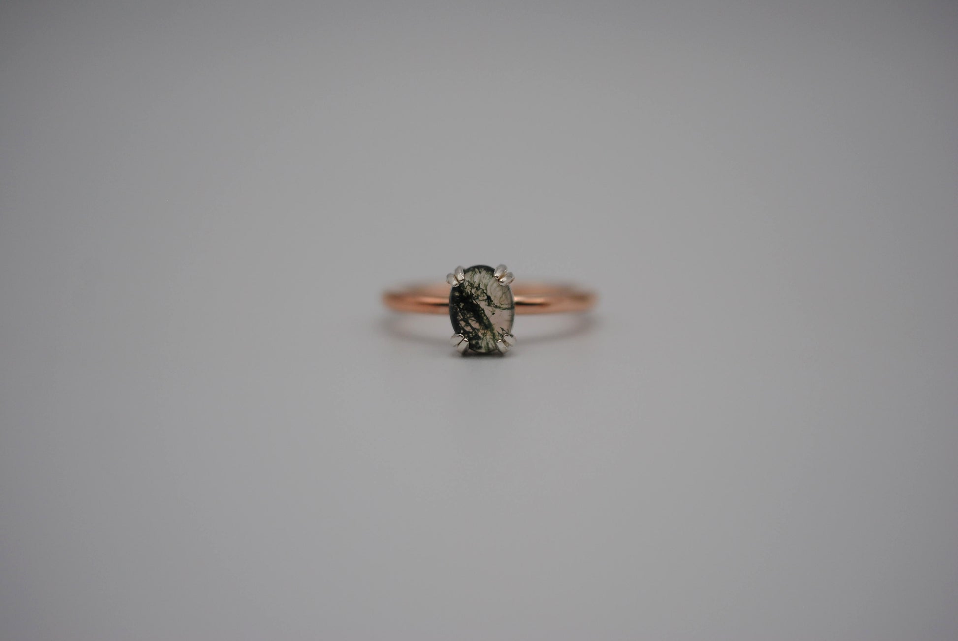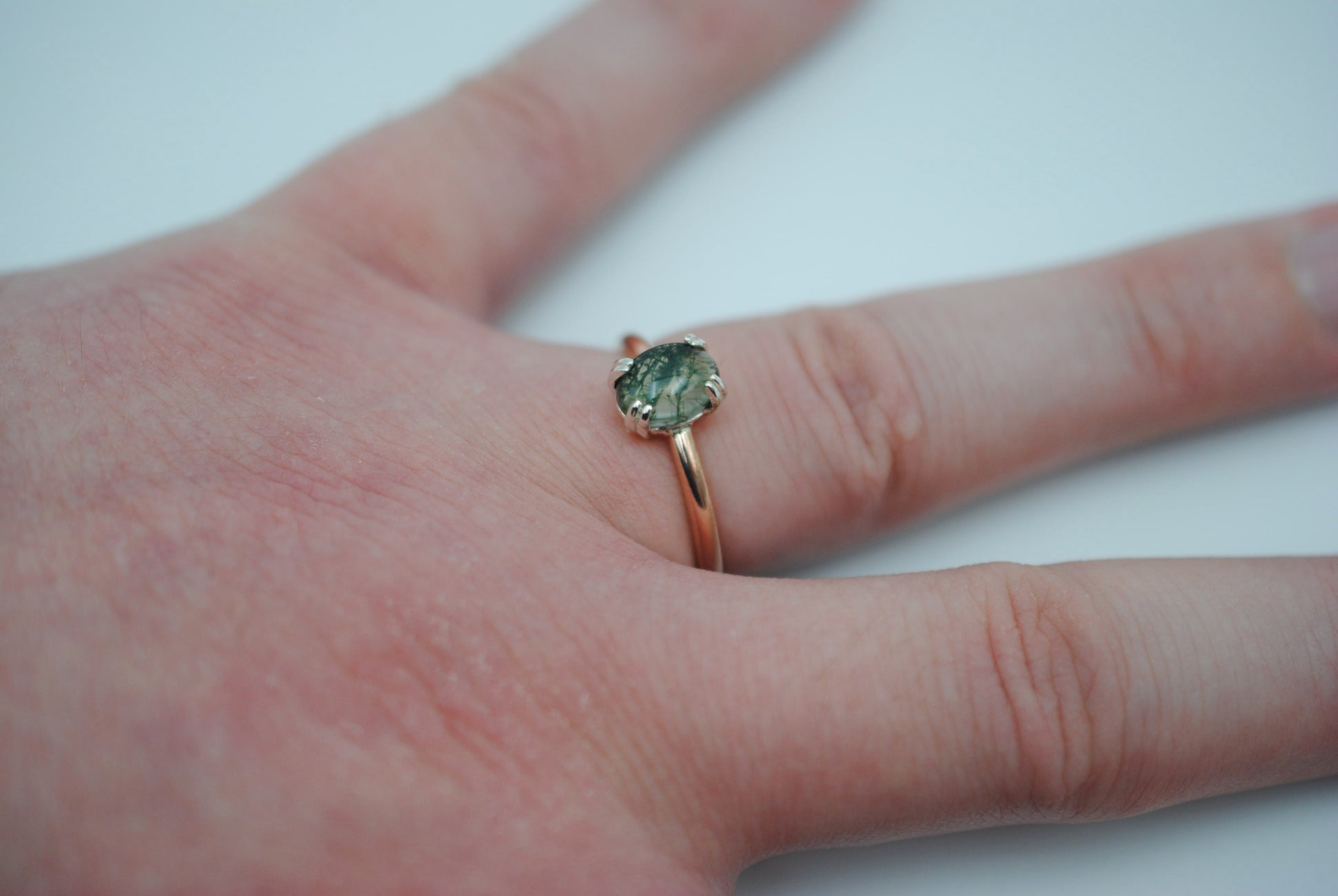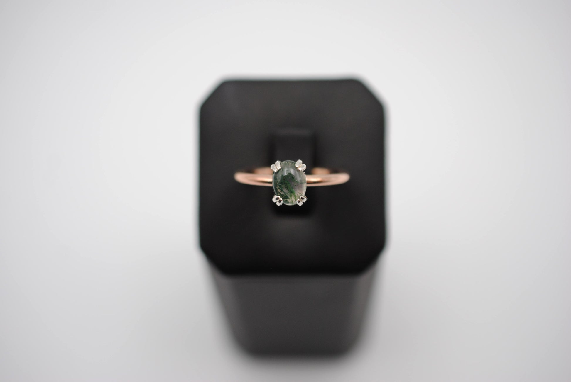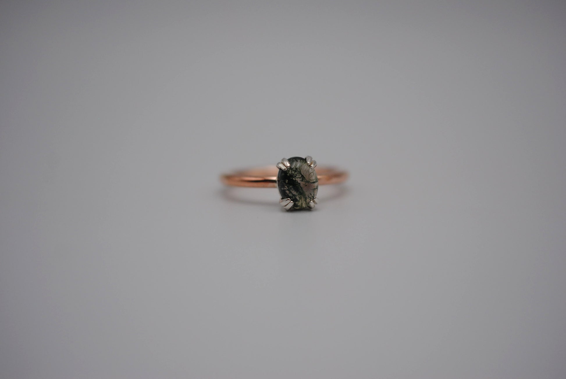 This is our Moss Agate Ring: Oval Cut, Rose Gold Fill Band, Silver Double Prong Setting.